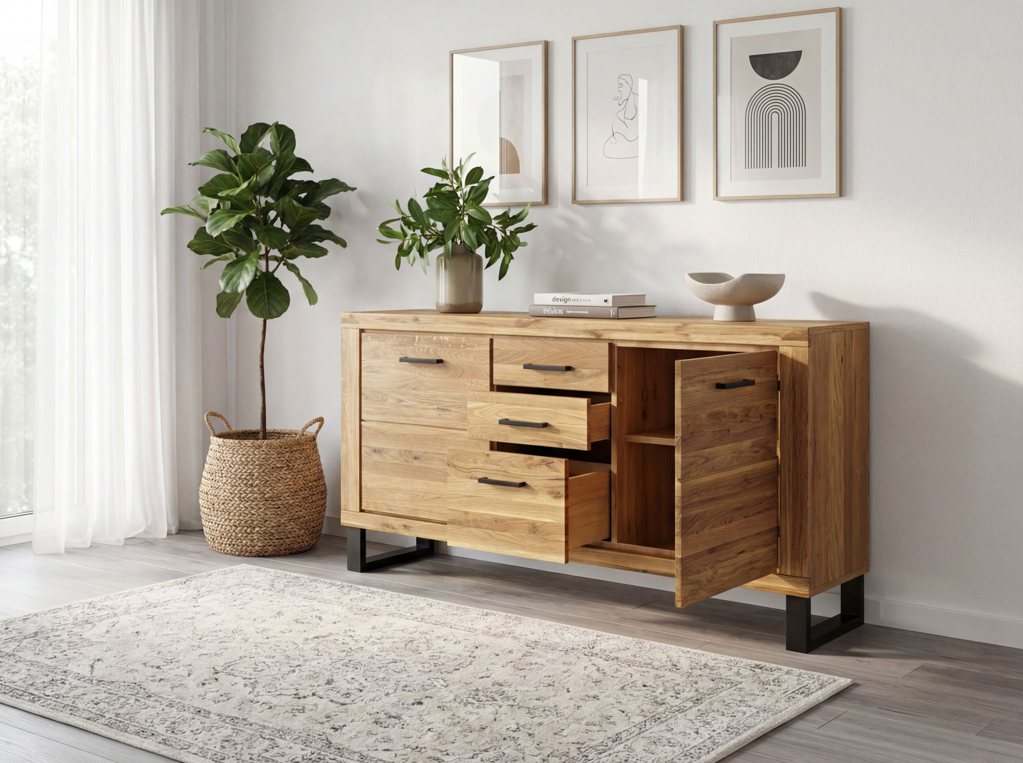 Suchen Sie eine praktische Kommode, die modernes Design mit viel Stauraum verbindet? Wir stellen Ihnen die Eichenkommode Martina vor, die zu einem stilvollen Accessoire in Ihrem Schlafzimmer oder Wohnzimmer wird. Die Kommode ist für Liebhaber minimalistischer Einrichtungen konzipiert, die das natürliche und klare Erscheinungsbild von Holz schätzen. Die Vorderseite besteht aus massivem Eichenholz, behandelt mit naturöl, das die Holzmaserung hervorhebt und dem Möbelstück einen authentischen Charakter verleiht. Die Kommode bietet eine praktische Stauraumlösung – auf der linken und rechten Seite befinden sich Türchen und in der Mitte sind Schubladen mit Soft-Close-System für geräuschloses Schließen angebracht.