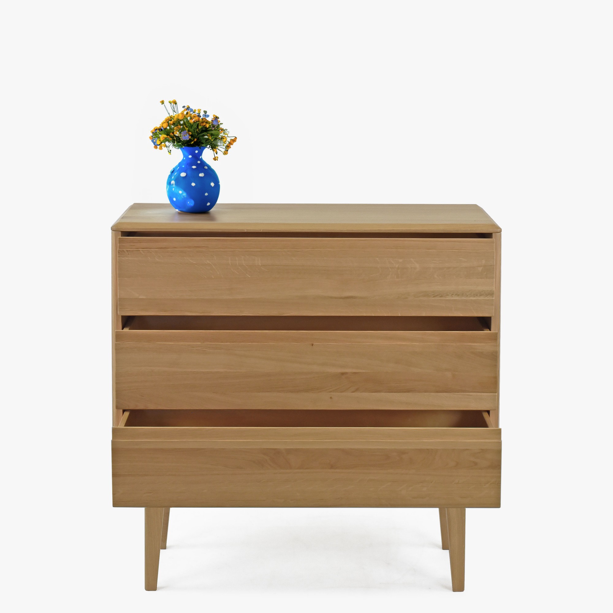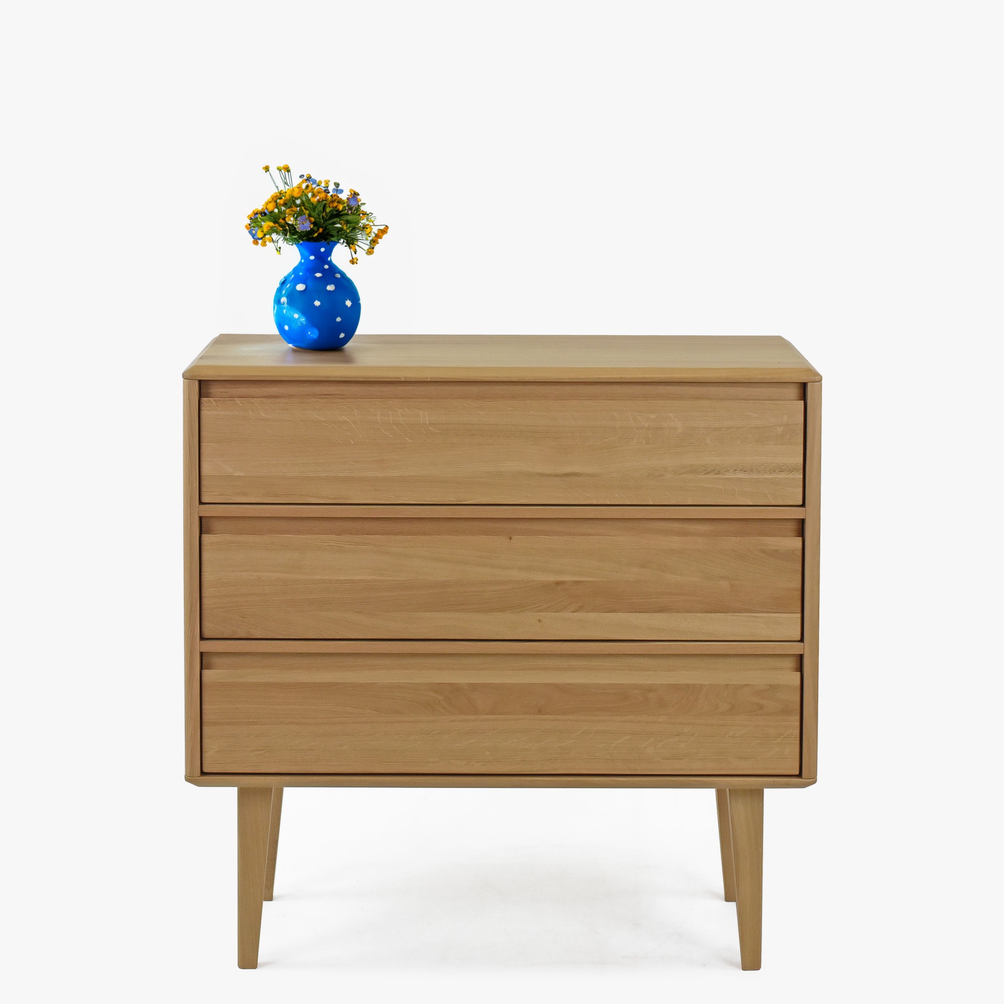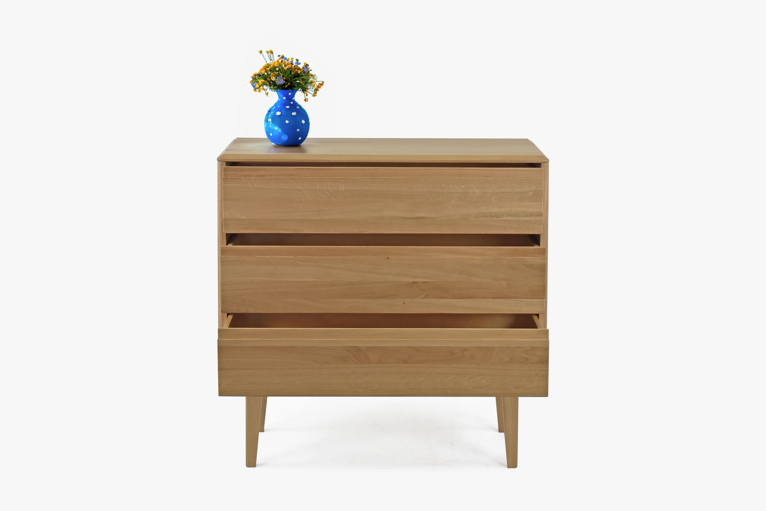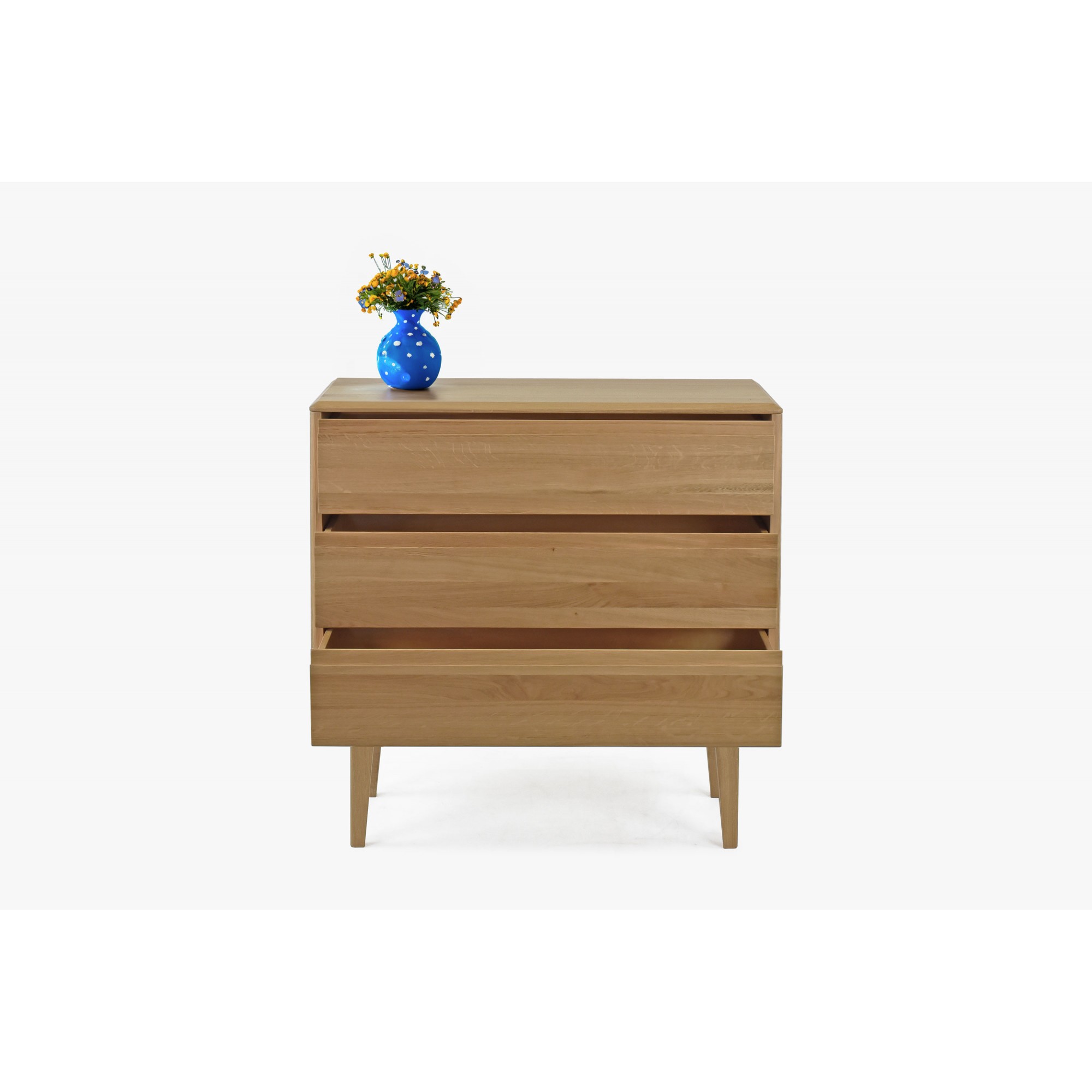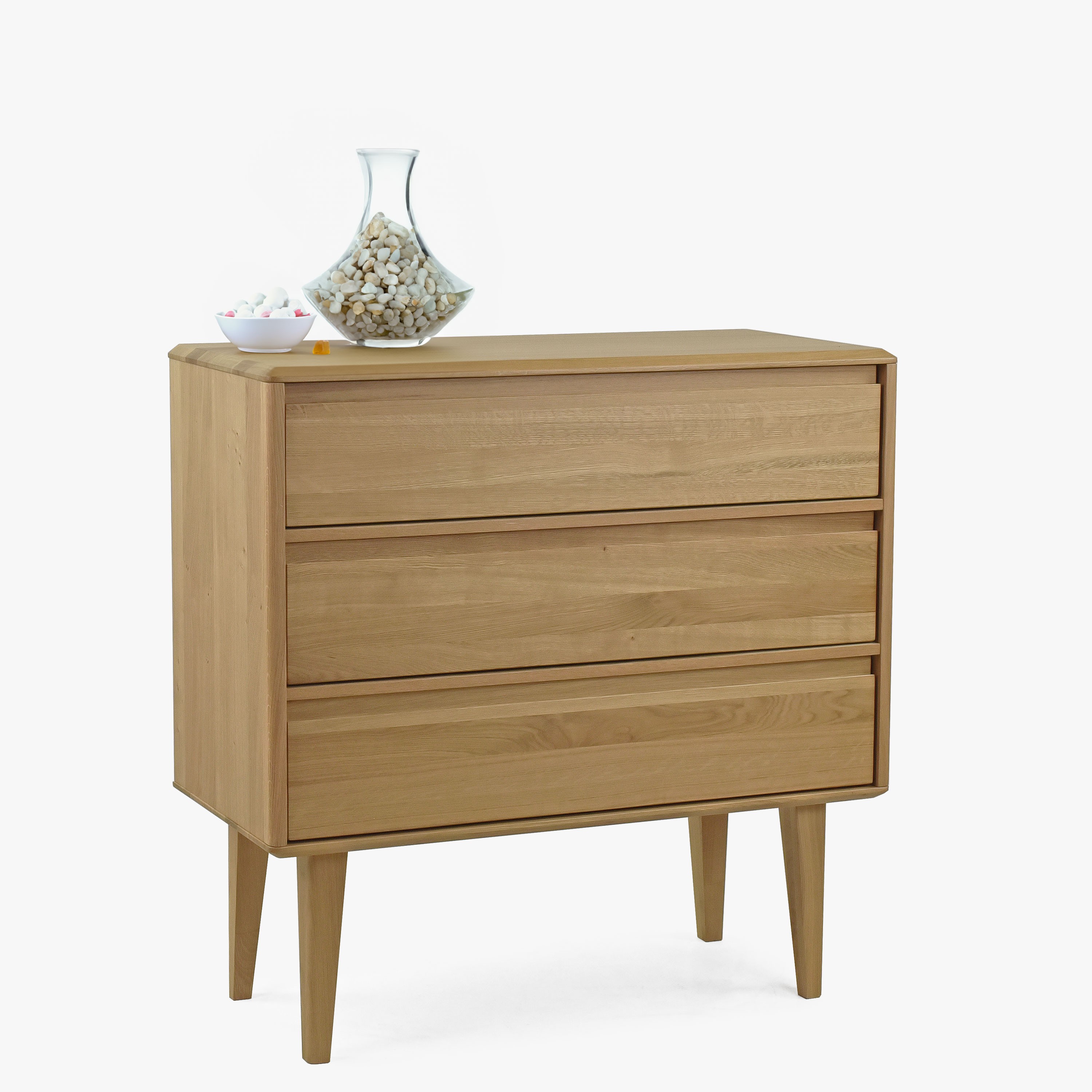 Die Love-Kommode ist ein elegantes und raffiniertes Möbelstück, das nicht nur Ihre täglichen Morgen, sondern auch Ihre abendlichen Entspannungsmomente begleiten wird. Die Love-Kommode ist ein Synonym für ausgezeichnete Qualität und großartiges Design. Ihr natürlicher Eichenfarbton verleiht Ihrem Zuhause ein warmes, natürliches Aussehen und strahlt gleichzeitig modernen skandinavischen Stil aus. Egal, ob Sie Möbel für das Schlafzimmer, das Wohnzimmer oder das Büro suchen, diese Kommode ist ideal für jeden Raum. Die hohe Schubladenkommode auf Füßen ist aus strapazierfähigem Eichenholz gefertigt, was ihre langfristige Widerstandsfähigkeit und Lebensdauer garantiert. Jede der drei Schubladen ist mit einem Soft-Close-System ausgestattet, das ein leises und sanftes Schließen gewährleistet. Darüber hinaus wird die Kommode komplett montiert geliefert, was Ihnen Zeit spart und die Handhabung erleichtert. Das Ergebnis ist Komfort, Funktionalität und Stil, der in jedes Zuhause passt.