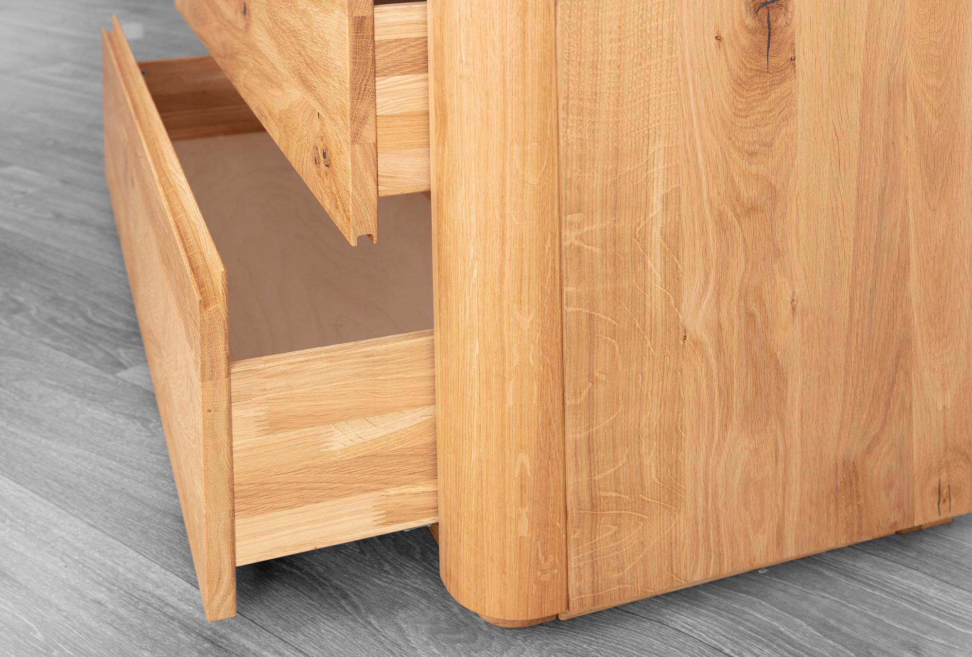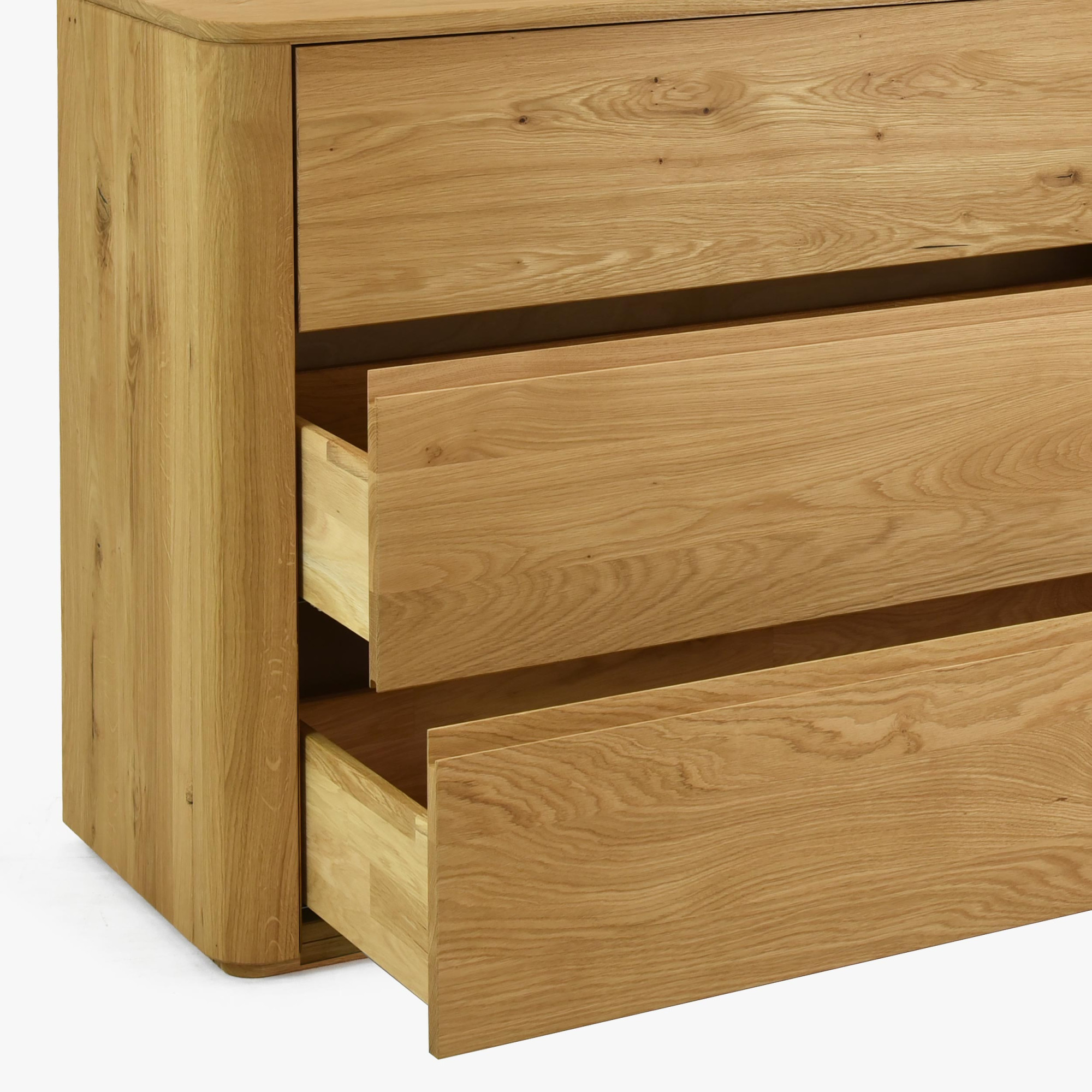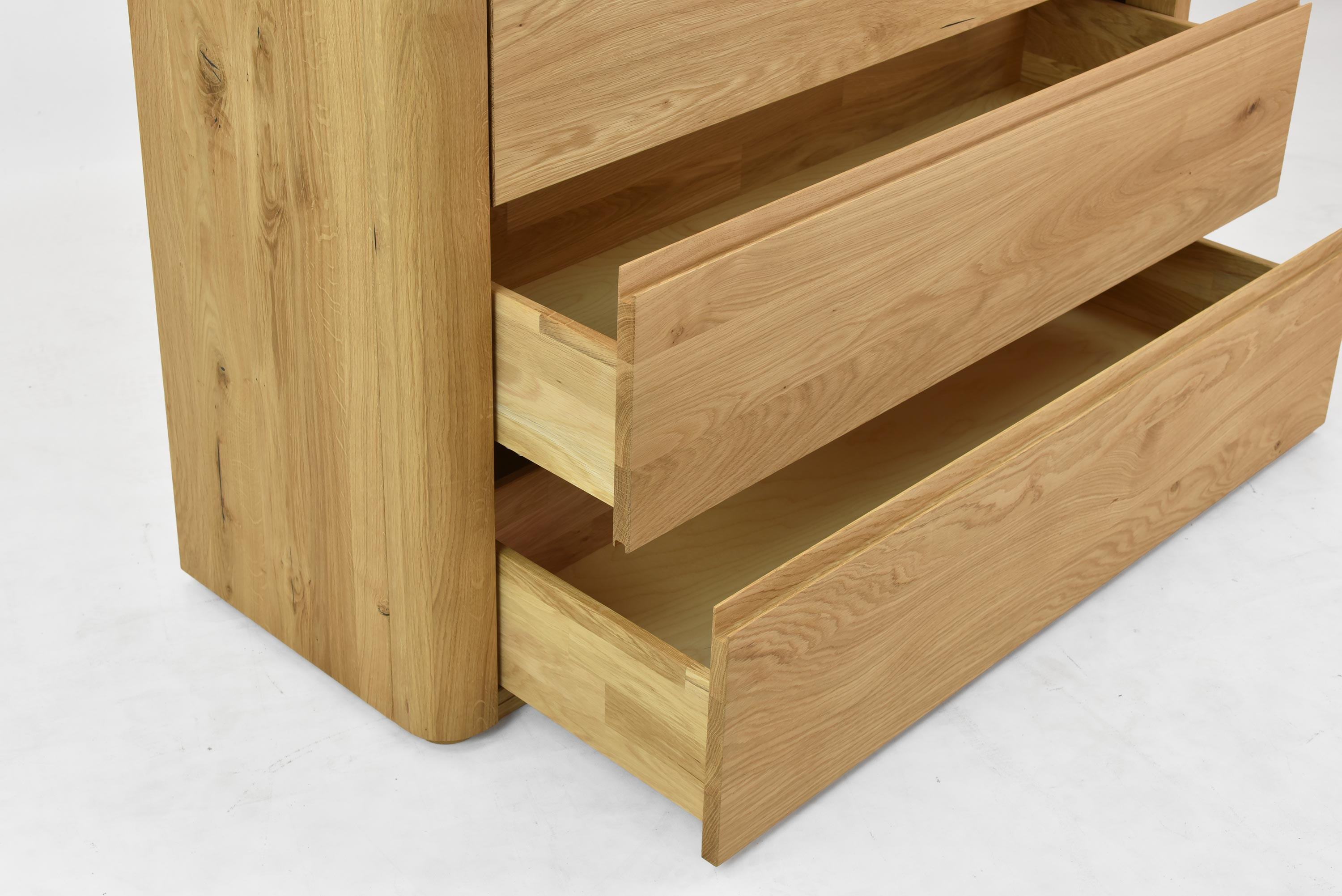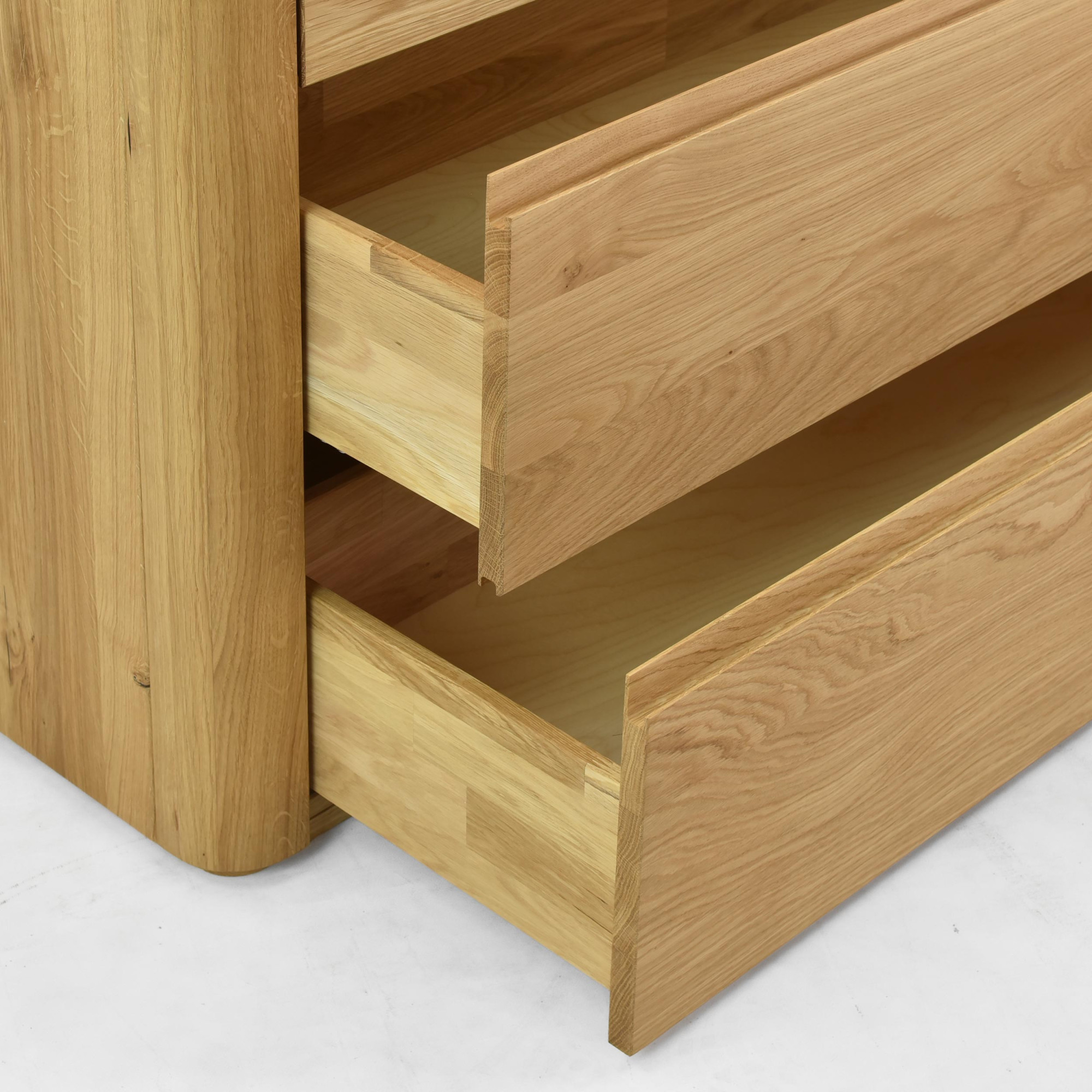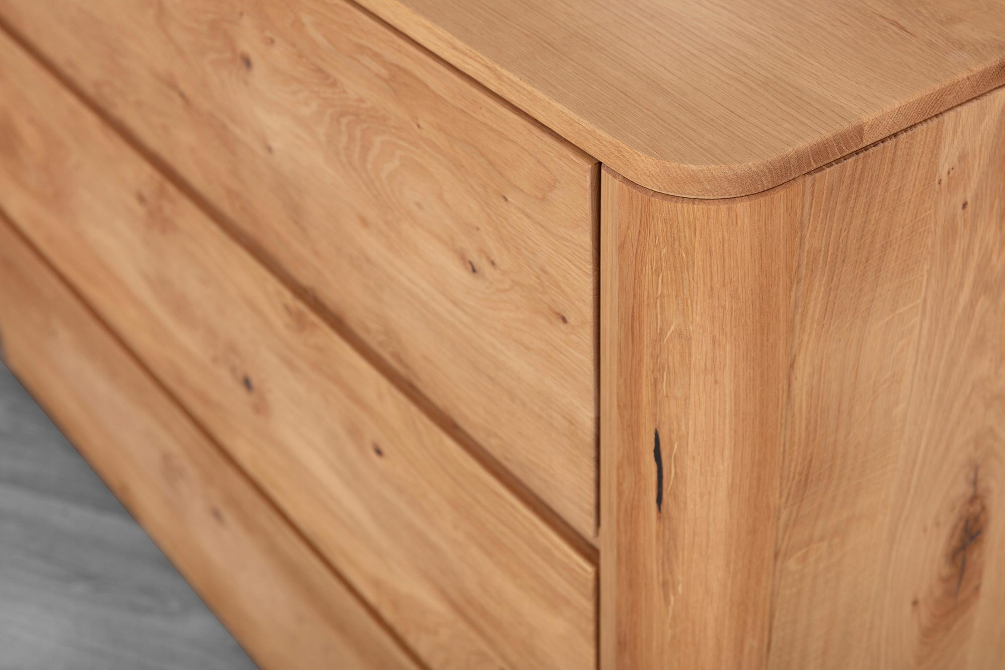Diese Kommode mit Schubladen wird aus zertifiziertem Eichenholz mit FSC-Zertifikat hergestellt, was bedeutet, dass es aus nachhaltig bewirtschafteten Wäldern stammt. Das Holz ist mit natürlichem Öl in der Farbe Eiche natur behandelt, was seine Schönheit betont und gleichzeitig die Oberfläche schützt. Das Design der Kommode ist klar und minimalistisch mit eingravierten Griffen direkt im Holz, was ihren ästhetischen Wert erhöht und die Reinigung erleichtert. Die Vorderseite der Kommode ist abgerundet, was Eleganz und Sicherheit verleiht.