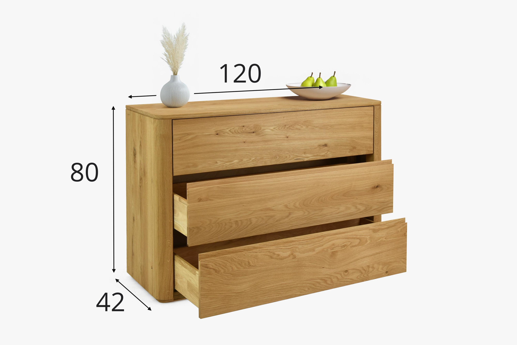 Die Hauptvorteile dieses Produkts sind seine hohe Materialqualität, Beständigkeit und Langlebigkeit. Eichenholz ist bekannt für seine Festigkeit und die Fähigkeit, Abnutzung zu widerstehen, was garantiert, dass Ihre Investition Generationen überdauert. Die Schlafzimmerkommode ist mit Blick auf die Bedürfnisse des modernen Lebens gestaltet und bietet 3 geräumige Schubladen mit Soft-Close-System, das ein leises und sanftes Schließen gewährleistet.