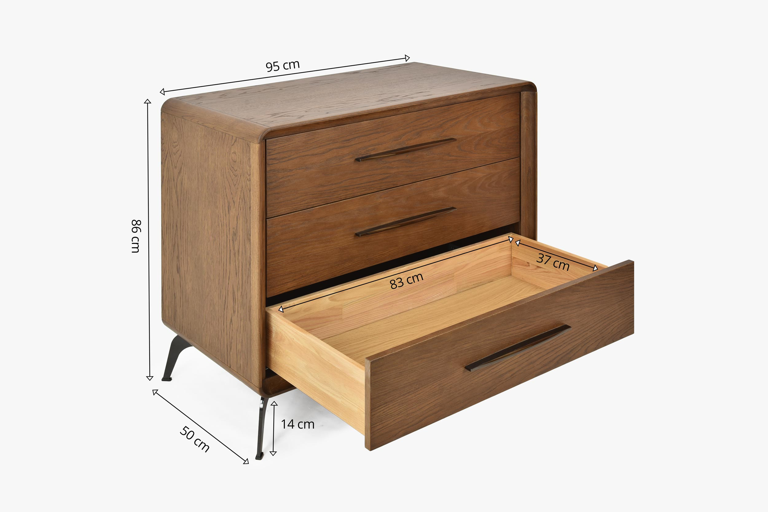 Moderne 3 Schubladenkommode aus der Serie Lisabon stellt die ideale Verbindung von Eleganz und Funktionalität dar. Dieses Möbelstück, gefertigt aus hochwertigem Eichenholz und Eichenfurnier, ist in einem modernen Nussbaumfarbton gehalten, der jedem Raum eine warme und einladende Atmosphäre verleiht. Dank der Verwendung von erstklassigen deutschen BLUM-Beschlägen bietet jede Schublade einen vollausziehbaren, sanften Soft-Close-Verschluss, was den Bedienkomfort erhöht.