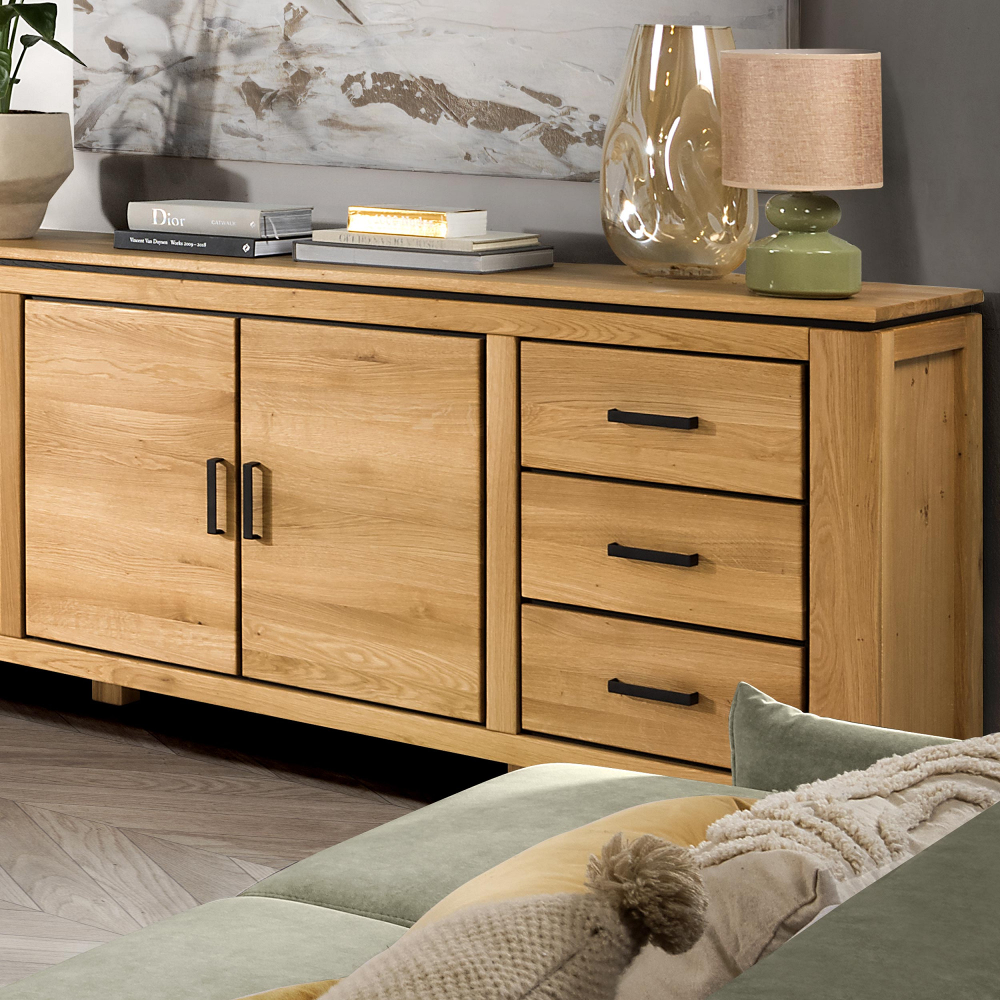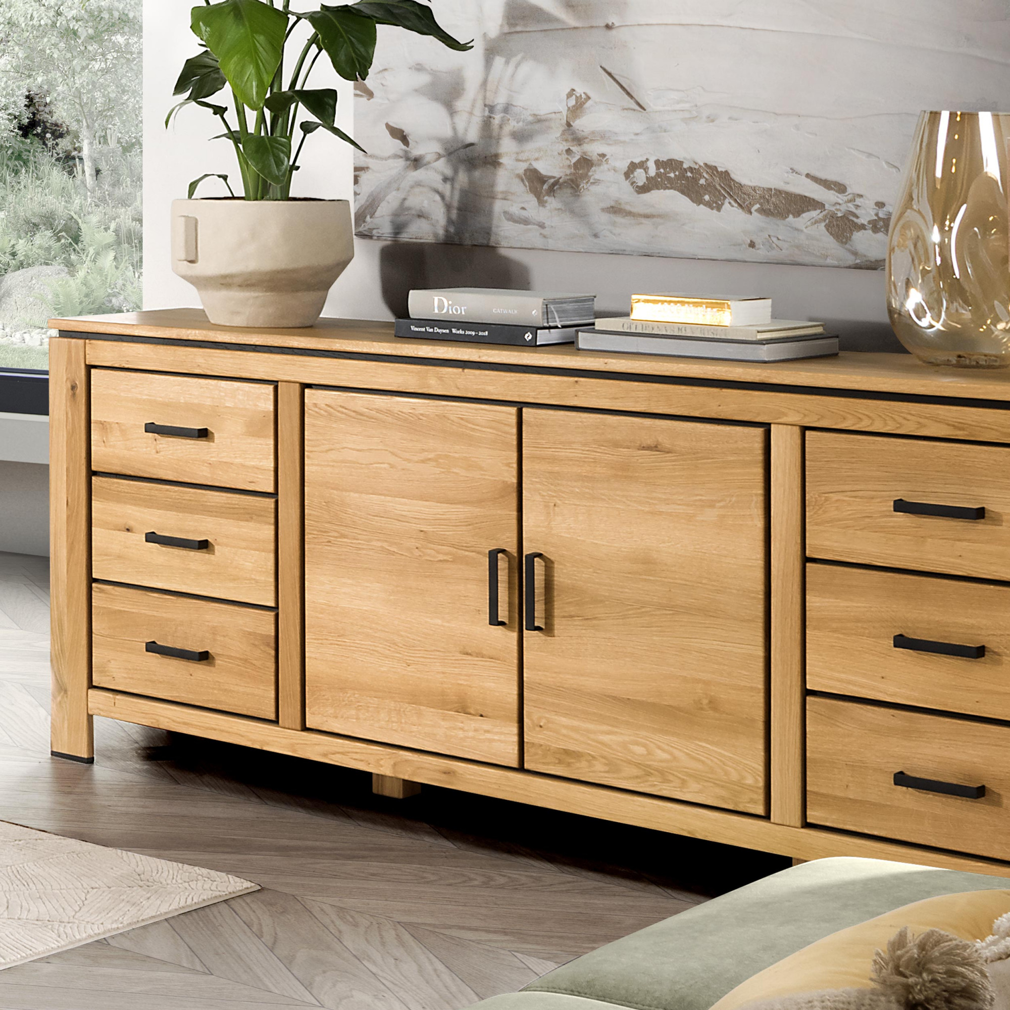 Diese elegante lange Eichenkommode mit schwarzen Griffen stellt die ideale Kombination aus traditioneller Handwerkskunst und modernem Design dar. Sie ist aus hochwertigem Eichenholz gefertigt und mit natürlicher Eichenfurnier ergänzt, was ihre Einzigartigkeit und Langlebigkeit garantiert. Die Oberfläche der Kommode ist mit hochwertigem deutschem Livos-Öl behandelt, das das Holz schützt und gleichzeitig seine natürliche Struktur und Farbe hervorhebt. Alle Türen und Schubladen sind mit einem Soft-Close-System für ein sanftes und geräuschloses Schließen ausgestattet, was den Komfort in der Nutzung erhöht. Die Kommode verfügt über Seitenschubladen und in der mittleren Partie zwei Türen, was reichlich Stauraum für all Ihre Bedürfnisse bietet. Sie wird vormontiert geliefert, was Ihnen Zeit und Mühe beim Aufbau spart. Die schwarzen matten Metallgriffe verleihen der Kommode ein modernes und stilvolles Aussehen, was ihre einfache Integration in verschiedene Einrichtungsstile ermöglicht, sei es im Schlafzimmer oder Wohnzimmer.