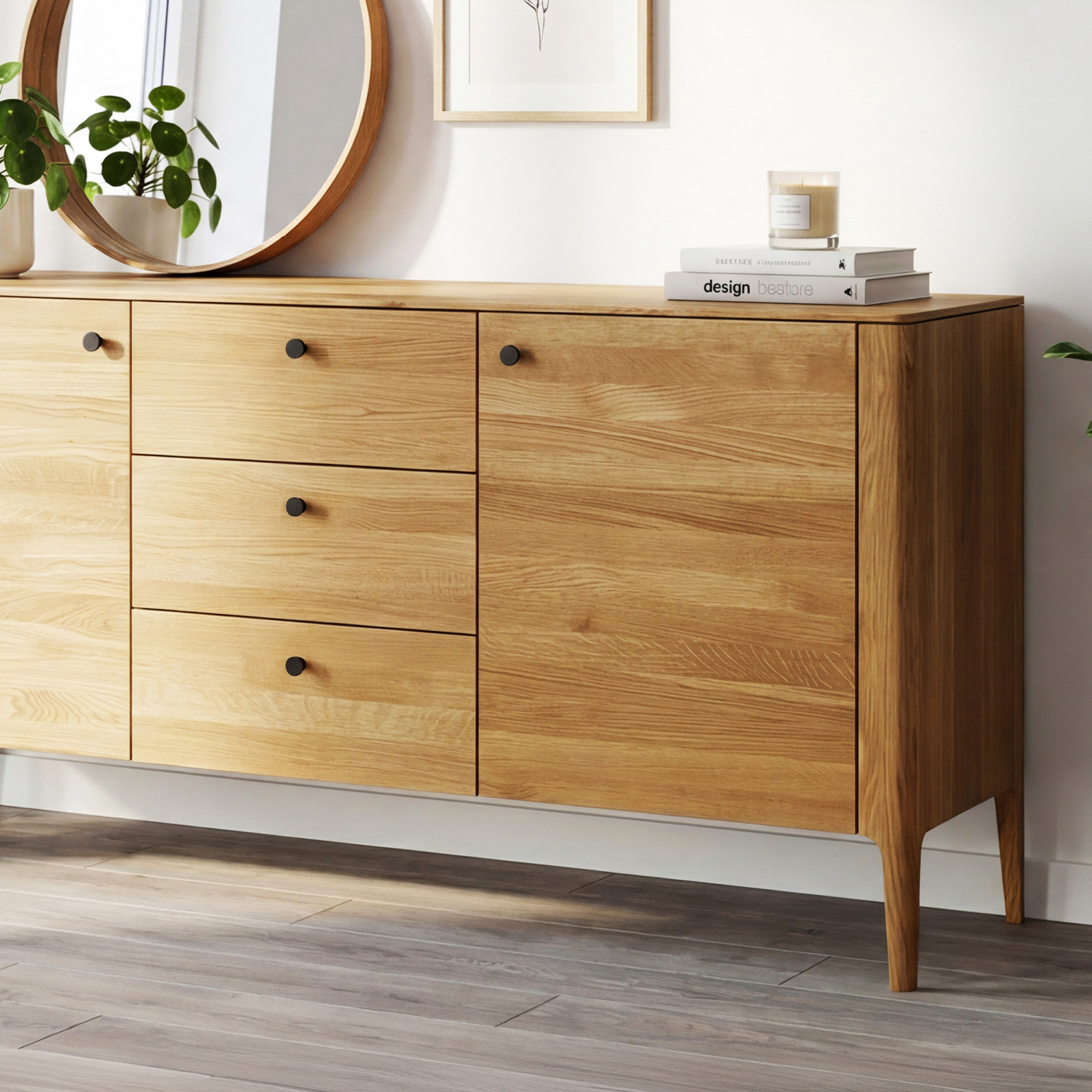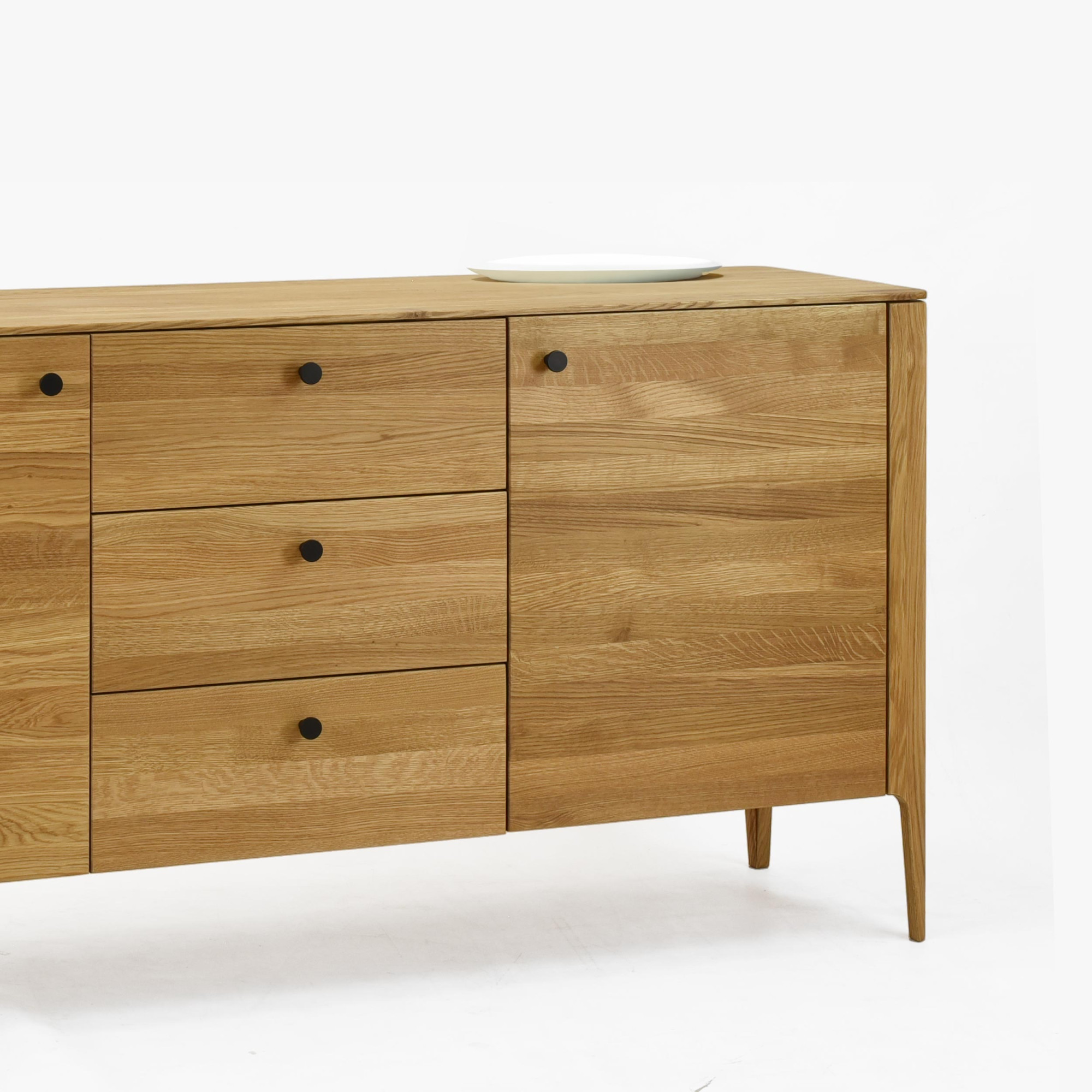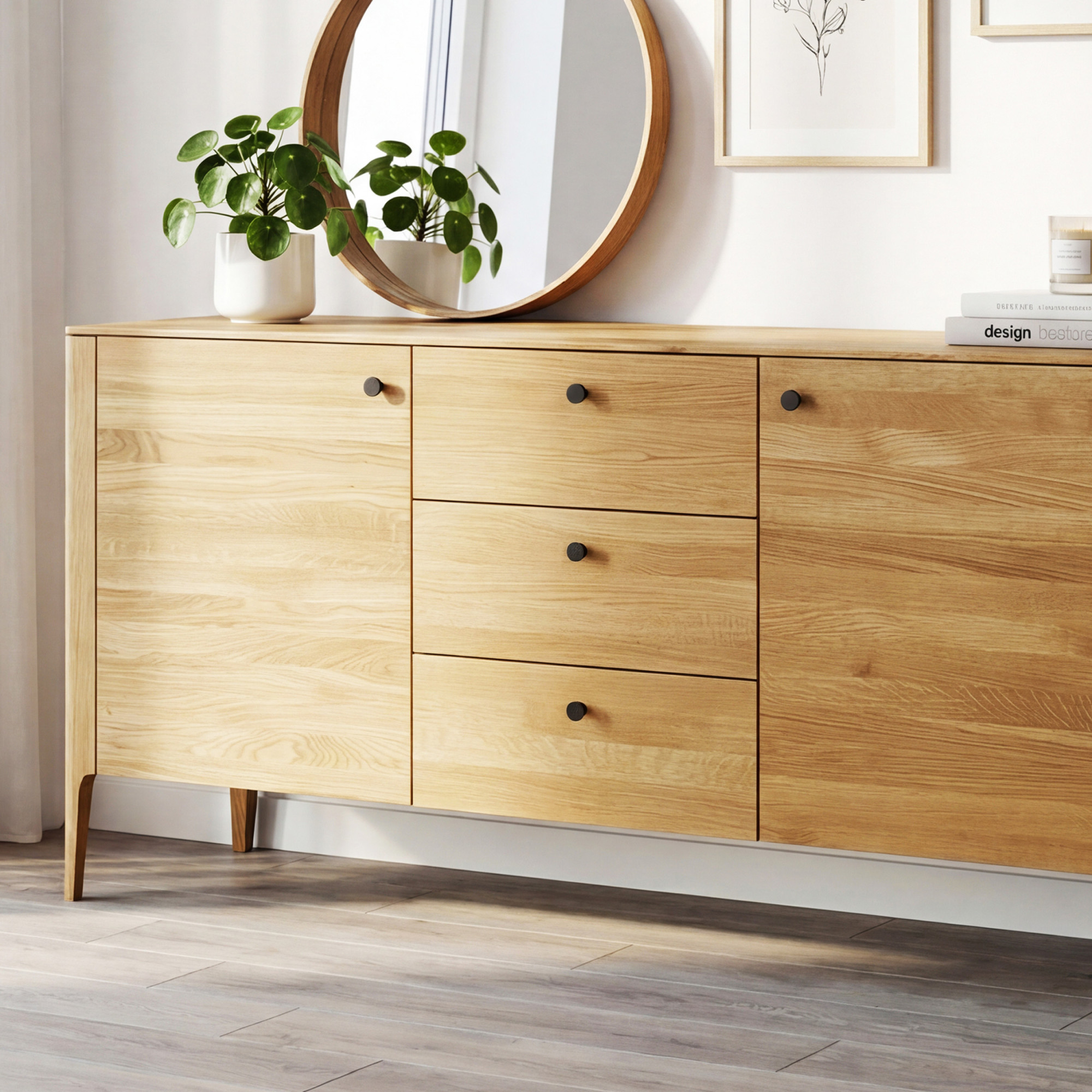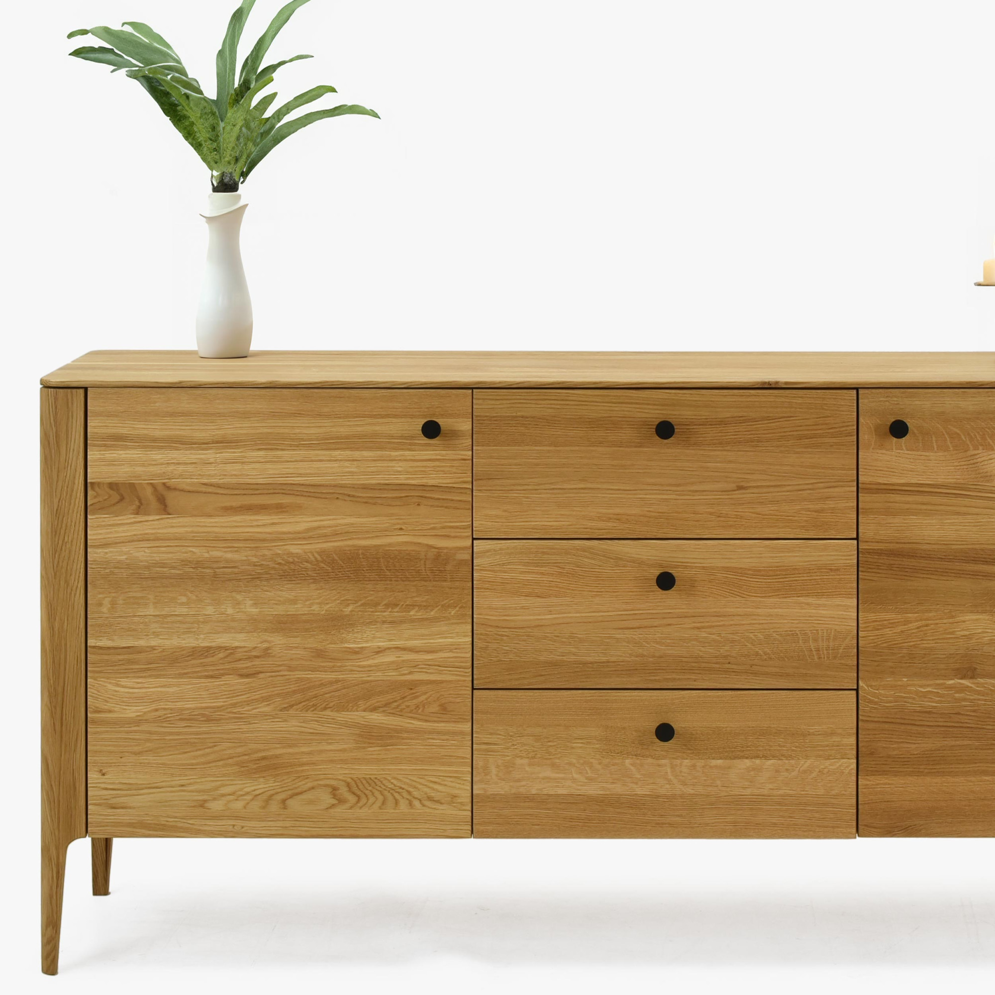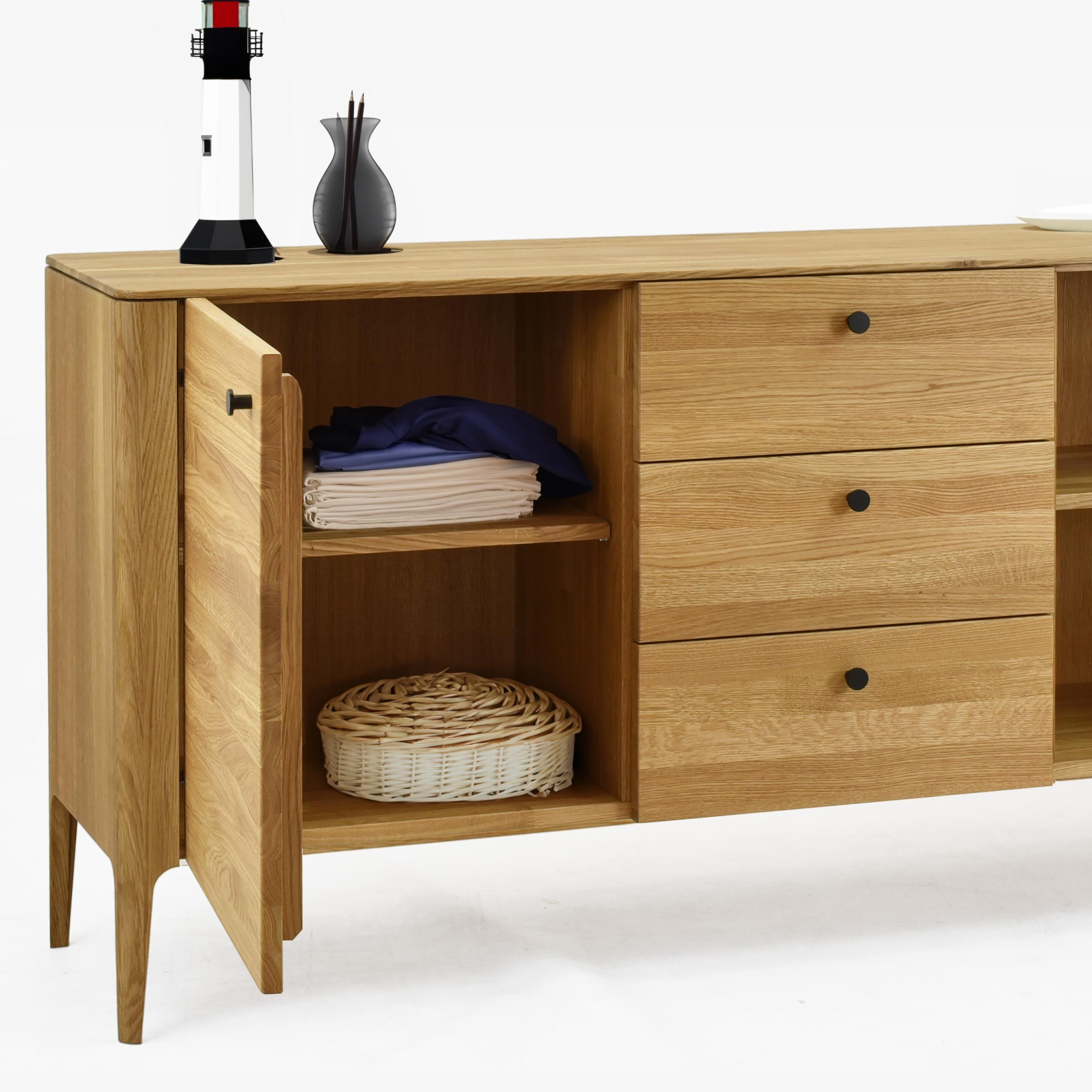 Die TV-Kommode ist dank ihrer Anordnung sehr praktisch. Sie verfügt über zwei Türen und drei geräumige Schubladen, die ausreichend Stauraum für Ihre elektronischen Geräte, Bücher, Dekorationen und weitere Notwendigkeiten bieten. Alle Schubladen und Türen sind mit einer leisen Soft-Close-Funktion ausgestattet, die einen sanften und geräuschlosen Lauf gewährleistet und dadurch die Lebensdauer der Möbel verlängert. Die Oberfläche der Kommode ist mit hochwertigem italienischem Borma Wachs-Öl in der Farbe Eiche Natur behandelt, was die natürliche Struktur des Holzes hervorhebt und Schutz gegen äußere Einflüsse bietet.