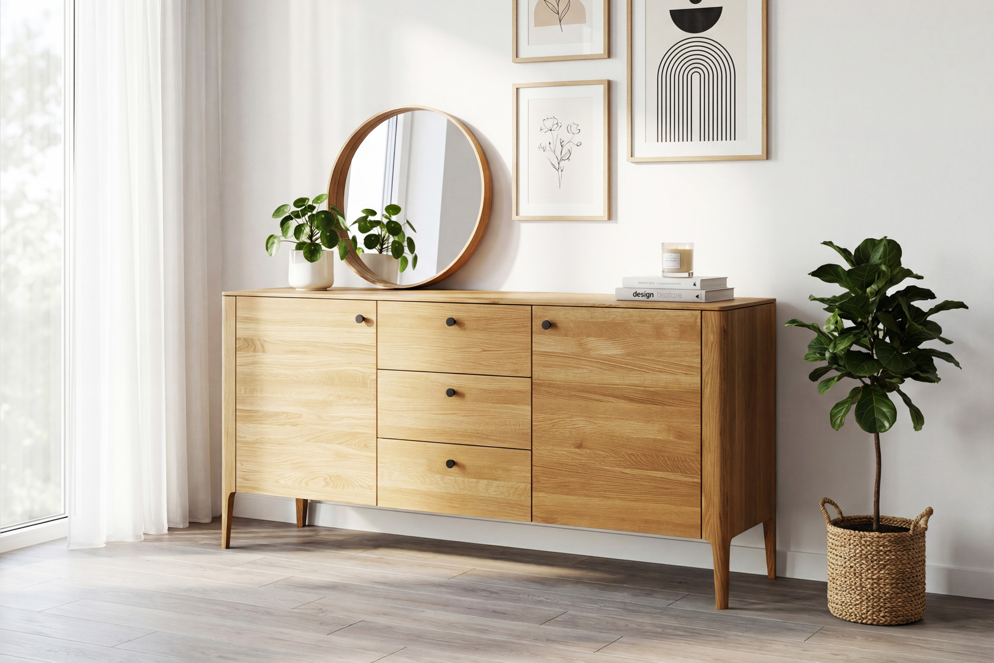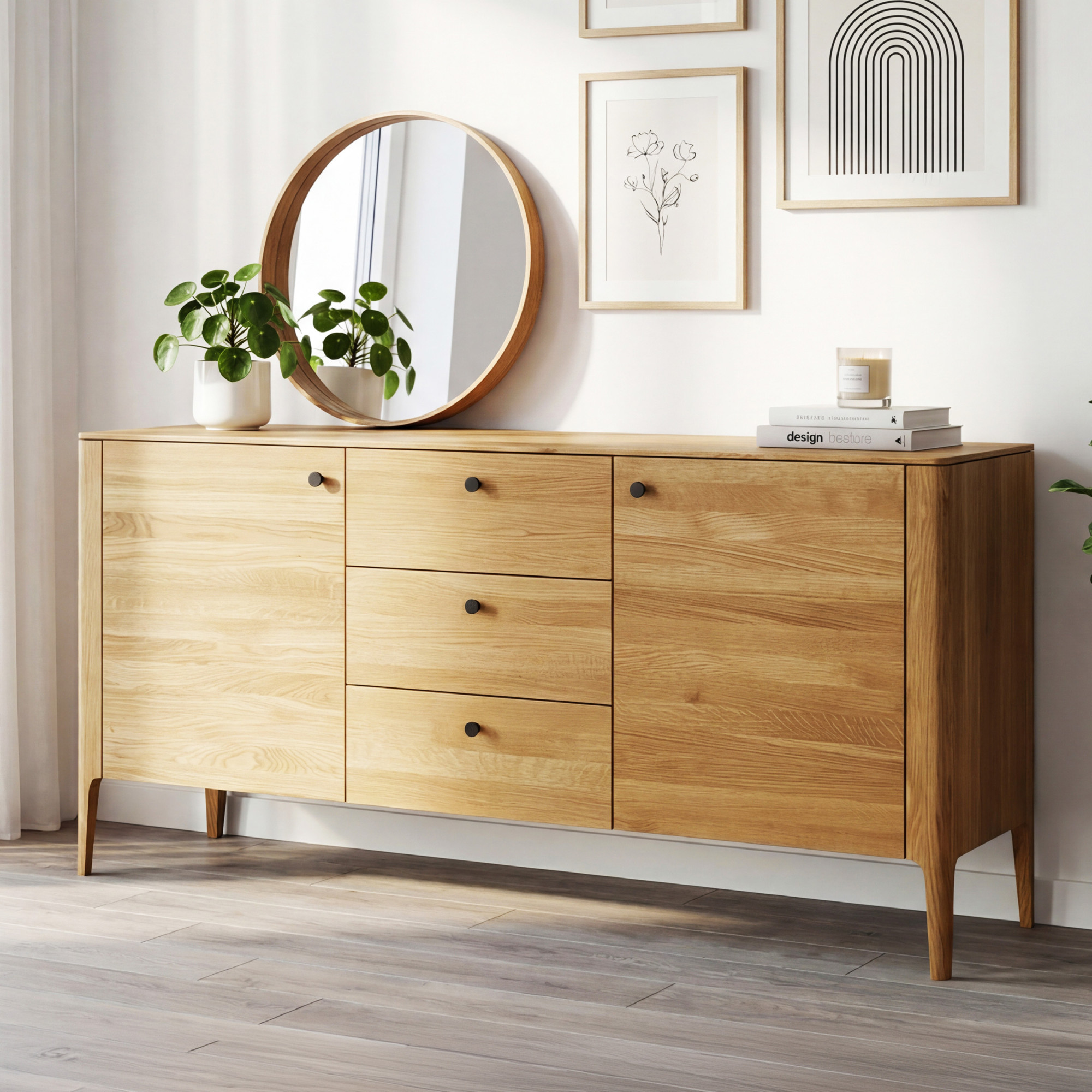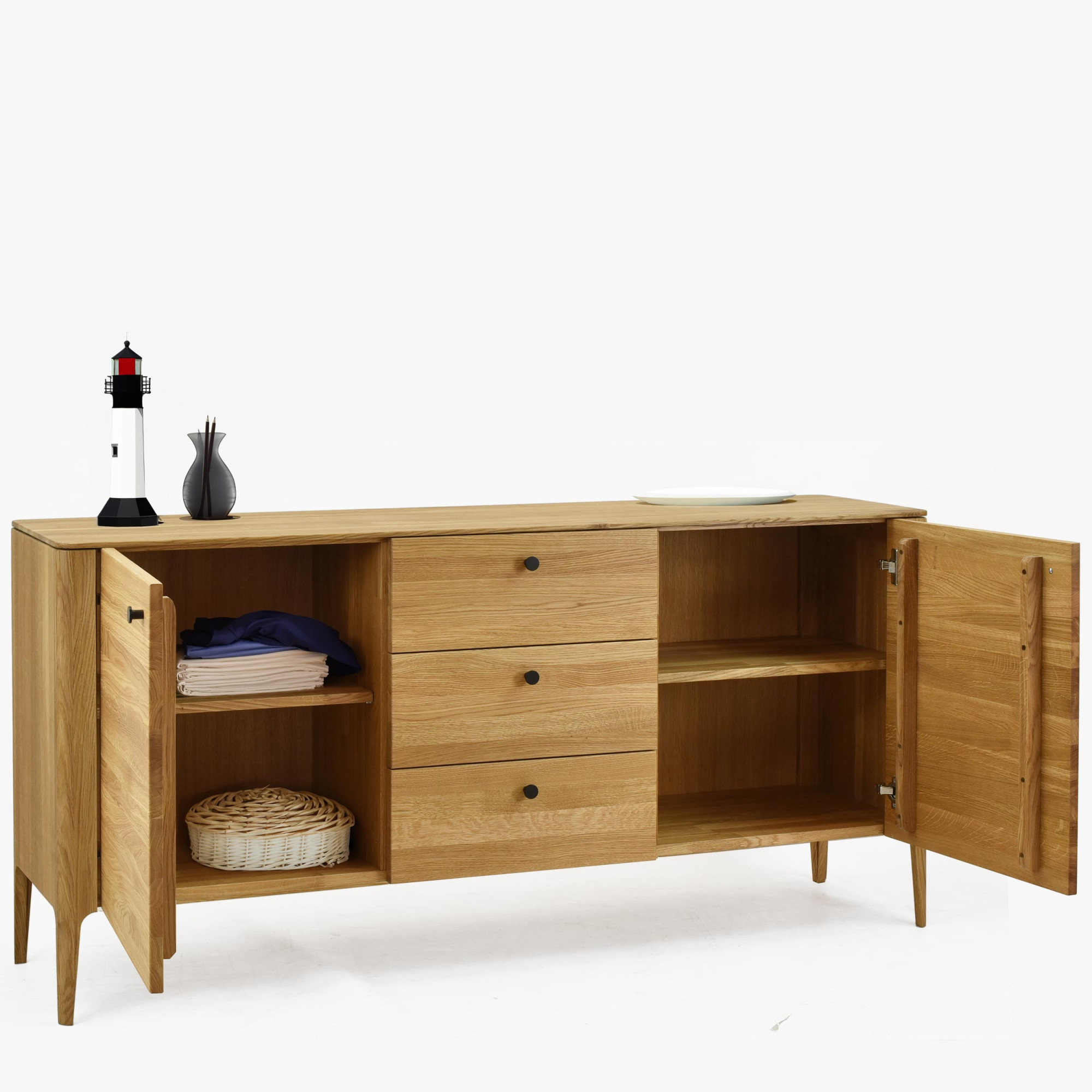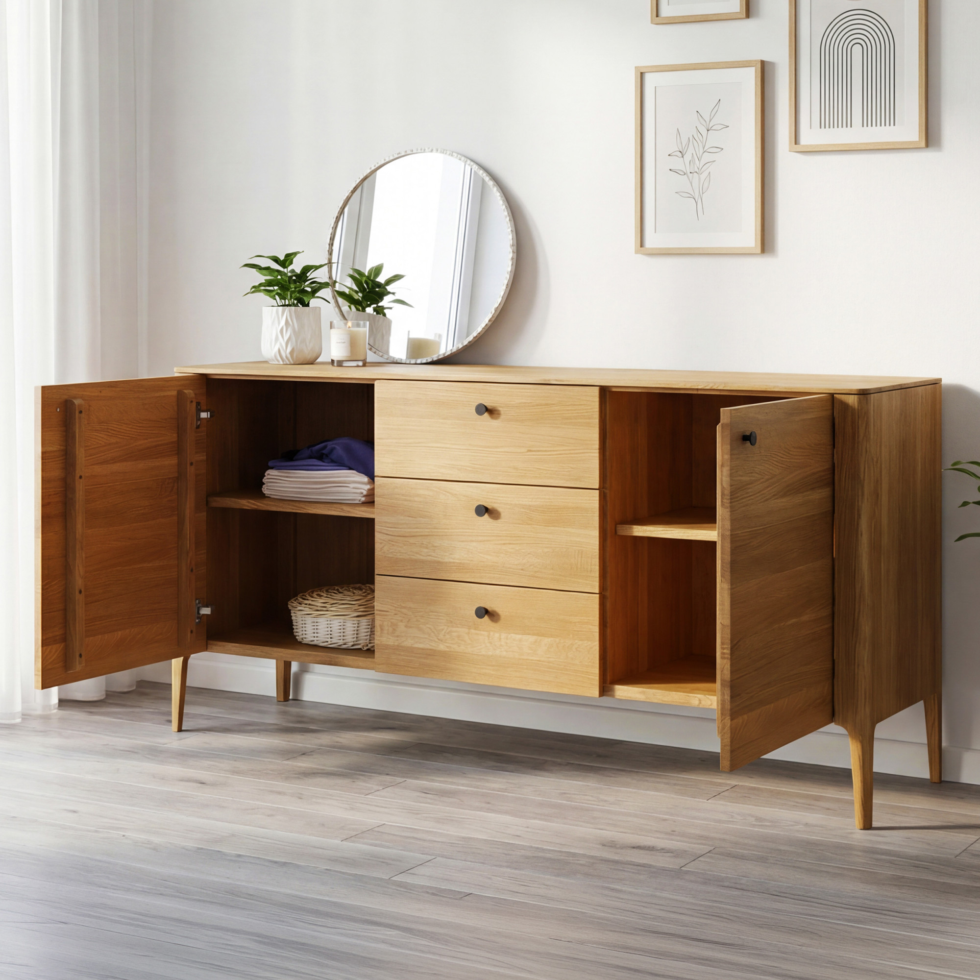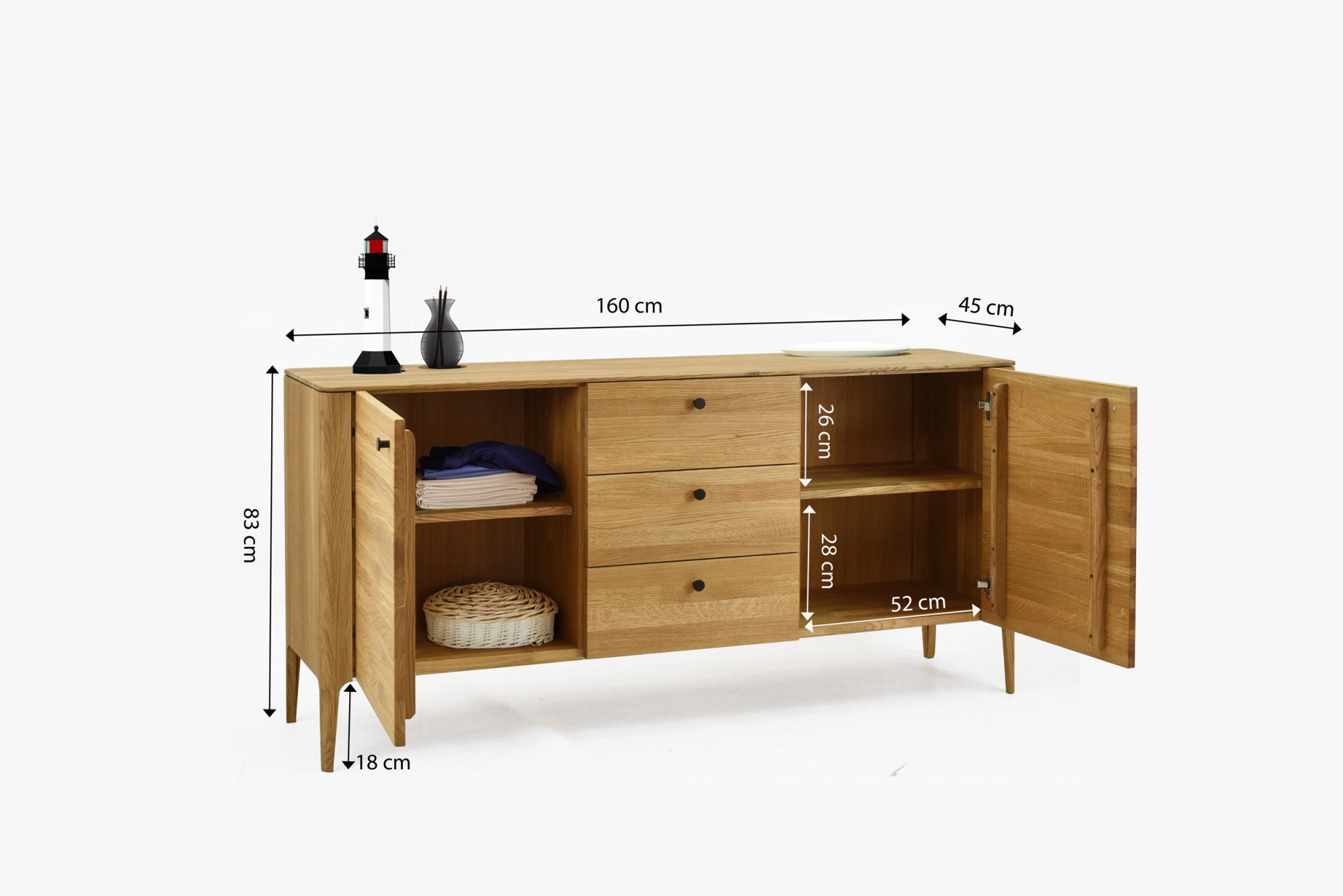 Die TV-Kommode ist dank ihrer Anordnung sehr praktisch. Sie verfügt über zwei Türen und drei geräumige Schubladen, die ausreichend Stauraum für Ihre elektronischen Geräte, Bücher, Dekorationen und weitere Notwendigkeiten bieten. Alle Schubladen und Türen sind mit einer leisen Soft-Close-Funktion ausgestattet, die einen sanften und geräuschlosen Lauf gewährleistet und dadurch die Lebensdauer der Möbel verlängert. Die Oberfläche der Kommode ist mit hochwertigem italienischem Borma Wachs-Öl in der Farbe Eiche Natur behandelt, was die natürliche Struktur des Holzes hervorhebt und Schutz gegen äußere Einflüsse bietet.