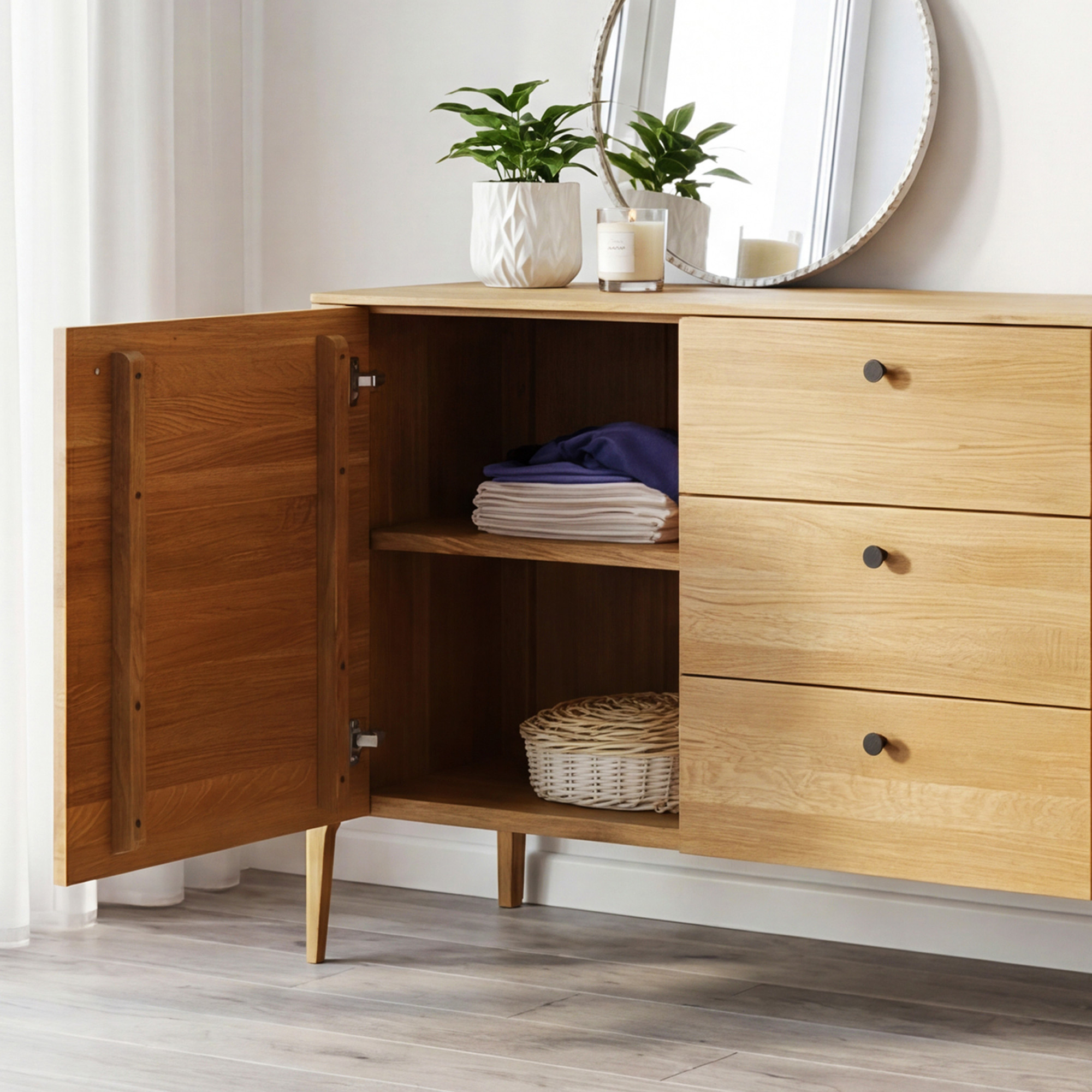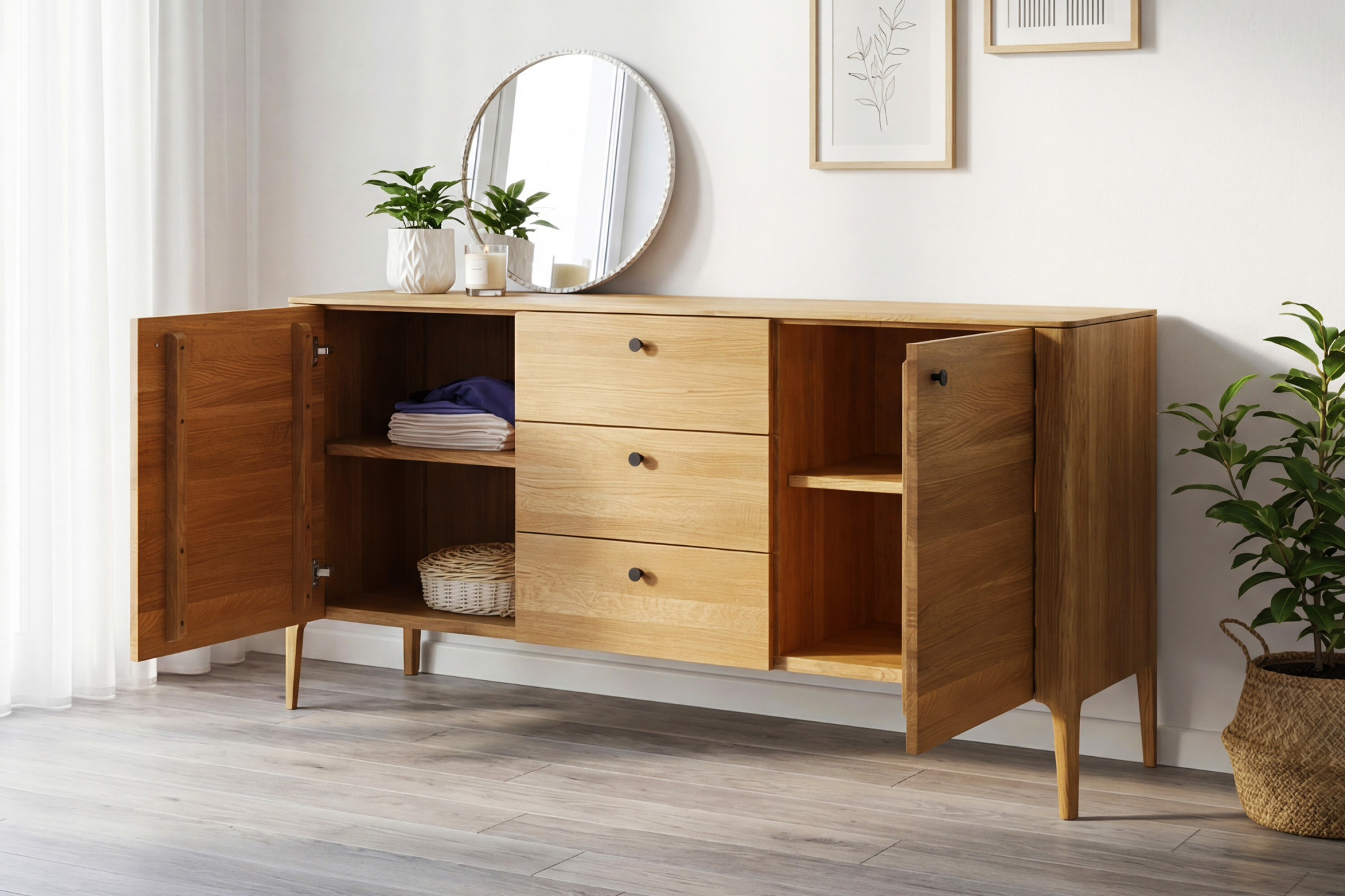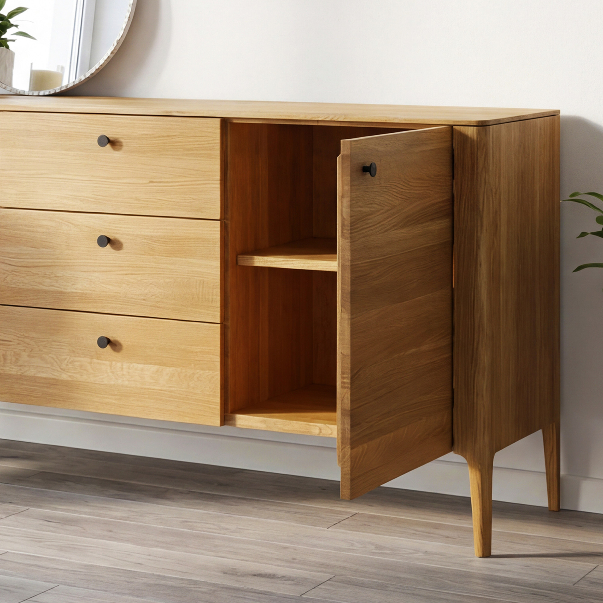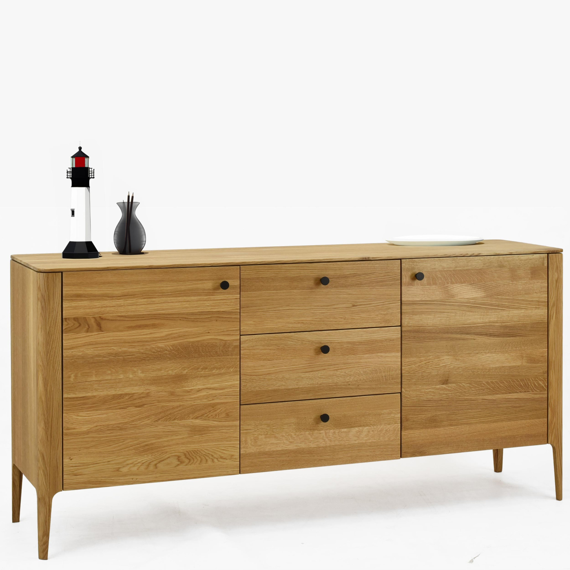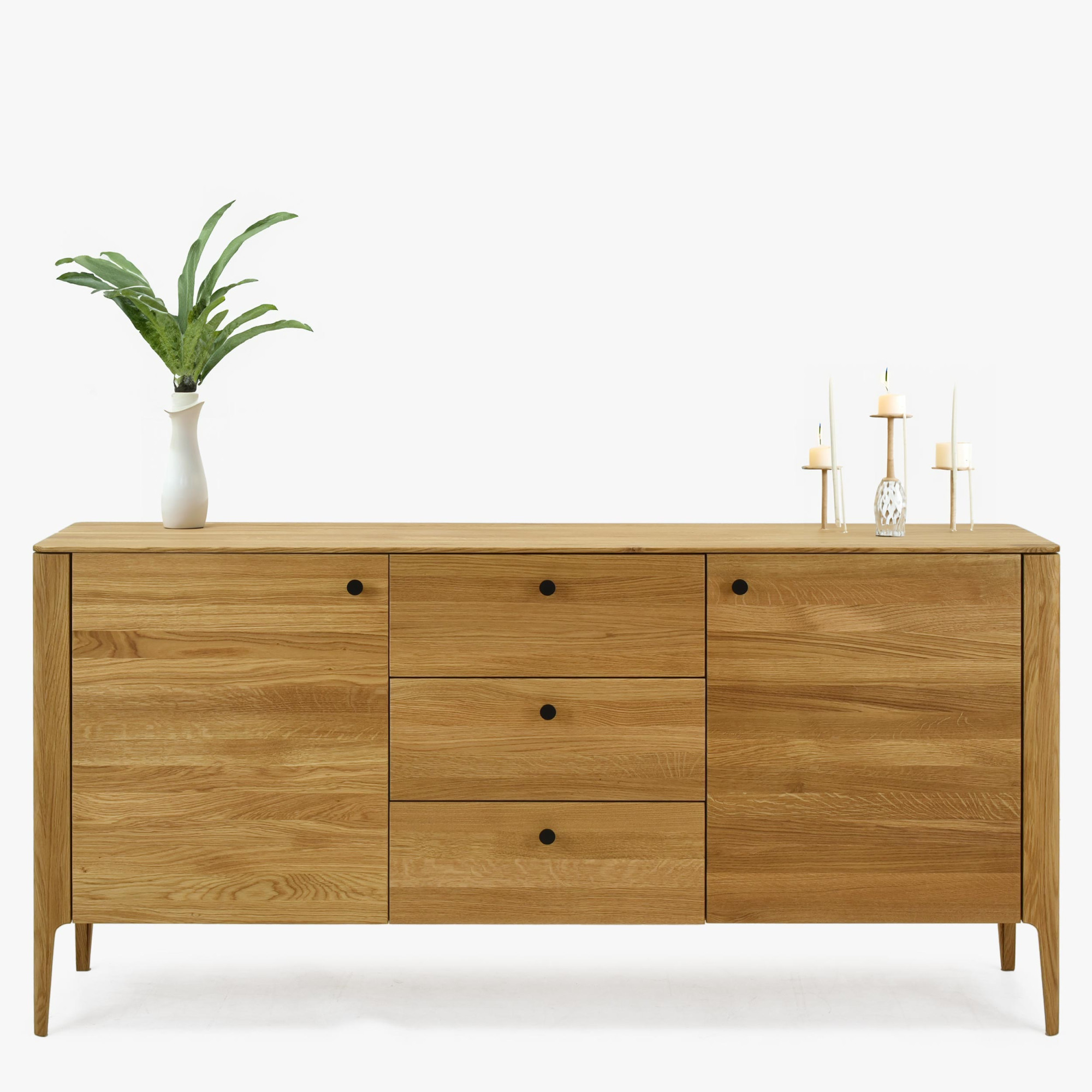 Die TV-Kommode ist dank ihrer Anordnung sehr praktisch. Sie verfügt über zwei Türen und drei geräumige Schubladen, die ausreichend Stauraum für Ihre elektronischen Geräte, Bücher, Dekorationen und weitere Notwendigkeiten bieten. Alle Schubladen und Türen sind mit einer leisen Soft-Close-Funktion ausgestattet, die einen sanften und geräuschlosen Lauf gewährleistet und dadurch die Lebensdauer der Möbel verlängert. Die Oberfläche der Kommode ist mit hochwertigem italienischem Borma Wachs-Öl in der Farbe Eiche Natur behandelt, was die natürliche Struktur des Holzes hervorhebt und Schutz gegen äußere Einflüsse bietet.