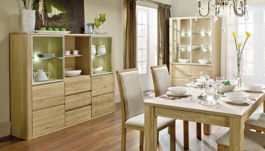 Die Möbel stammen aus der Nice-Kollektion, in der Sie Kommoden, TV-Tische und Vitrinen finden. Möbel für das Esszimmer und Wohnzimmer sind in drei Farben erhältlich: natürliche Öleiche, Bianco-Eiche und Walnussfarbe. Die gesamte Kollektion können Sie hier ansehen.