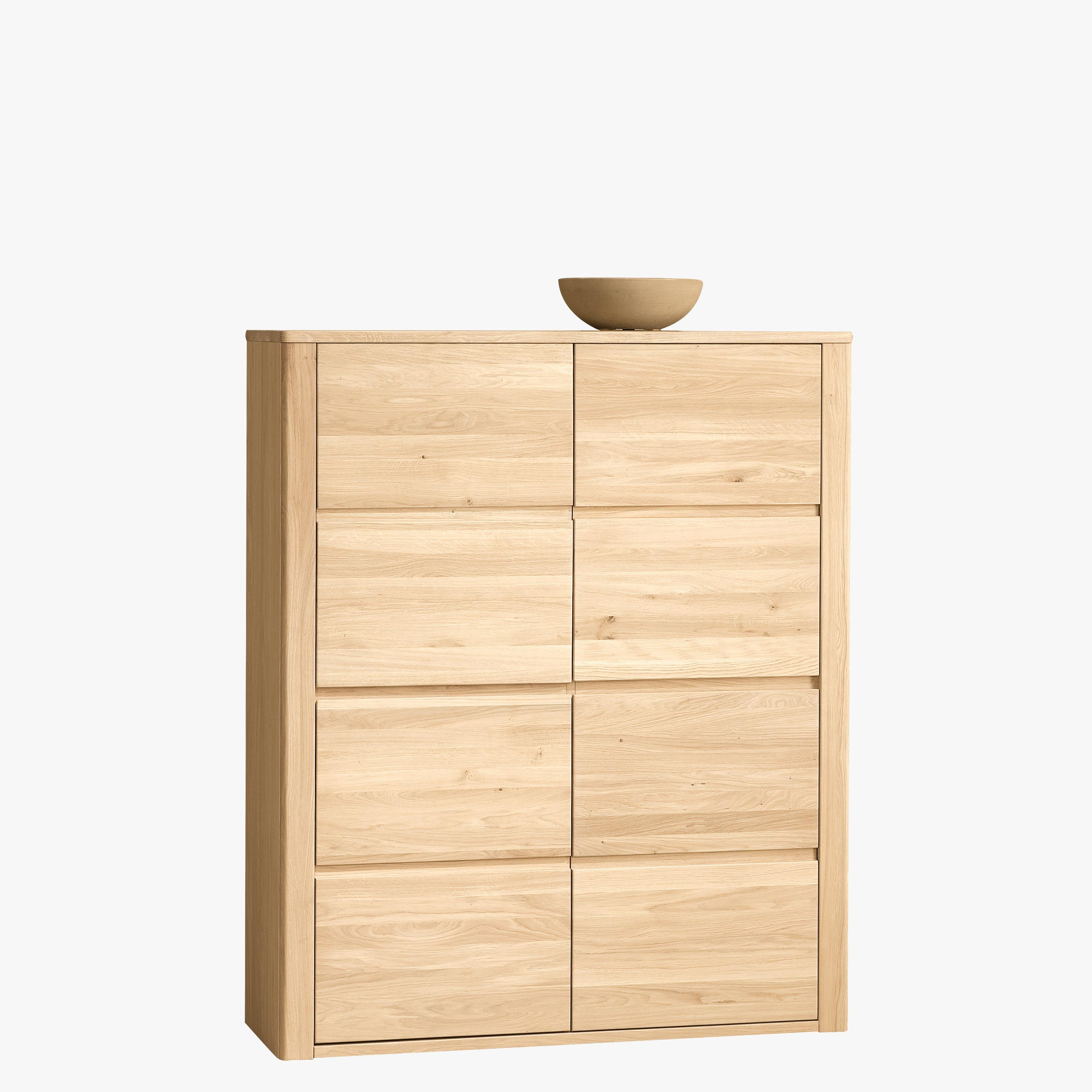 Massives Eichenholz wurde für die Türen und die obere Platte der Kommode verwendet. Korpus und Seiten sind aus natürlicher Eichenfurnier, die Rückwand aus Holzschichtholz. Das verwendete Material durchläuft einen sorgfältigen Auswahl- und Kontrollprozess. Diese Materialkombination zählt zu den hochwertigsten, die Sie im modernen Möbelbau finden.