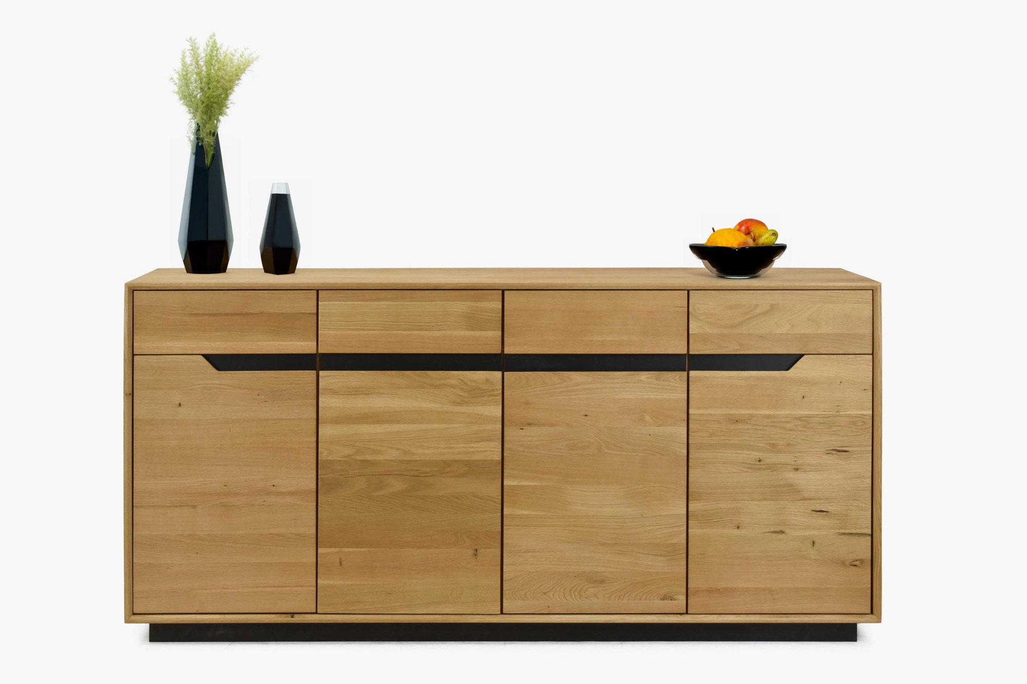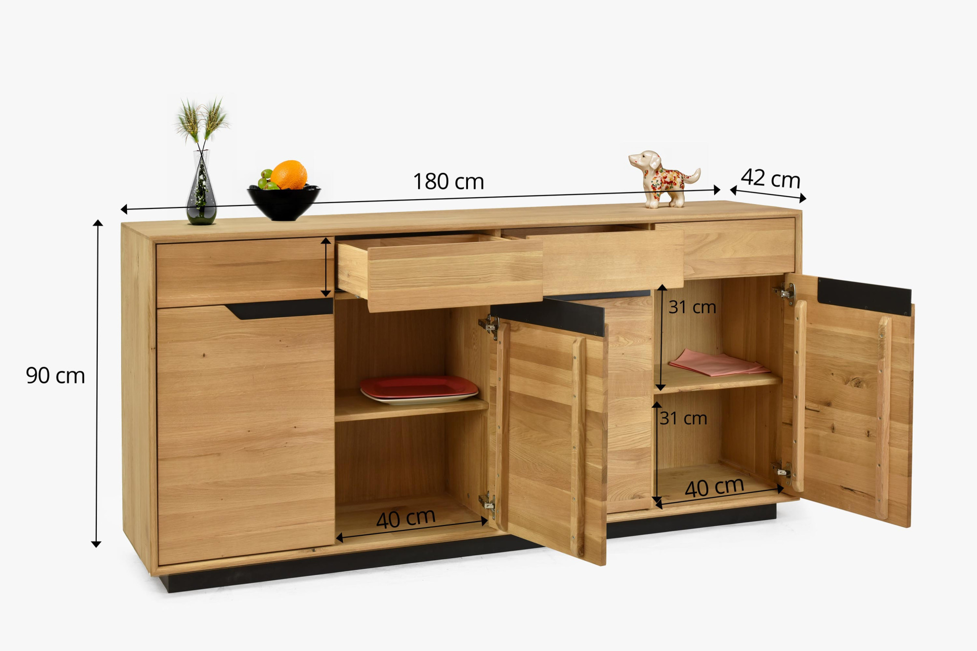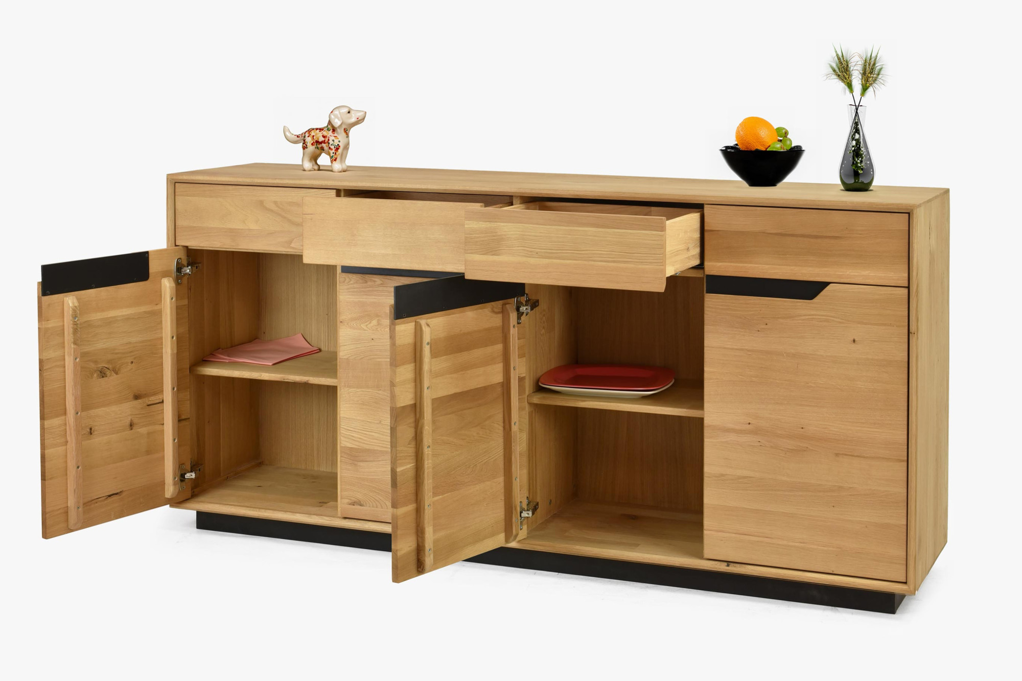 - Die Anrichte verfügt über vier Schubladen und vier Türen mit einem praktischen Holzregal im mittleren Bereich, was ausreichend Platz für die Aufbewahrung Ihrer Sachen bietet.