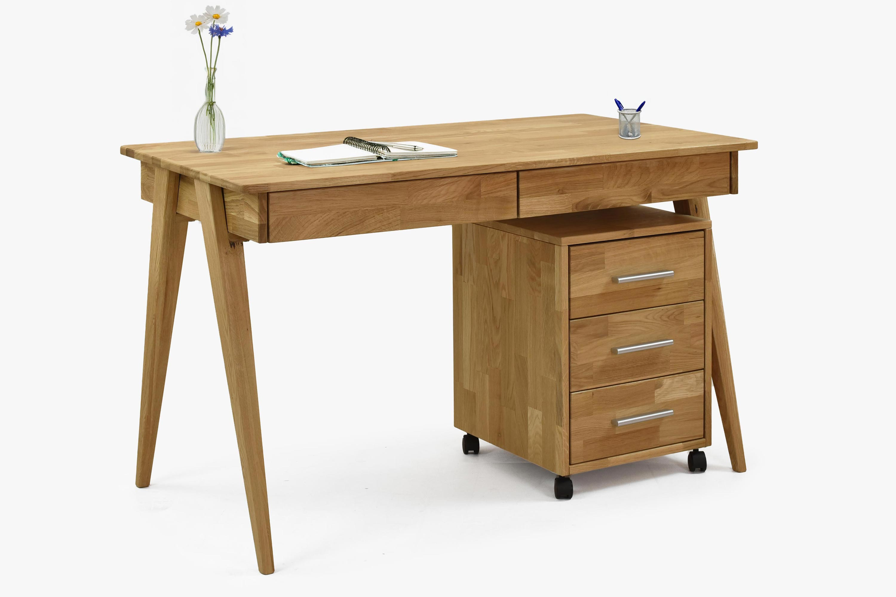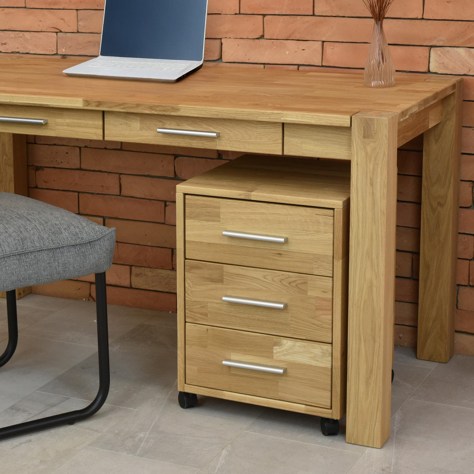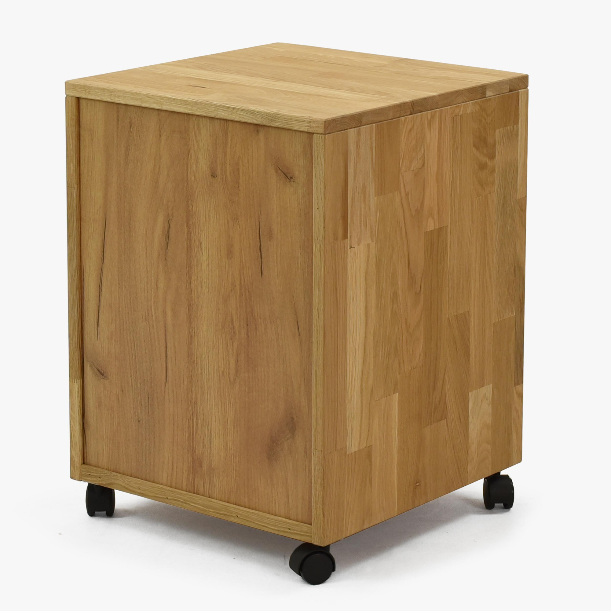 Kommode aus Holz mit Schubladen auf Rollen aus natürlichem Eichenholz im Parkettmuster (Finger-Joint) wird zu einem praktischen und zugleich stilvollen Accessoire in jedem Haushalt. Die Kommode verfügt über drei geräumige Schubladen, die ausreichend Stauraum für Dokumente, Kleidung oder kleine Gegenstände bieten. Der untere Teil der Kommode ist mit Kunststoffrollen ausgestattet, mit denen die Kommode einfach und bequem im Raum nach Ihren Bedürfnissen bewegt werden kann. Die Rollen sind das einzige Element, das montiert werden muss, die Kommode selbst wird vormontiert geliefert. Das Möbelstück ist aus FSC-zertifiziertem Eichenholz gefertigt, was seine ökologische Herkunft und lange Lebensdauer garantiert. Die Kommode lässt sich leicht mit anderen Eichenmöbeln kombinieren, zum Beispiel PC-Tische oder Nachttische, wodurch Sie ein harmonisches Interieur im einheitlichen Stil schaffen. Maße des Schubladeninnenraums sind (Höhe 32 cm, Tiefe 37 cm, Höhe 9 cm)