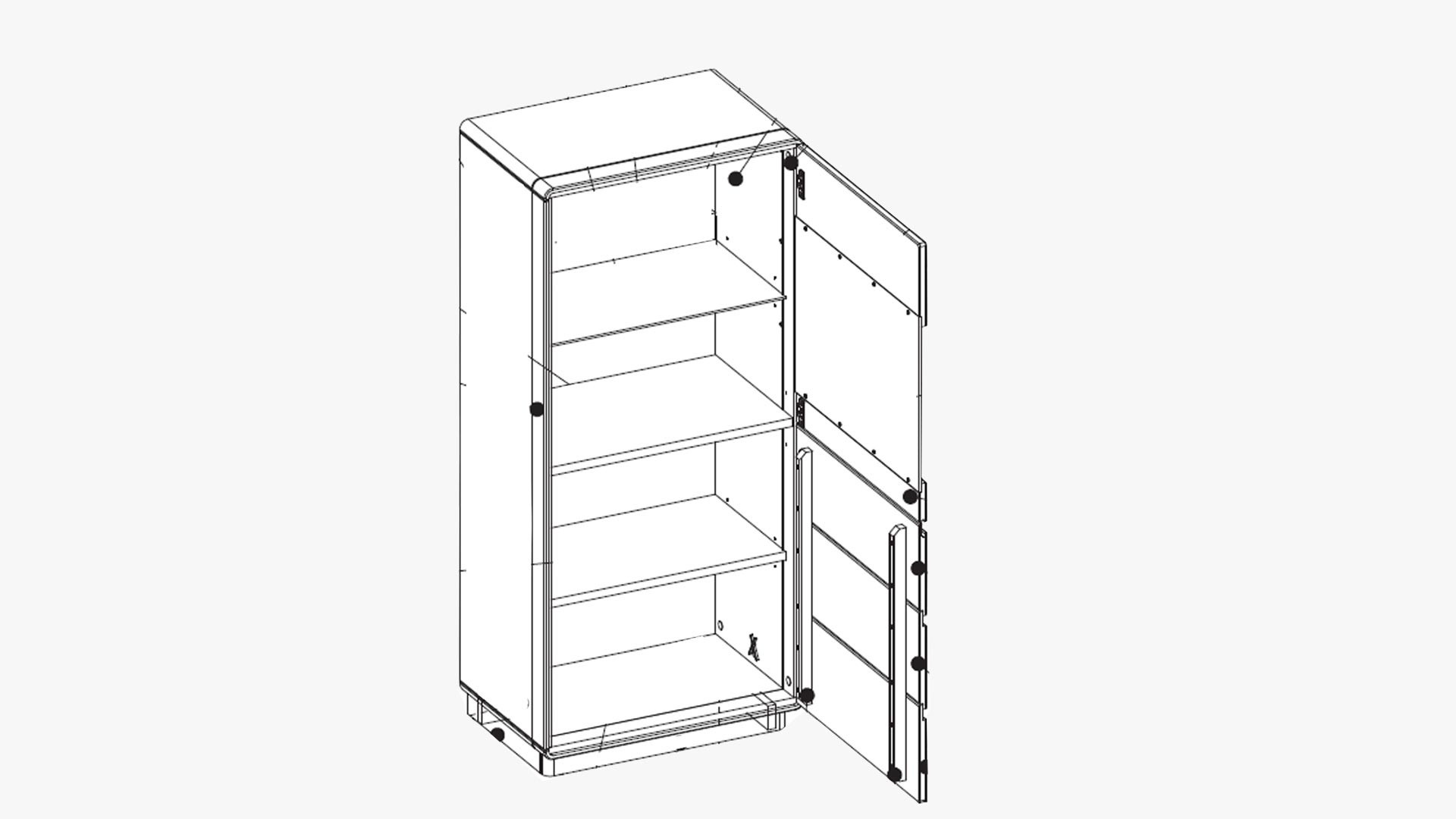 Hinter den Türen mit hochwertiger deutscher Beschlägen finden Sie ein verglastes Fach aus speziellem gehärtetem Glas, und im unteren Bereich ein Holzregal.
