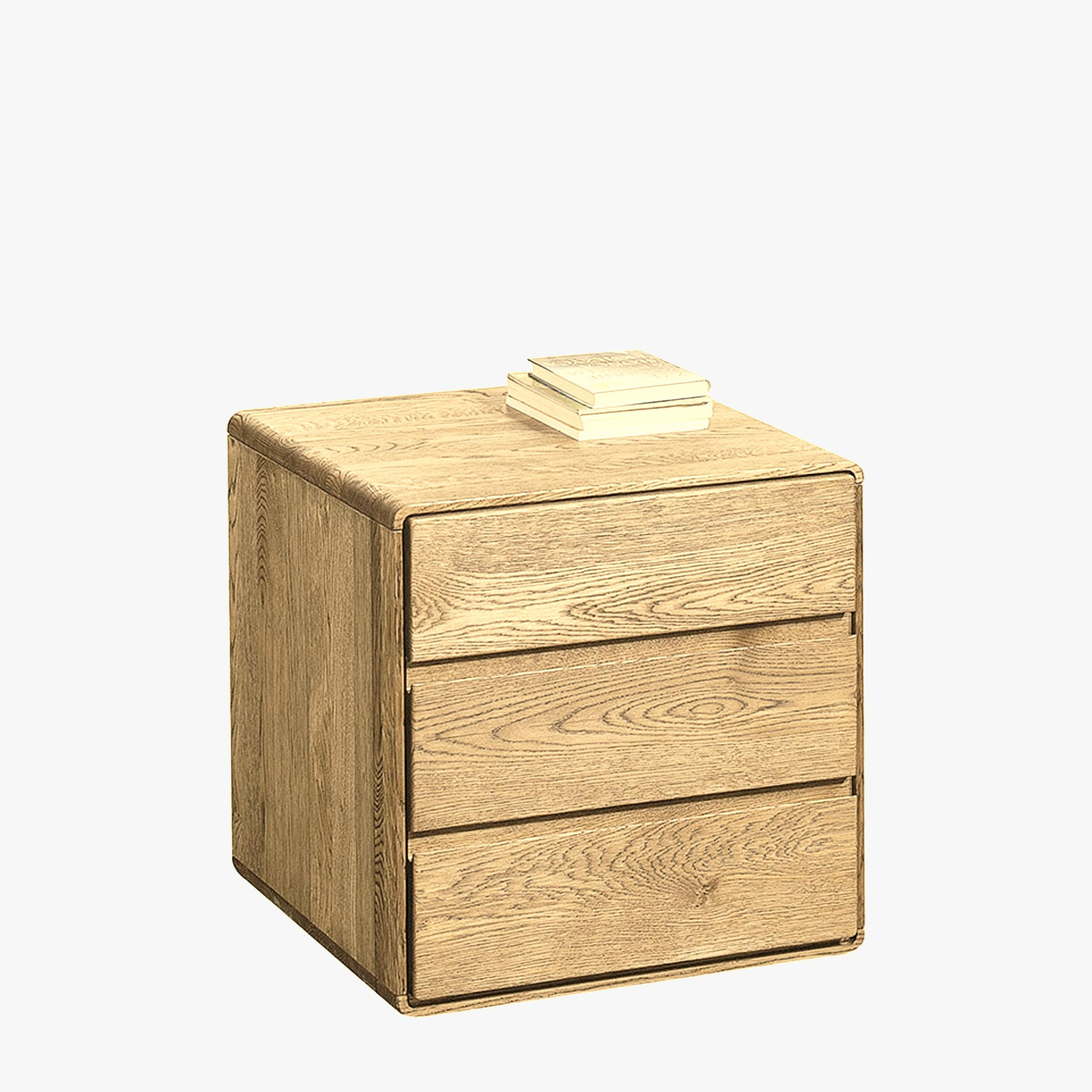 Kleine Kommode aus gebürsteter Eiche findet beispielsweise im Schlafzimmer als Nachttisch Verwendung, im Flur oder im Arbeitszimmer als Kommode unter dem Schreibtisch. Ihnen stehen 3 Schubladen mit geräuschlosem Soft-Close und geformten Fronten zur Verfügung, die ein grifflose Öffnung ermöglichen.