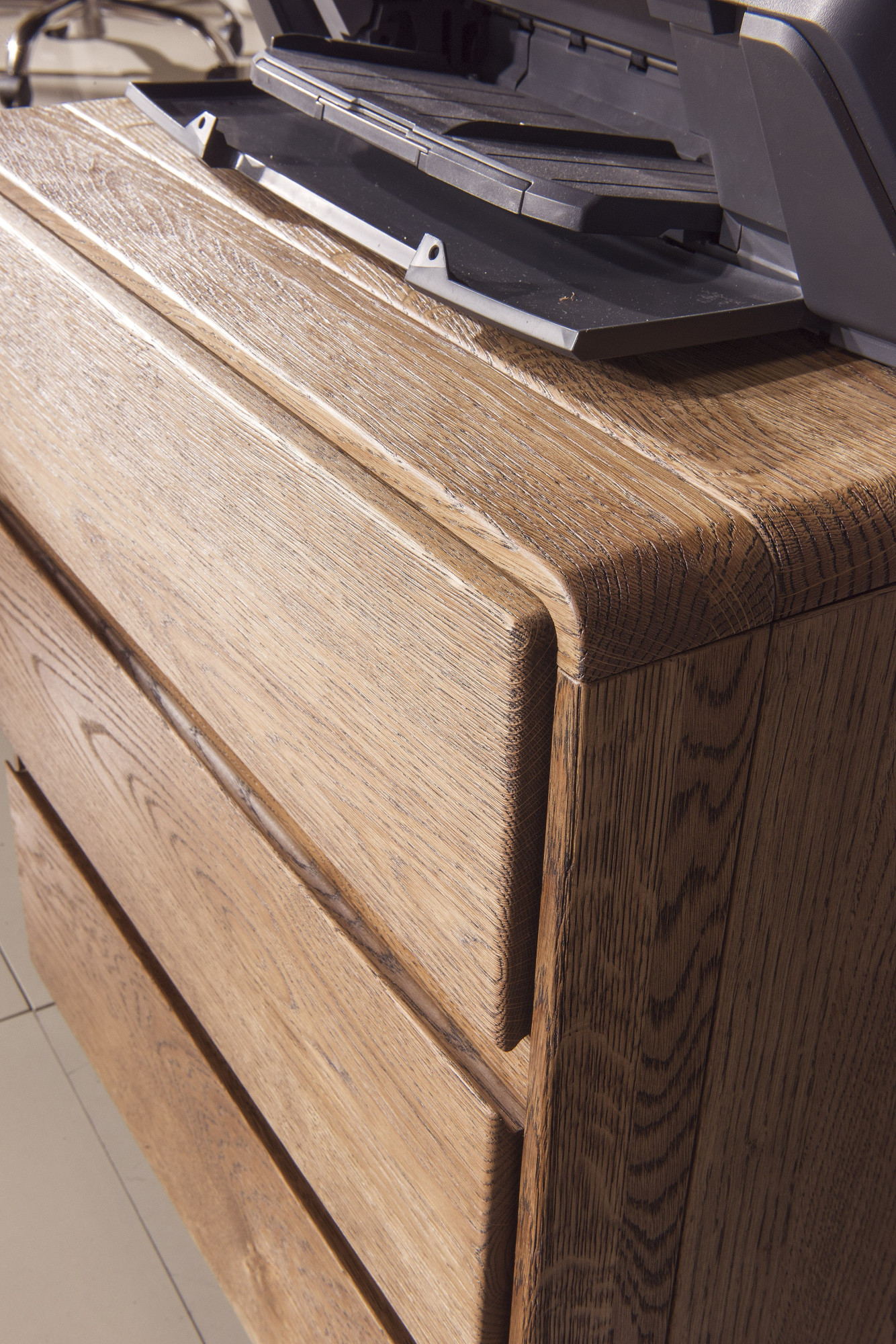 Das Eichenholz, aus dem die Kommode gefertigt ist, wurde mit der Methode des Bürstens behandelt. Dabei entfernen spezielle Bürsten das weiche (Frühjahrs-)Holz von der Oberfläche, und die hervorstehende Struktur besteht aus seiner härteren Komponente. Diese verleiht dem Endprodukt die unverwechselbare Maserung, den einzigartigen Charme sowie die ausgeprägte Struktur, die man auch bei flüchtiger Berührung spürt. Die Kommode bezaubert auch mit ihrem charakteristischen Duft, der an einen unberührten Eichenwald erinnert.