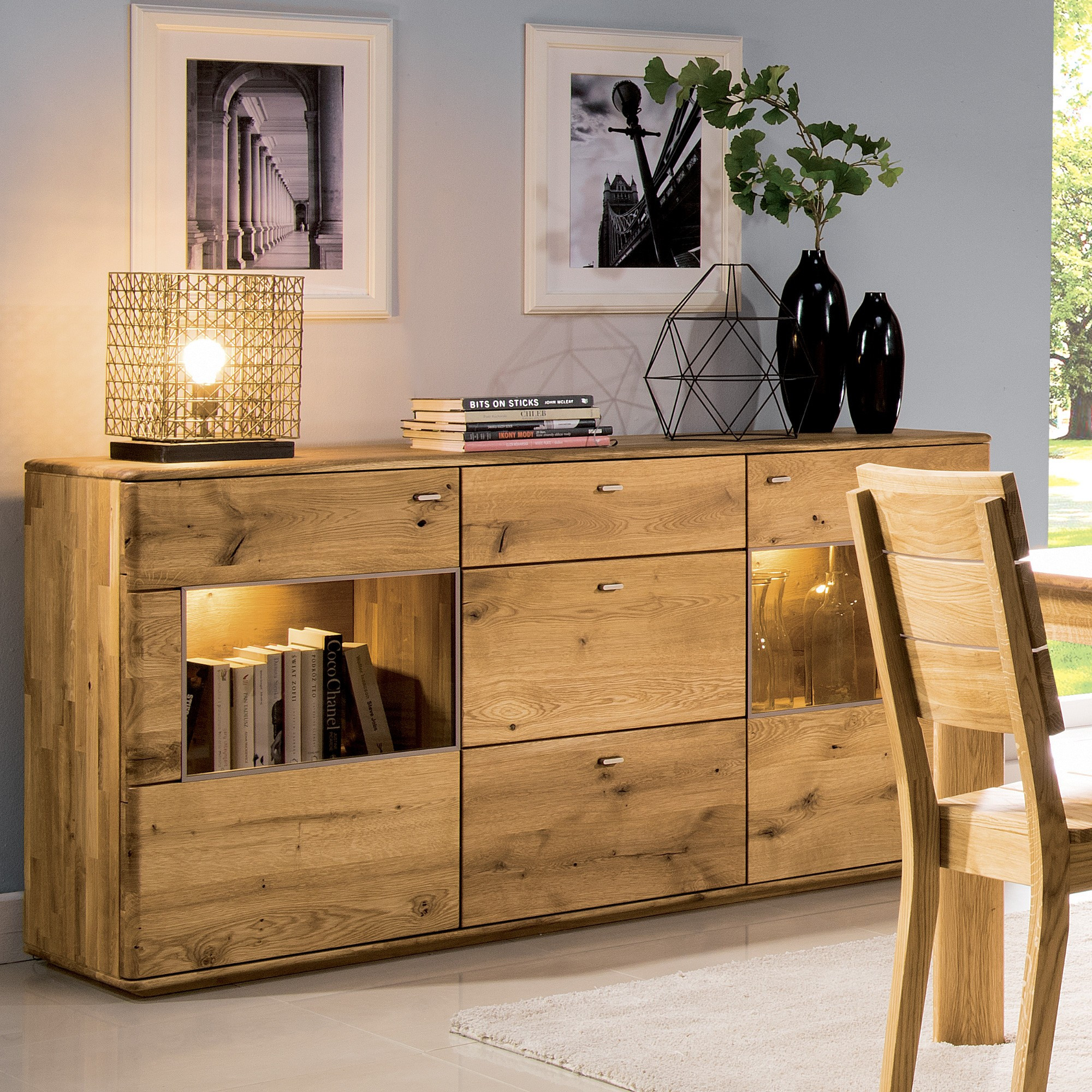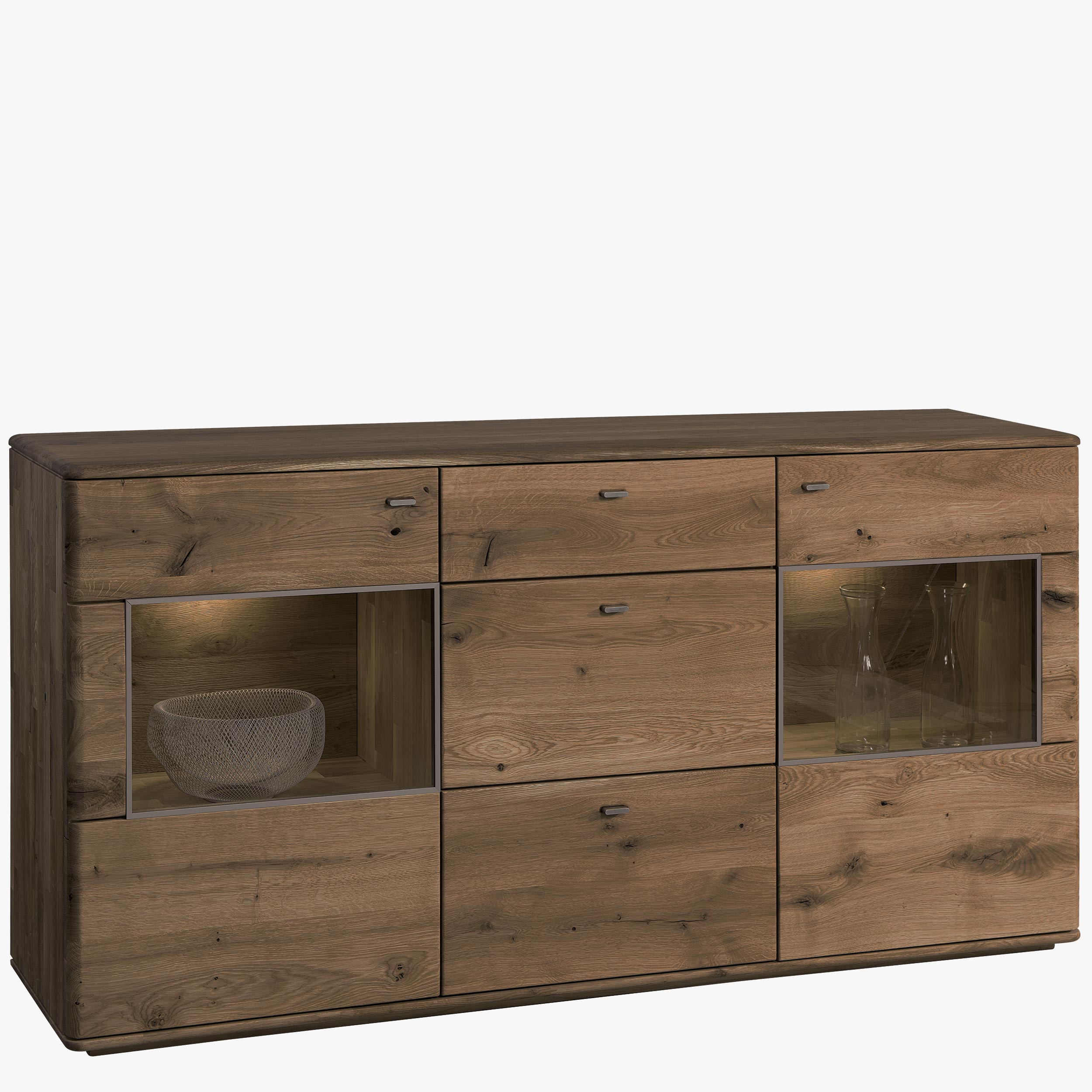 Massive Eichenkommode Texas mit Glastüren und Beleuchtung