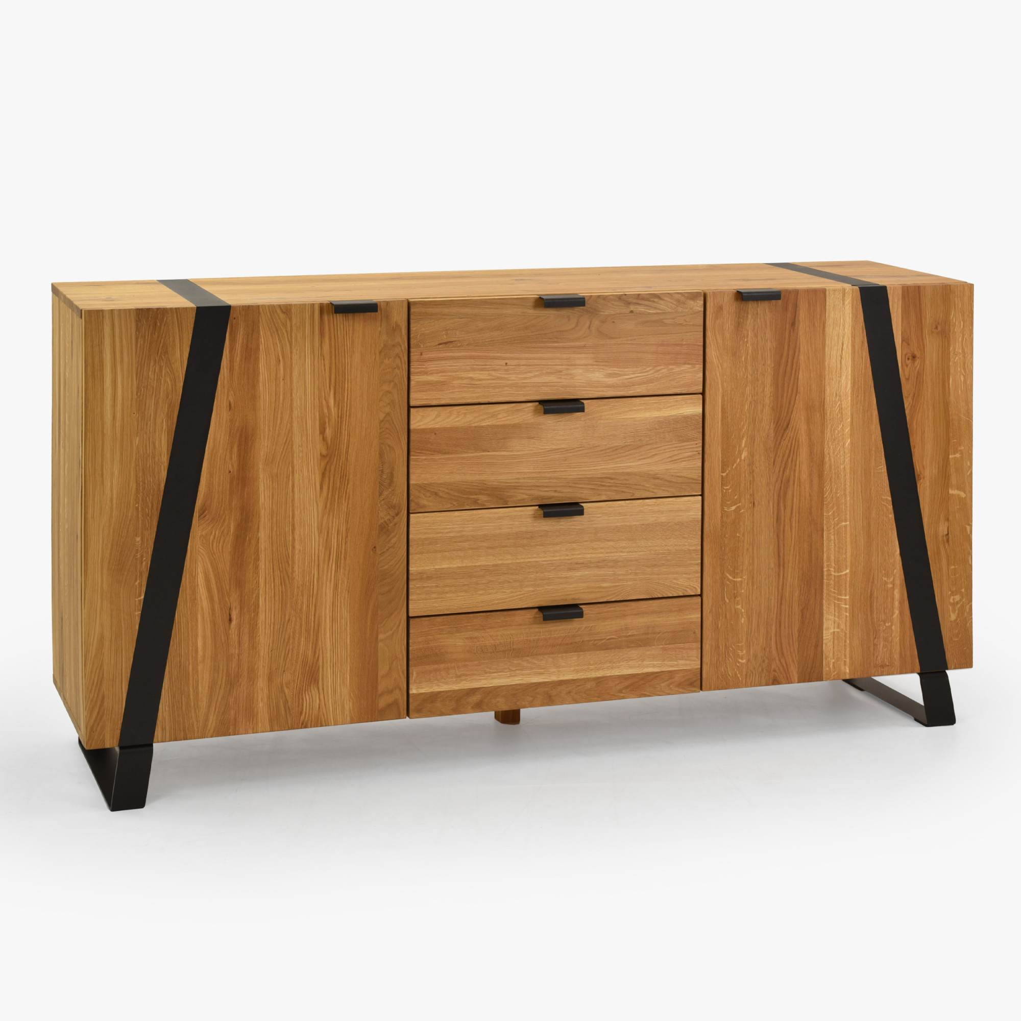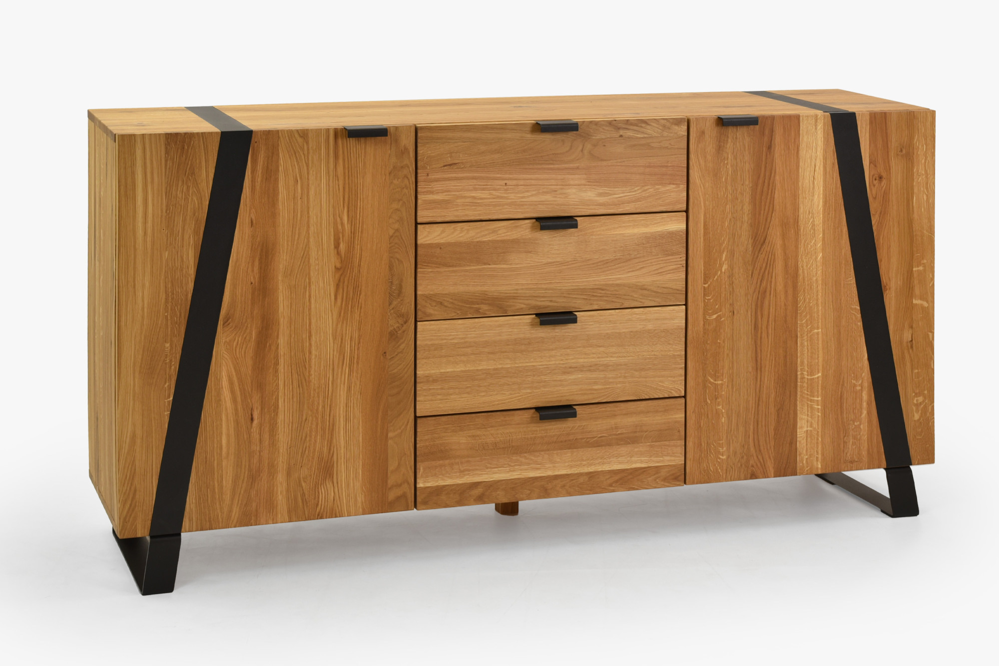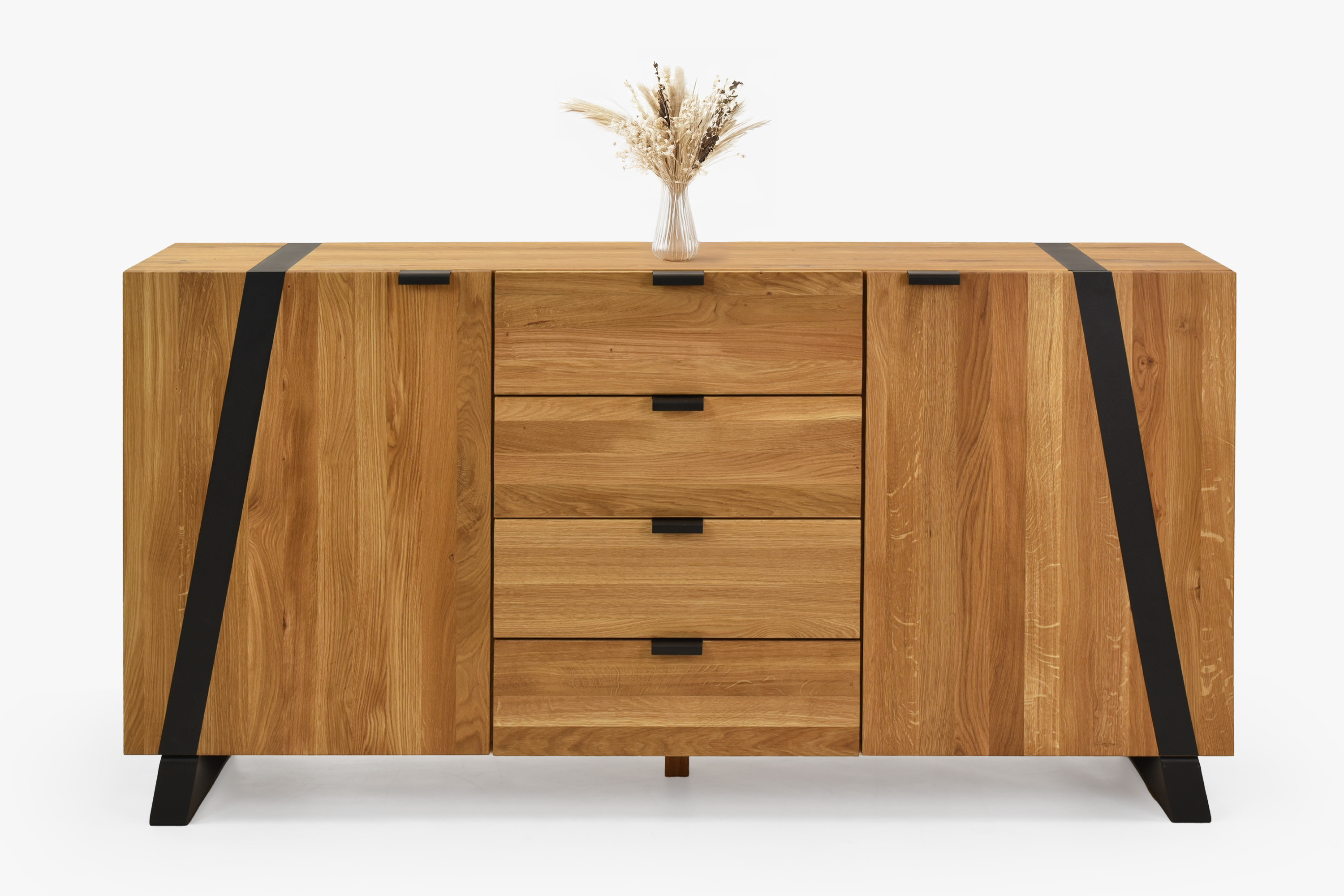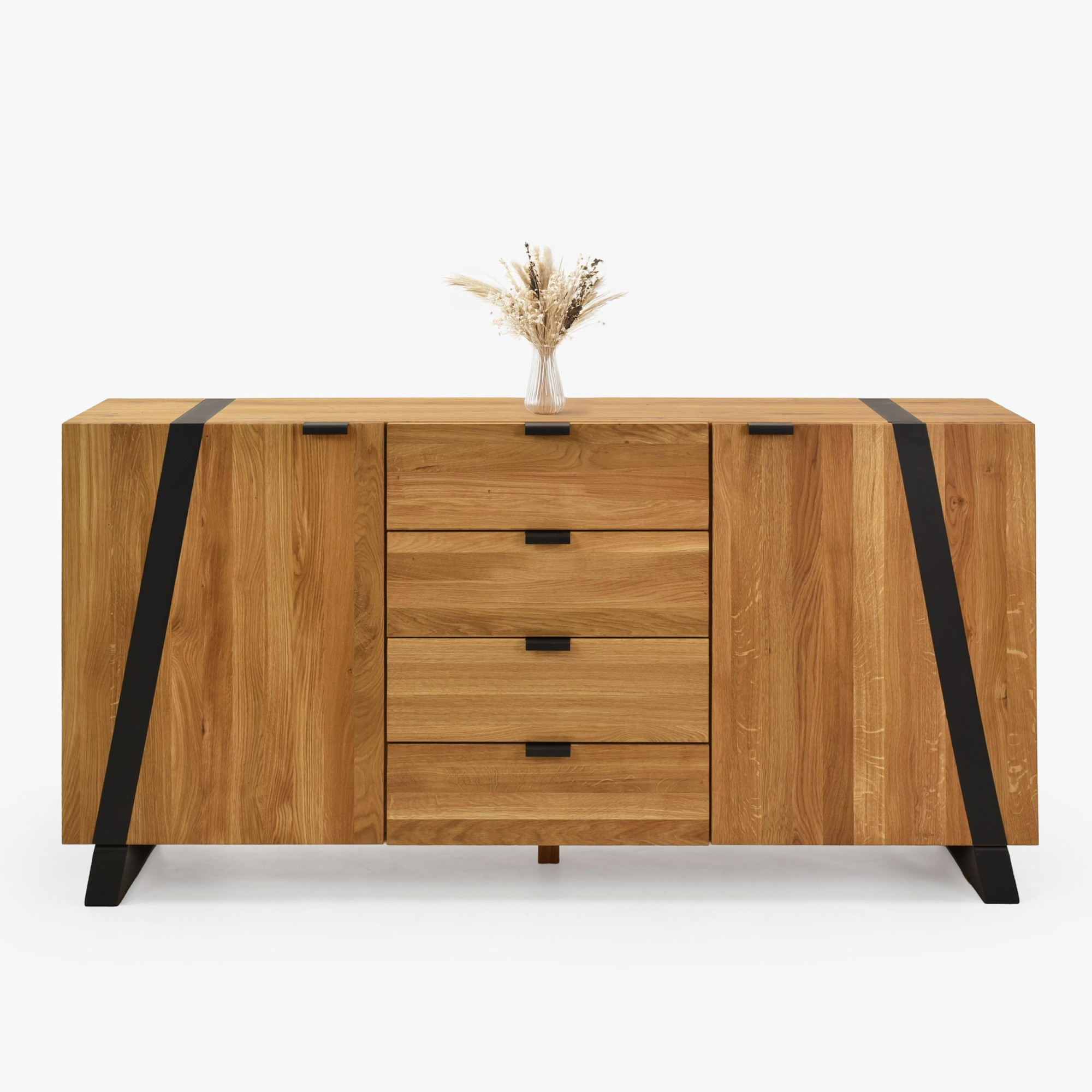 Eichenkommode aus der Kollektion Boliah bringt die Wärme von massivem Naturholz und modernes Design in Ihr Schlafzimmer. Der gesamte Korpus, die Türfronten sowie die obere Platte bestehen aus massiver Eiche mit FSC-Zertifikat, welches die nachhaltige Herkunft des Materials garantiert. Die Oberfläche ist mit natürlichem Öl in der Farbe Eiche Natural behandelt; dieses betont die Holzstruktur, stößt Schmutz ab und enthält keine schädlichen Chemikalien. Zeitloser Akzent sind die schwarzen Metallfüße und feine Metallelemente, die der Kommode ein luftiges und zugleich stabiles Erscheinungsbild verleihen.