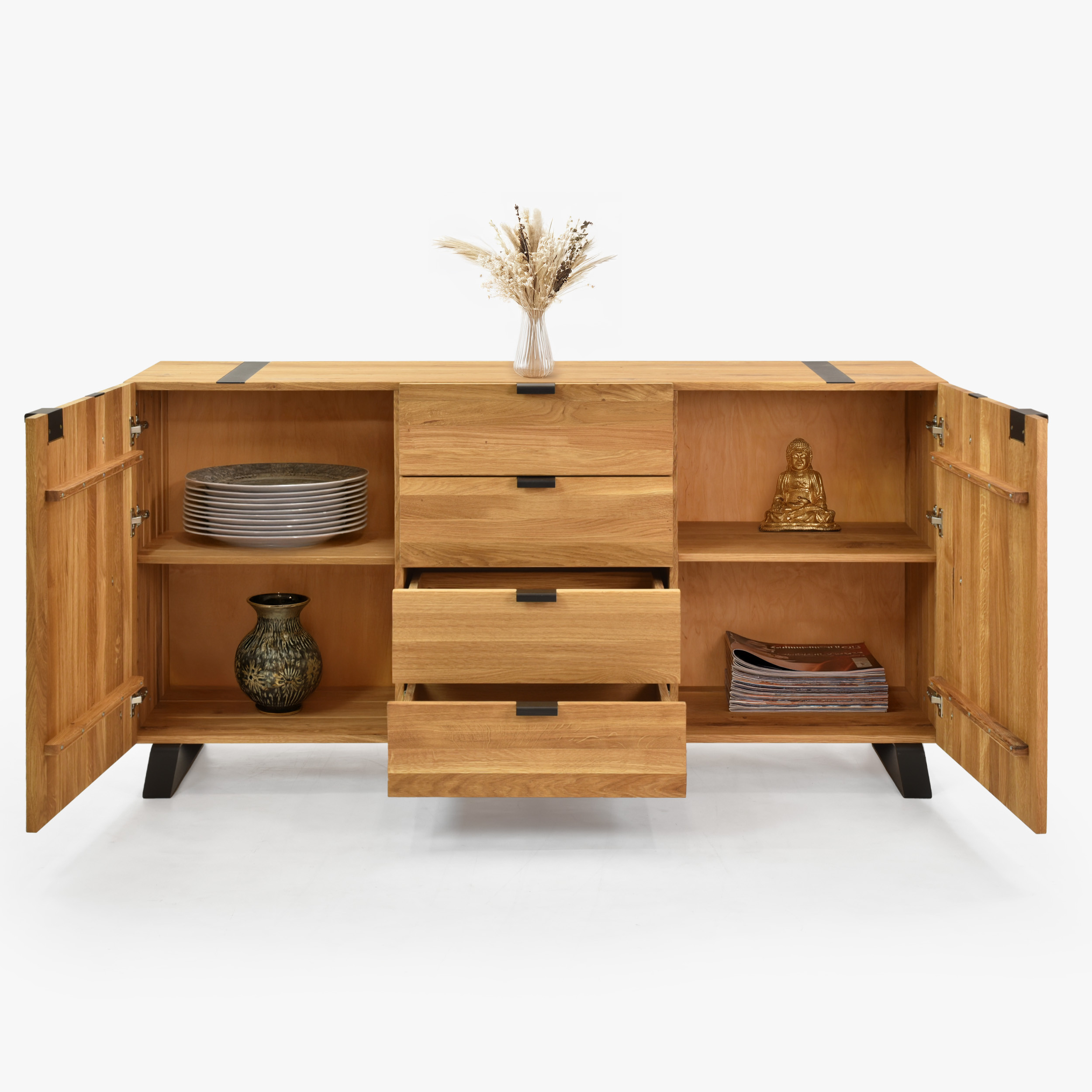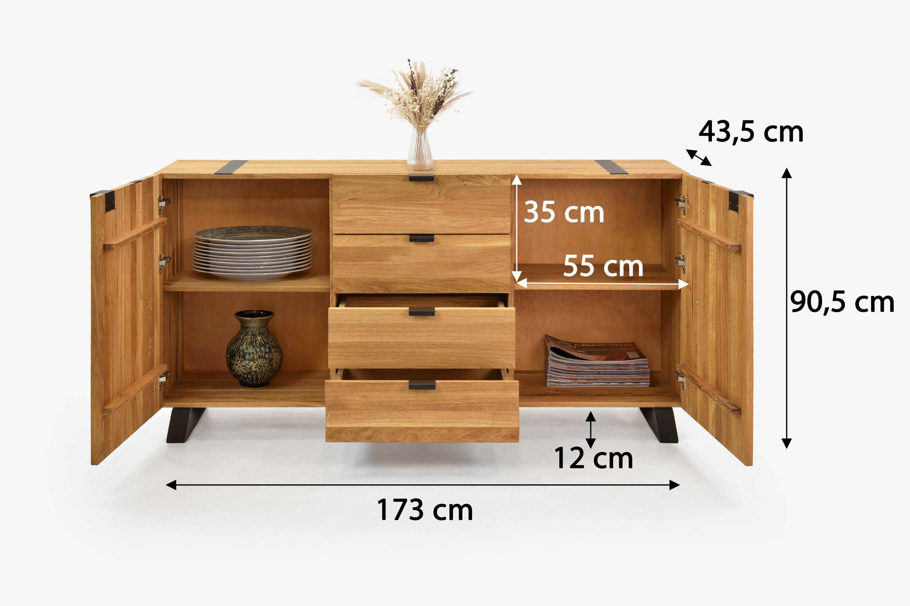Die praktische Unterteilung erfüllt alle Anforderungen an Stauraum: an den Seiten befinden sich Türen mit eingebautem Fach für voluminösere Gegenstände, während der mittlere Bereich vier vollausziehbare Schubladen für Wäsche oder Accessoires bietet. Durch das elegante Design lässt sich die Kommode leicht mit weiteren Stücken aus Eichenmöbeln kombinieren – sei es ein Bett, Nachttische oder eine eichenfarbene TV-Kommode aus derselben Serie. Das Paket erhalten Sie ungmontiert mit ausführlicher Anleitung; zwei Personen bauen sie in kurzer Zeit mit einfachem Werkzeug auf und genießen so Qualität direkt vom Hersteller.