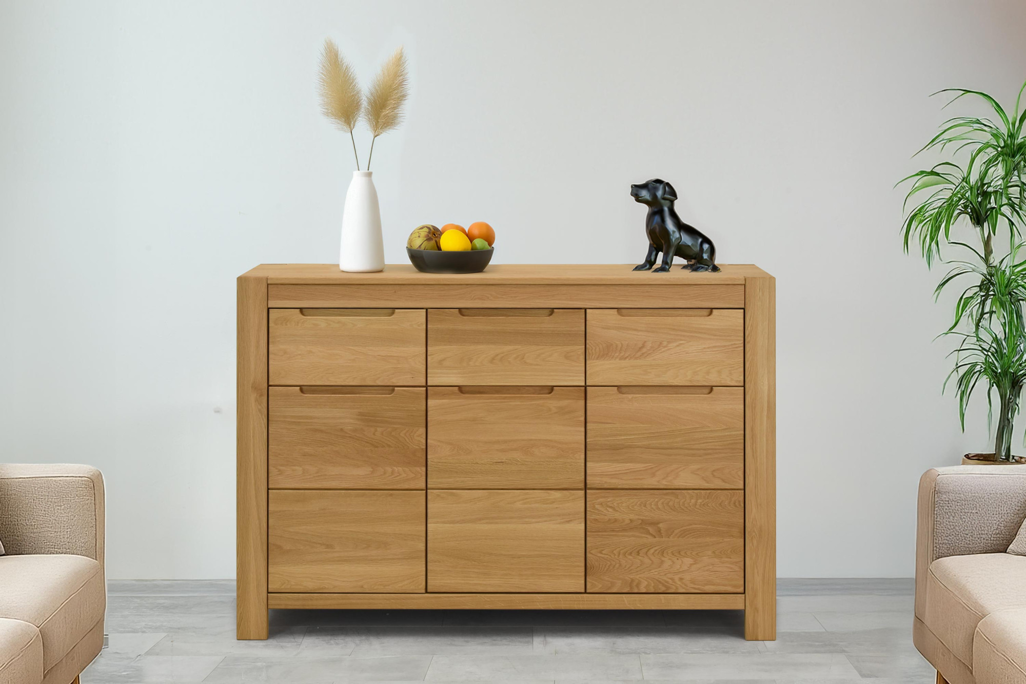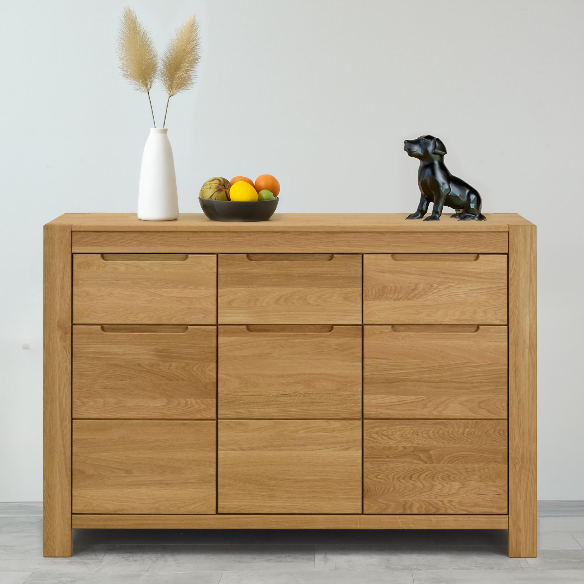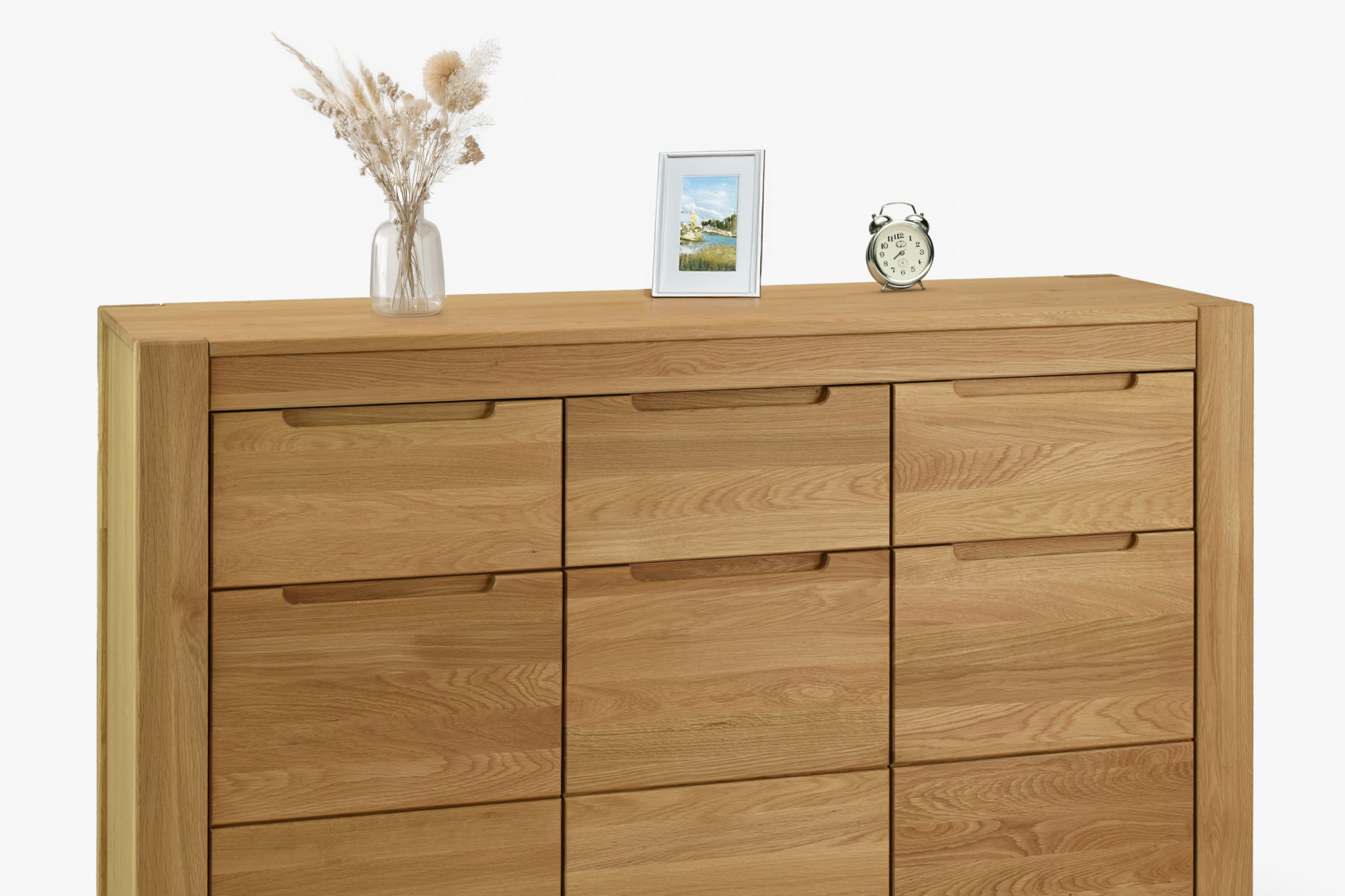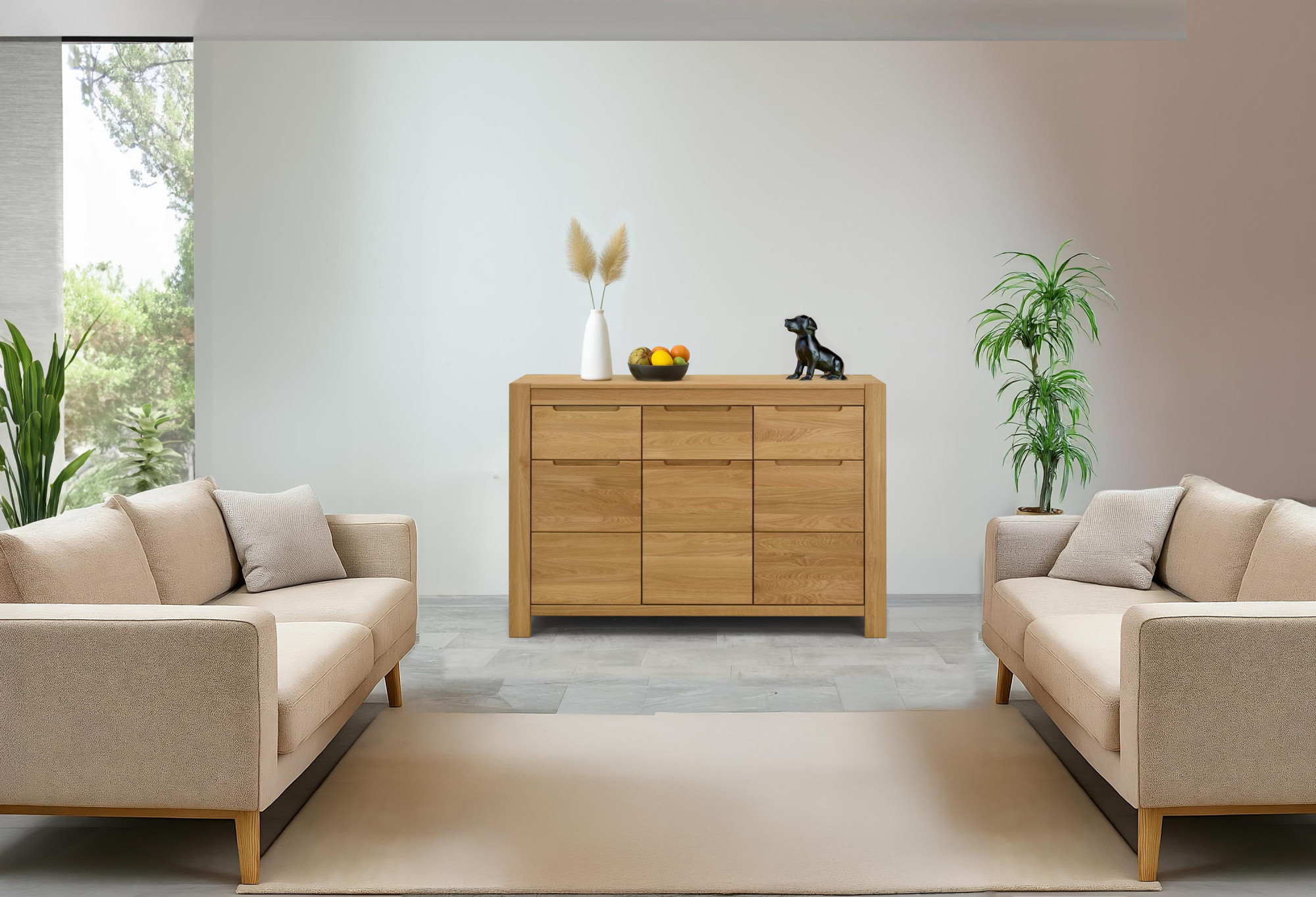 Die Eiche Kommode mit Türen und Schubladen aus der Kollektion Napolen vereint natürliches Aussehen, Praktikabilität und einen günstigen Preis direkt ab Hersteller. Sie bietet drei geräumige Schubladen und drei Türen; hinter jeder Tür finden Sie einen Fachraum für eine übersichtliche Aufbewahrung von Tischwäsche, Geschirr oder Dokumenten. Die eingelassenen (integrierten) Griffmulden stören die klaren Linien nicht und unterstreichen das zeitlose, minimalistische Design, das sich problemlos in moderne sowie traditionelle Innenräume einfügt. Die Oberfläche in der Farbe Eiche Natural ist mit natürlichem Öl behandelt. Alle Türen und Schubladen sind mit einem Soft-Close Mechanismus für leises und schonendes Schließen ausgestattet – besonders geschätzt in Familienhaushalten.
