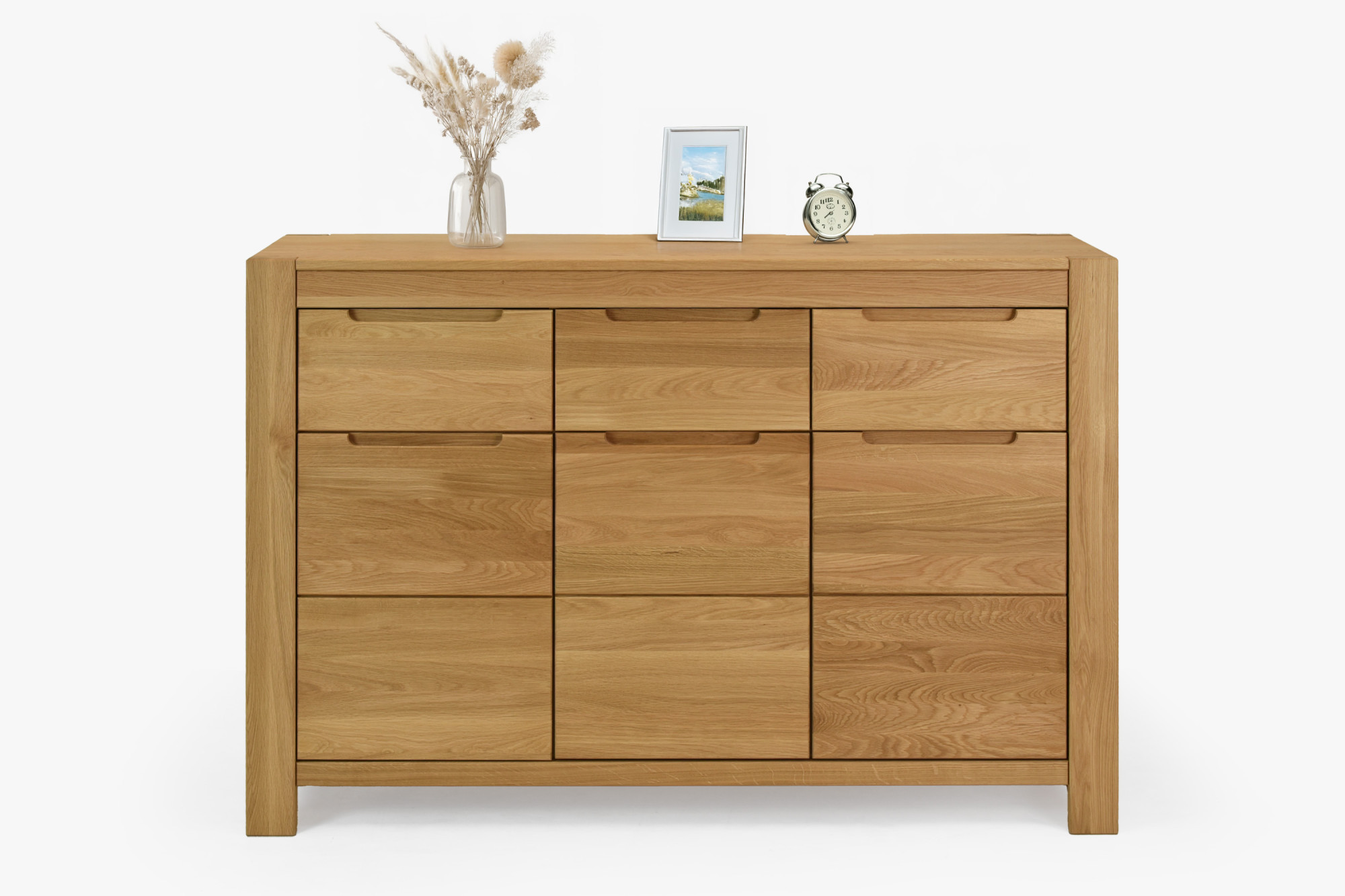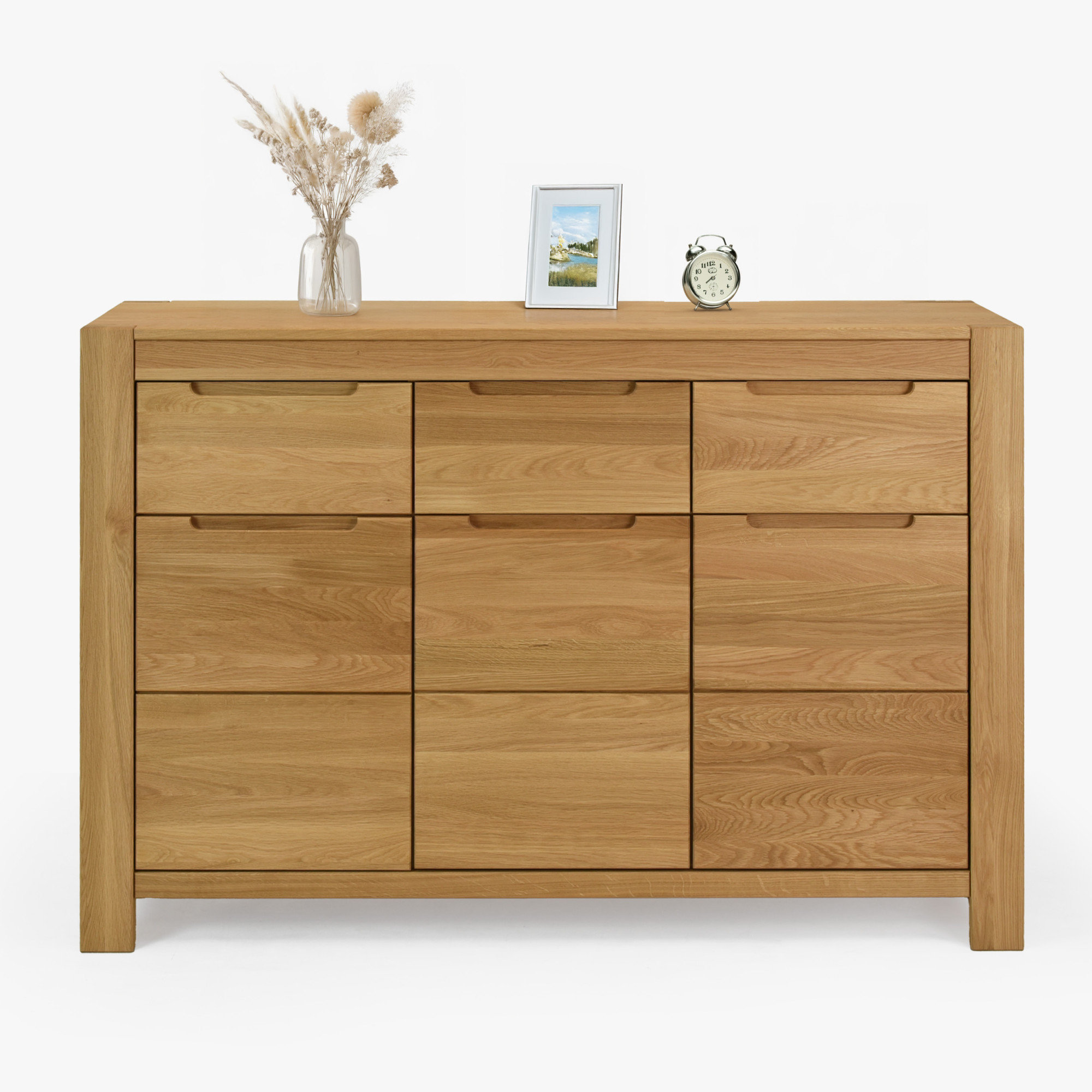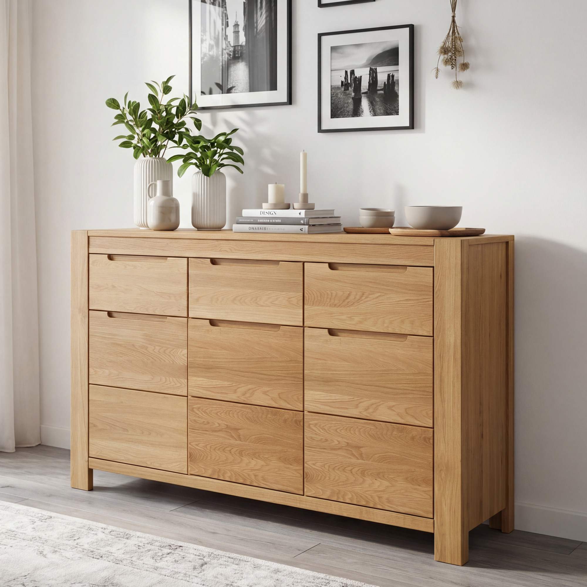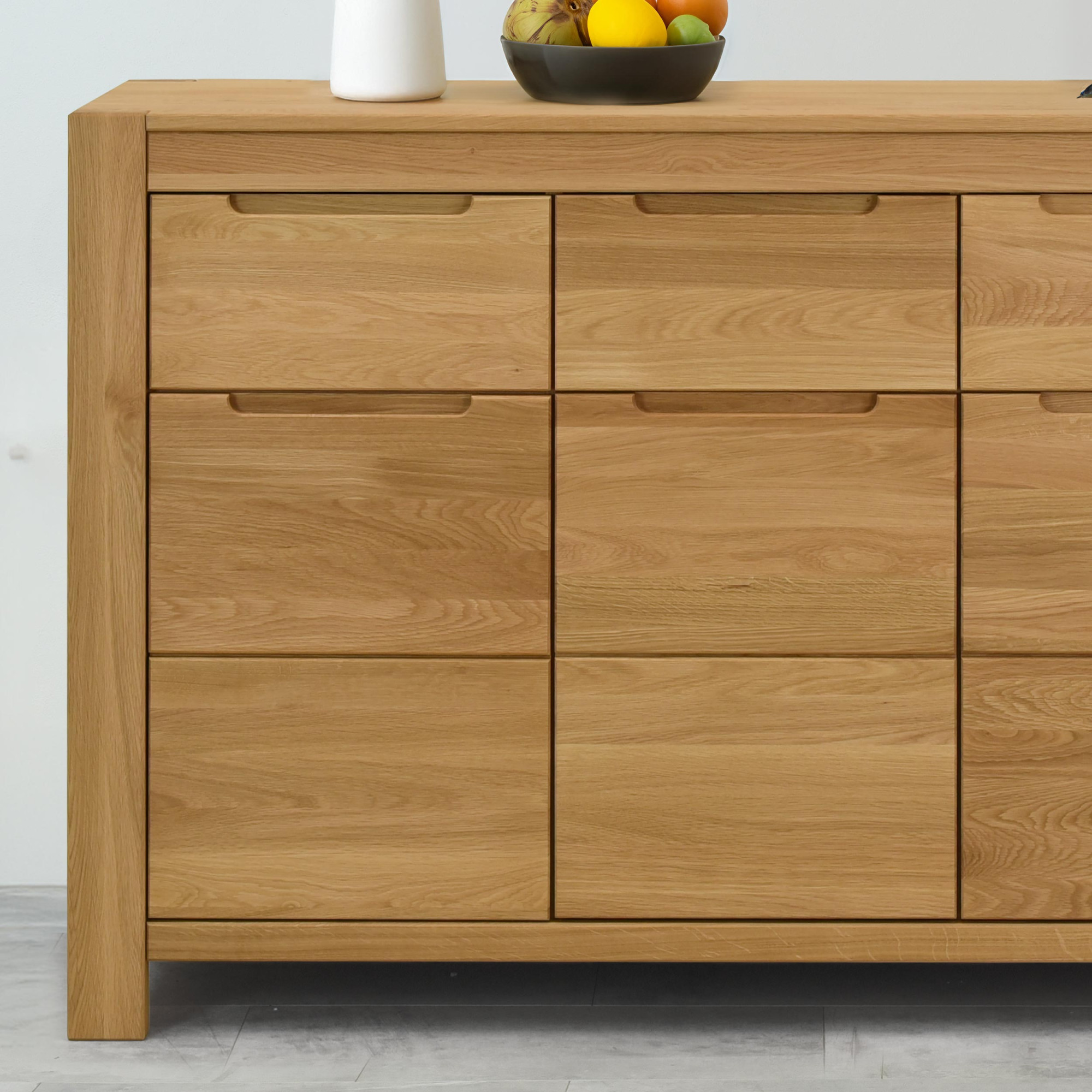 Die Eiche Kommode mit Türen und Schubladen aus der Kollektion Napolen vereint natürliches Aussehen, Praktikabilität und einen günstigen Preis direkt ab Hersteller. Sie bietet drei geräumige Schubladen und drei Türen; hinter jeder Tür finden Sie einen Fachraum für eine übersichtliche Aufbewahrung von Tischwäsche, Geschirr oder Dokumenten. Die eingelassenen (integrierten) Griffmulden stören die klaren Linien nicht und unterstreichen das zeitlose, minimalistische Design, das sich problemlos in moderne sowie traditionelle Innenräume einfügt. Die Oberfläche in der Farbe Eiche Natural ist mit natürlichem Öl behandelt. Alle Türen und Schubladen sind mit einem Soft-Close Mechanismus für leises und schonendes Schließen ausgestattet – besonders geschätzt in Familienhaushalten.