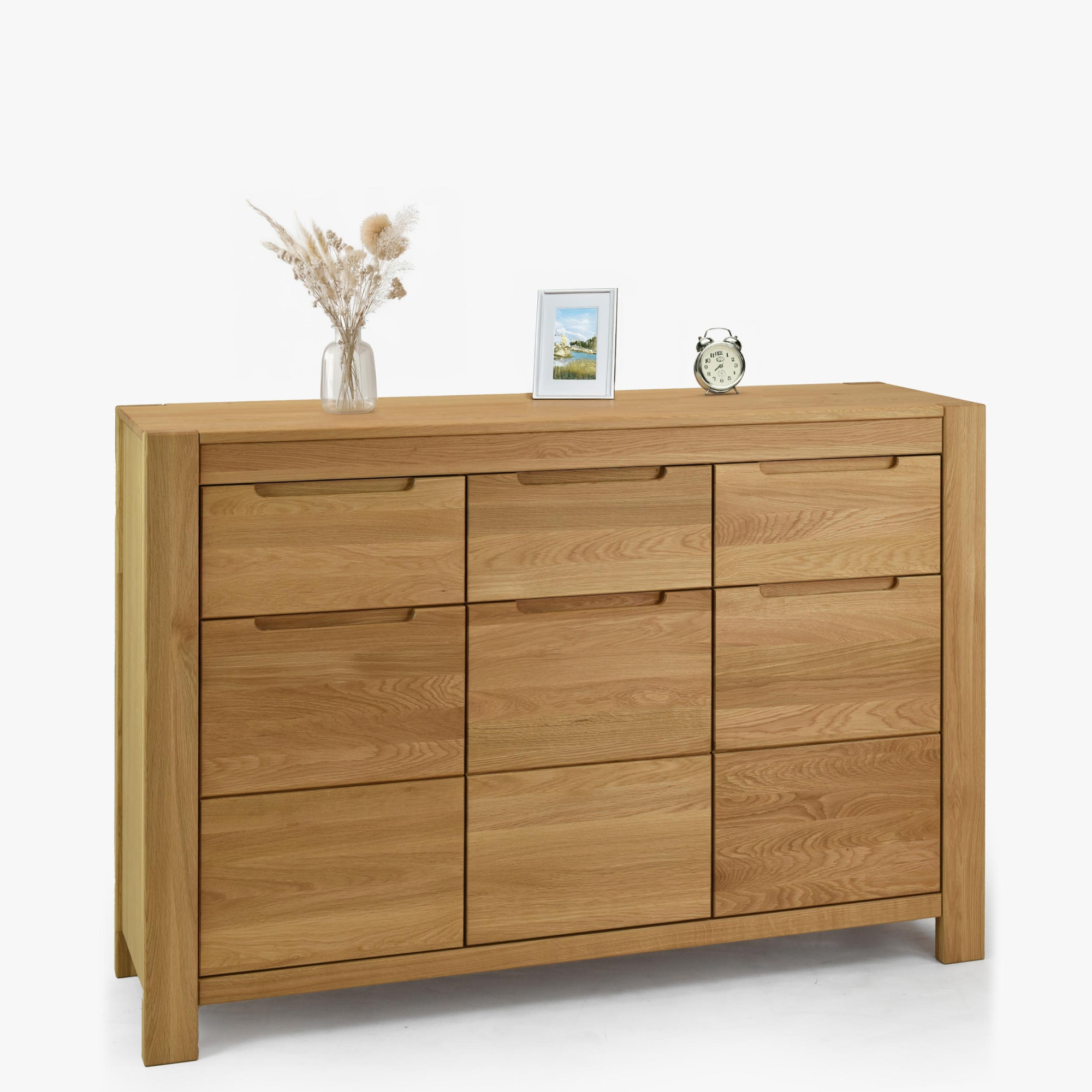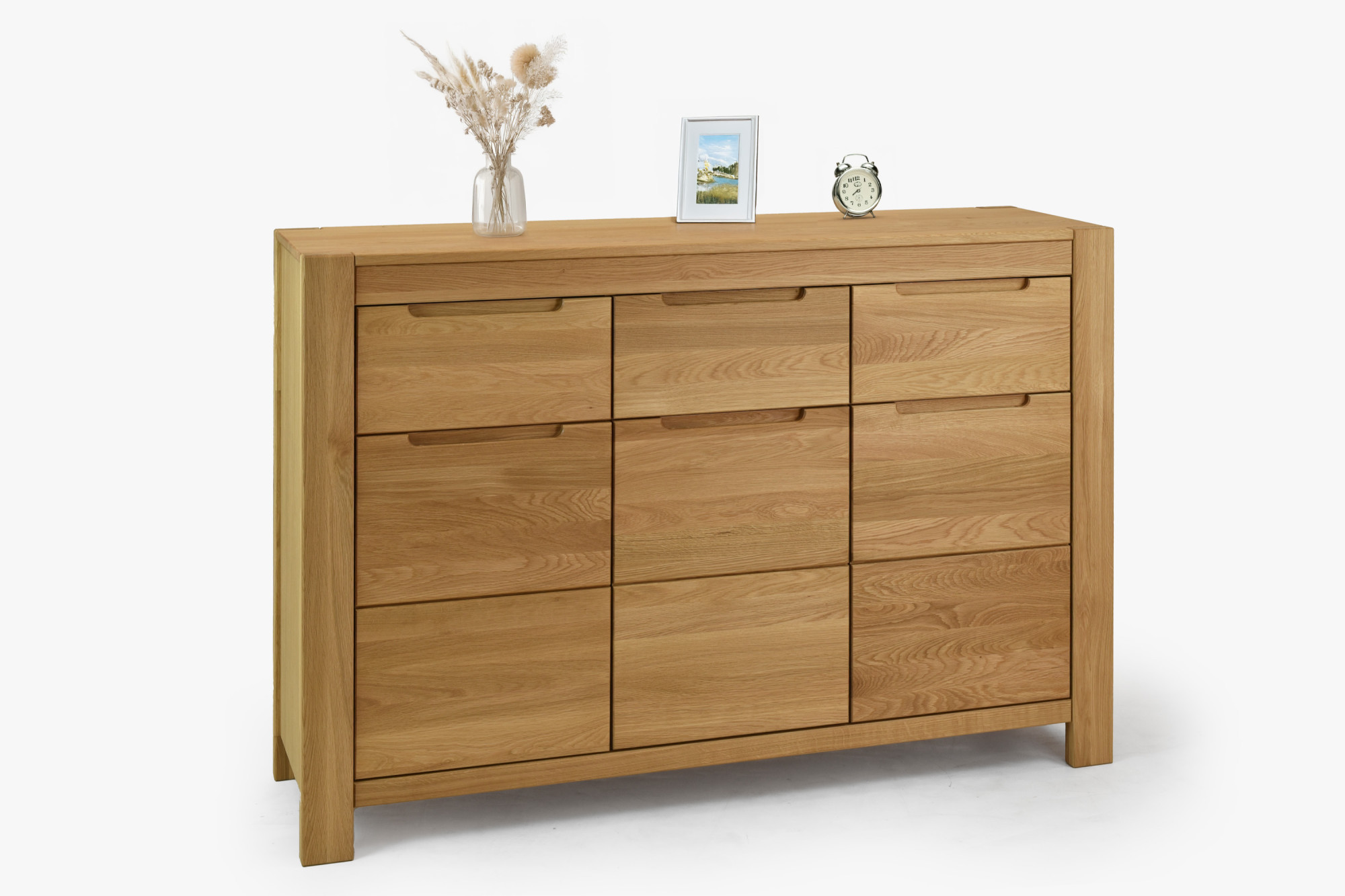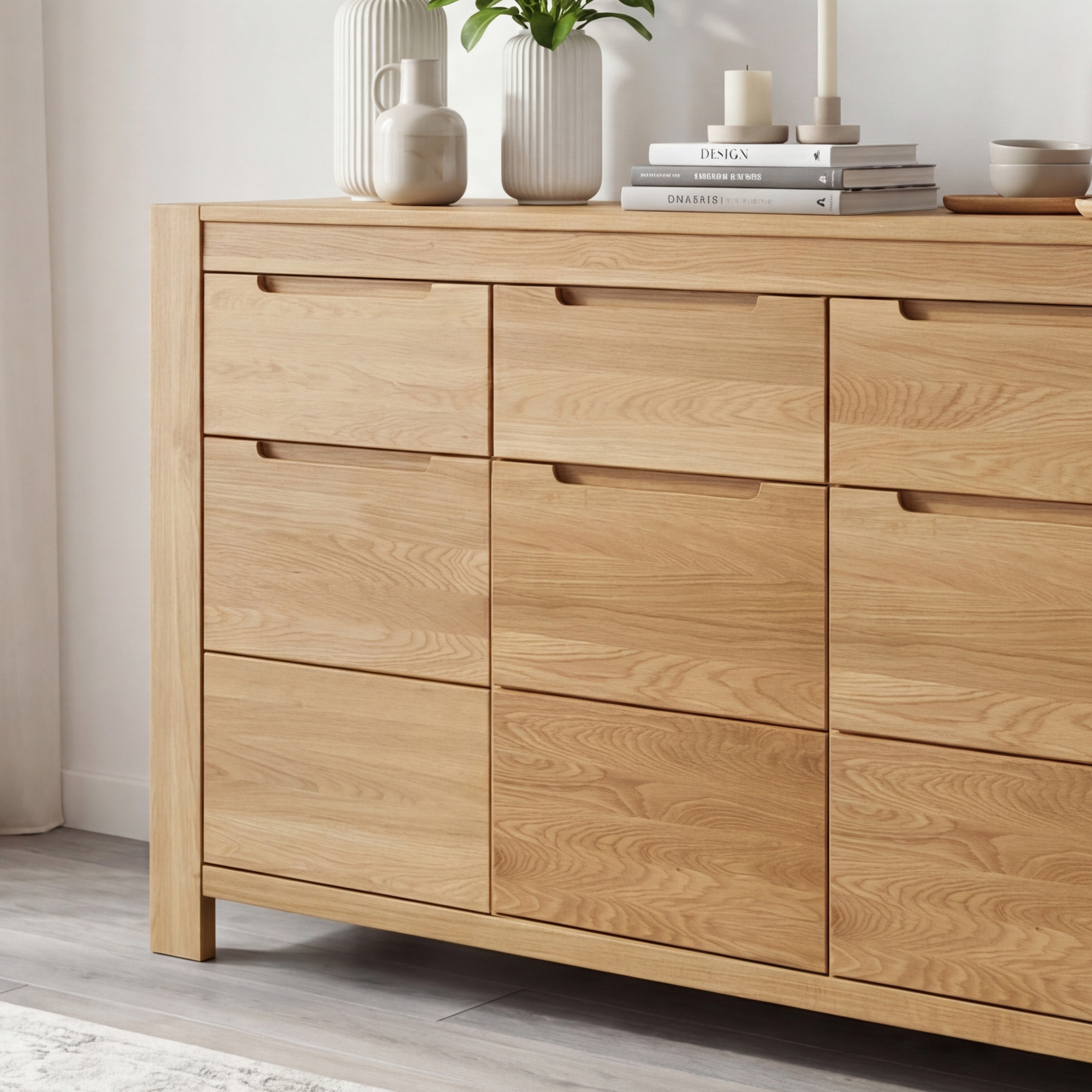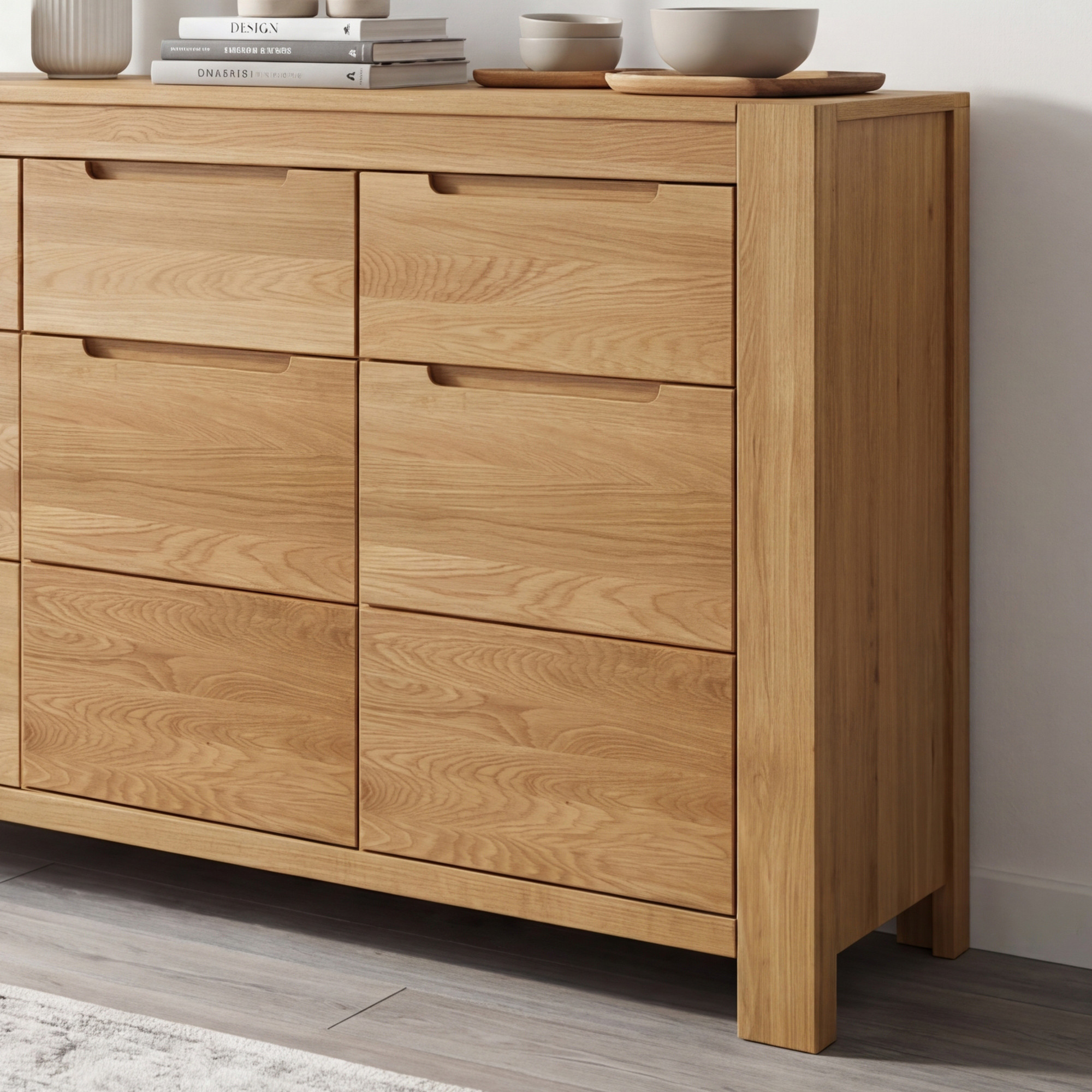 - Antwort: Die Frontflächen, die obere Platte und alle Beine sind aus vollmassivem Eichenholz gefertigt. Die Seiten und sichtbaren Innenbereiche bestehen aus hochwertigem Eichenfurnier auf stabilem Untergrund. Verborgene Konstruktionskomponenten können aus Eiche-Folie bestehen – eine Lösung, die Gewicht und Preis ohne Leistungsverlust optimiert.