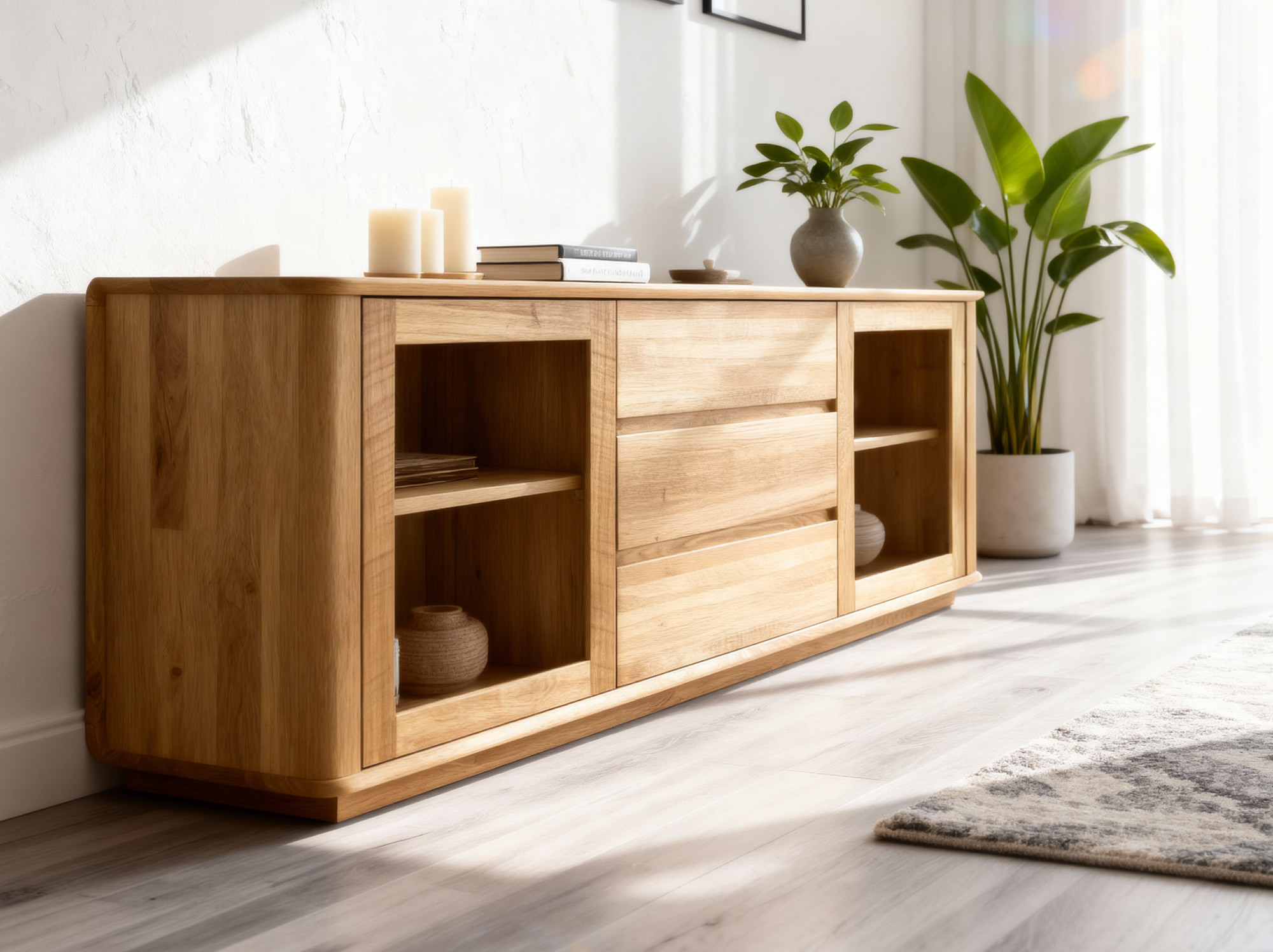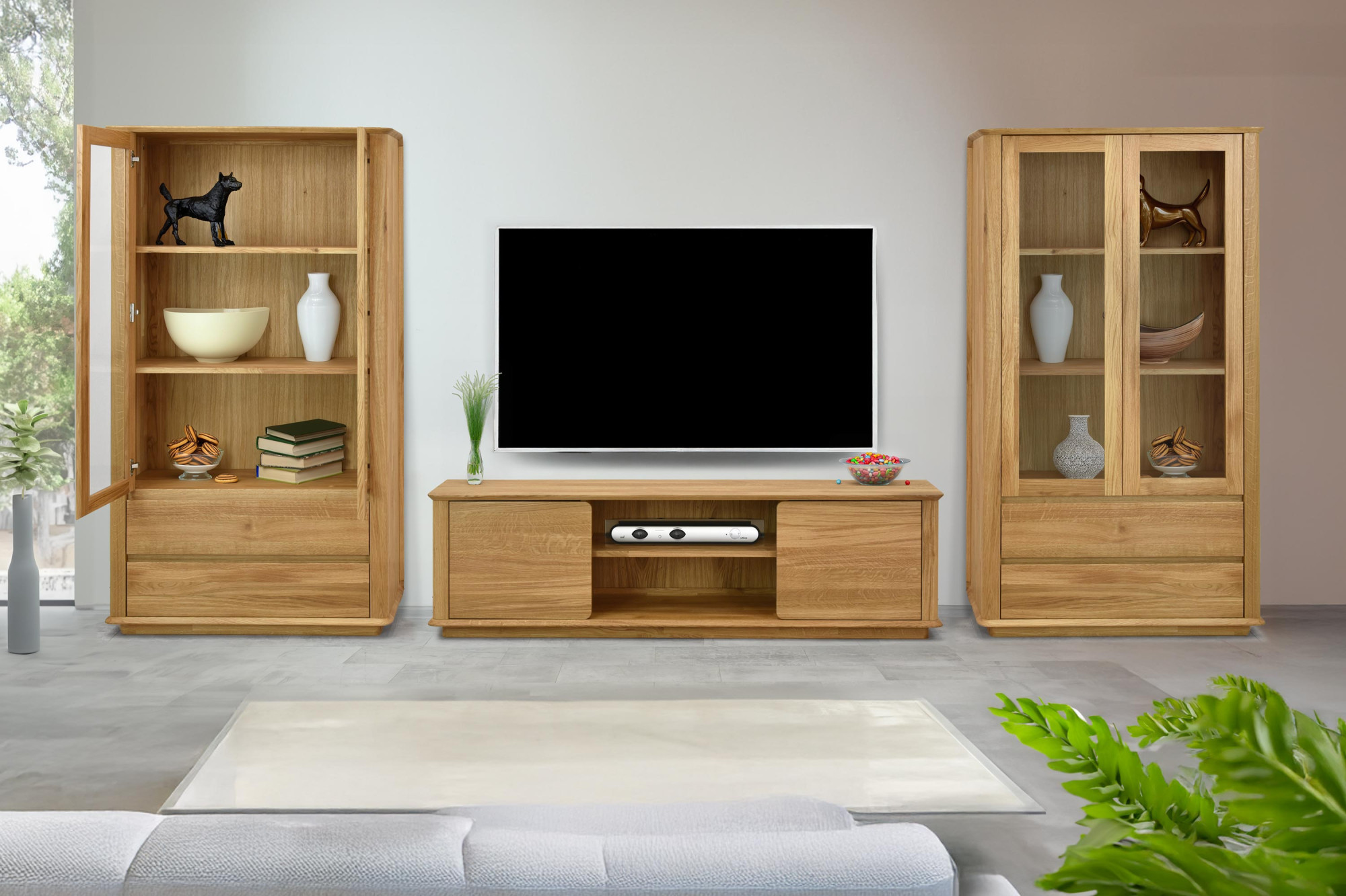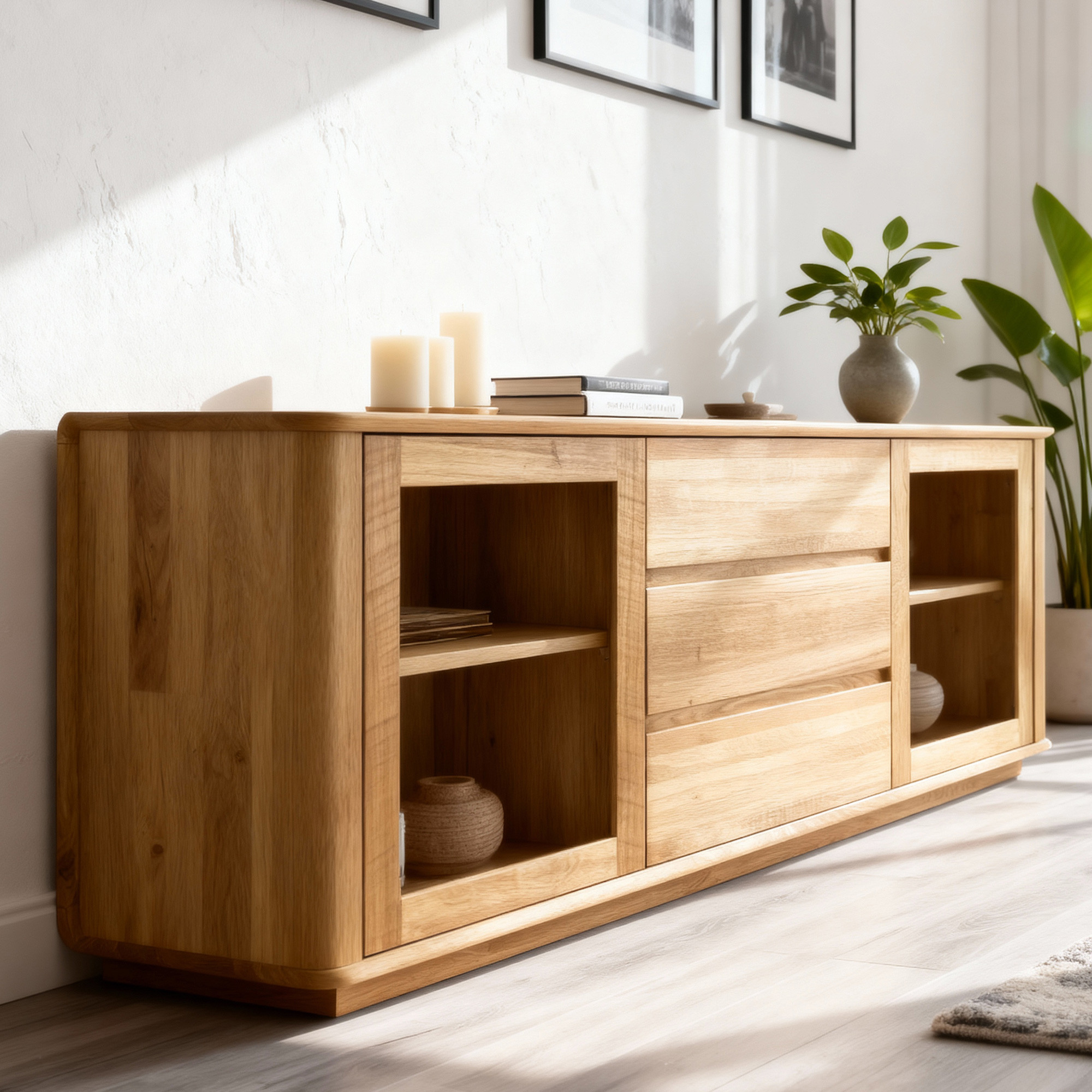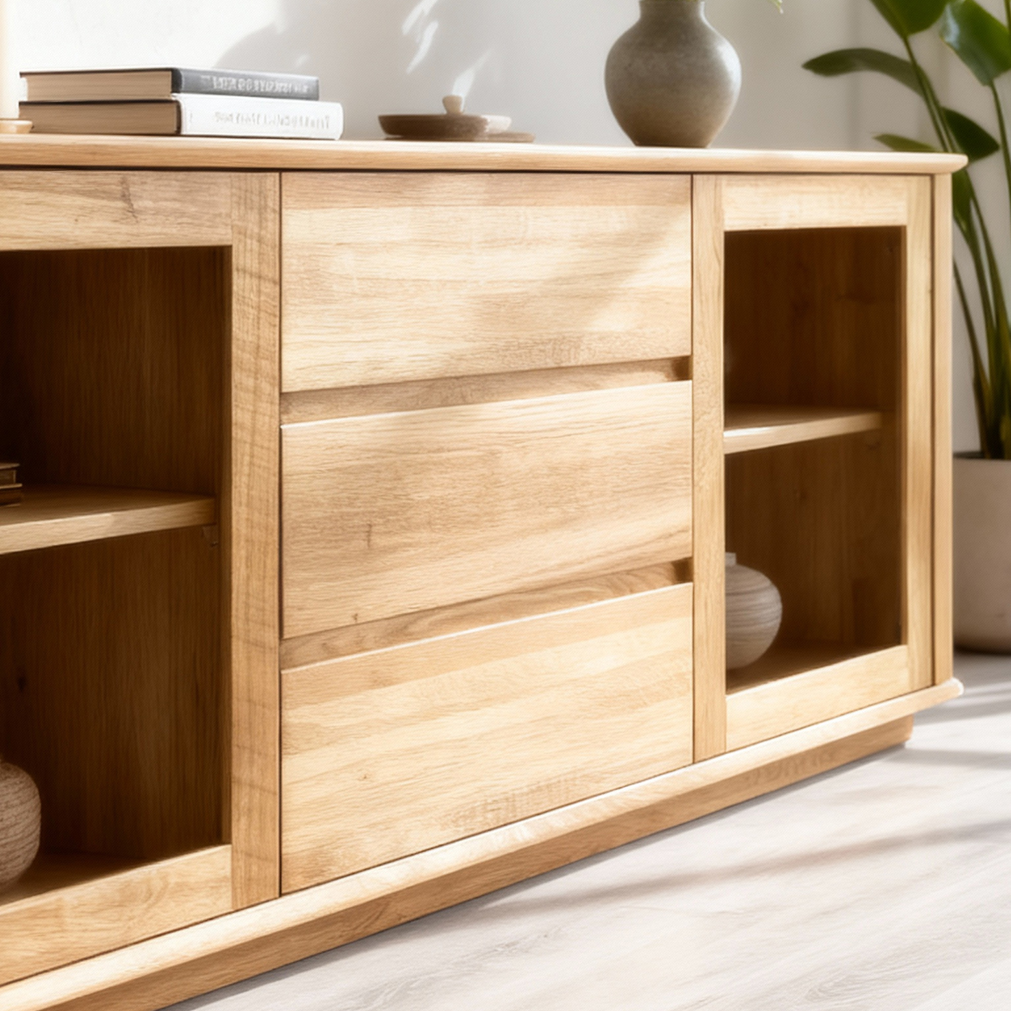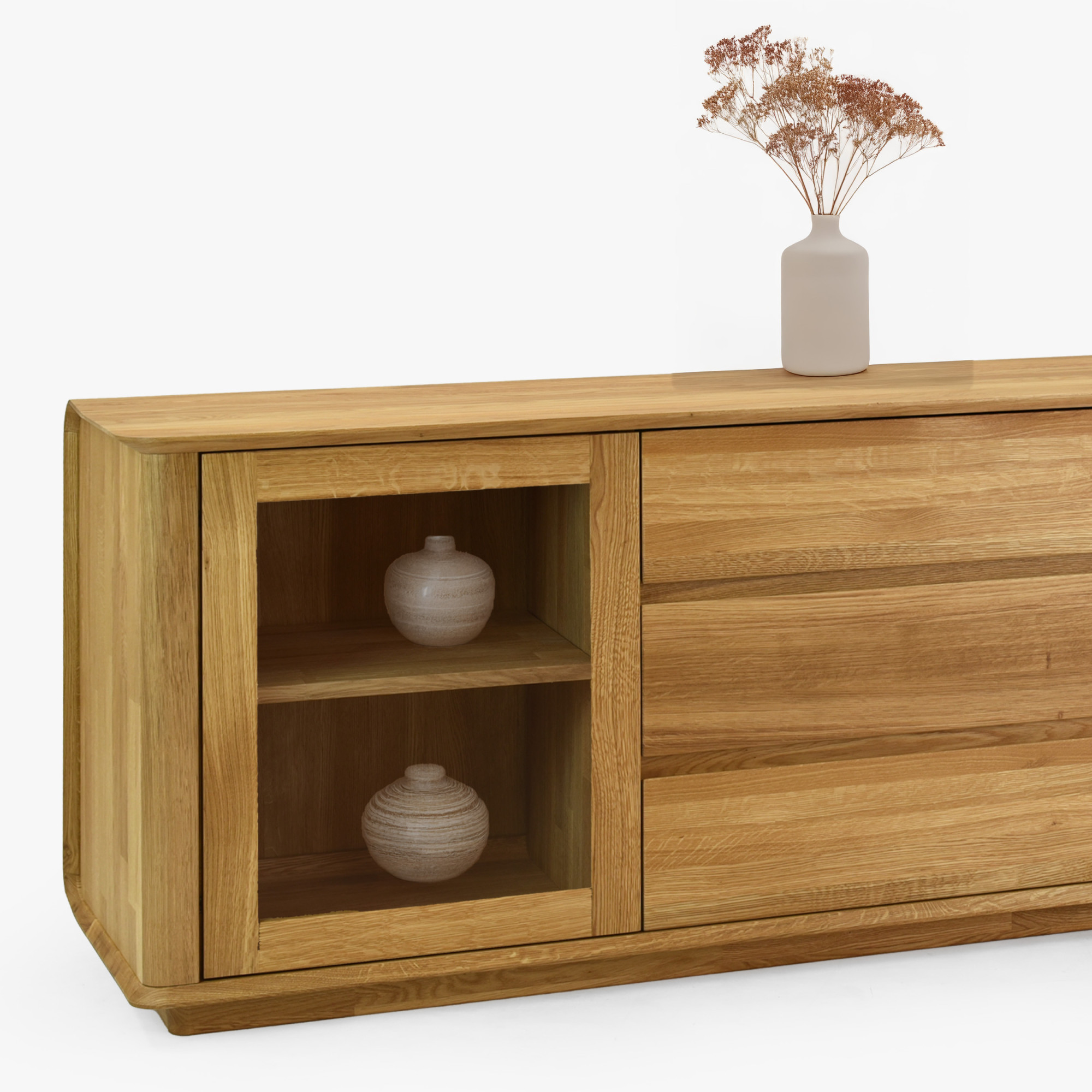 Entdecken Sie die Kraft des natürlichen Materials und holen Sie sich eine premium Eichen-TV-Kommode Monaco, die zum Blickfang Ihres Interieurs wird. Dank FSC-Zertifizierung und Vollholzkonstruktion erhalten Sie Möbel, die durch Langlebigkeit, Schönheit und ökologische Verantwortung überzeugen. Drei geräumige Schubladen und verglaste Aufbewahrungsmöglichkeiten bringen nicht nur Stil, sondern auch Praktikabilität in Ihr Zuhause.