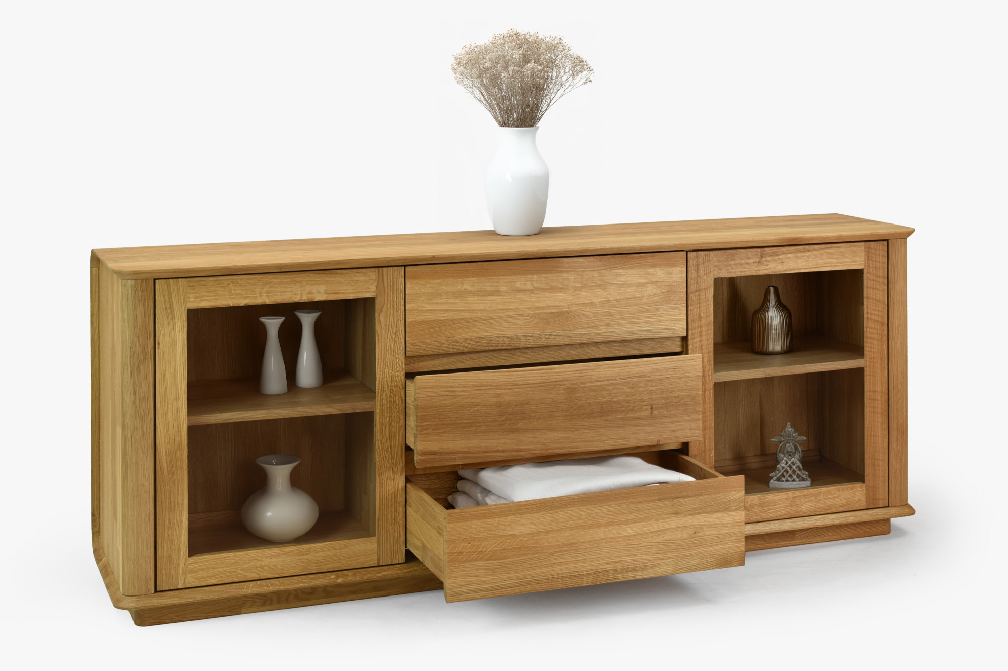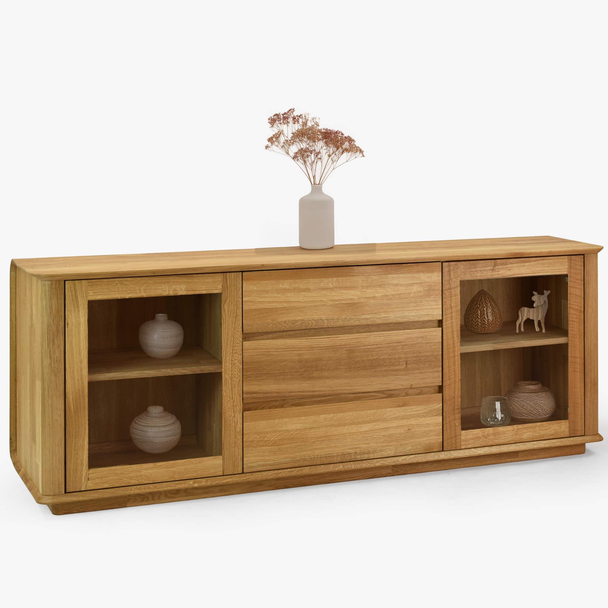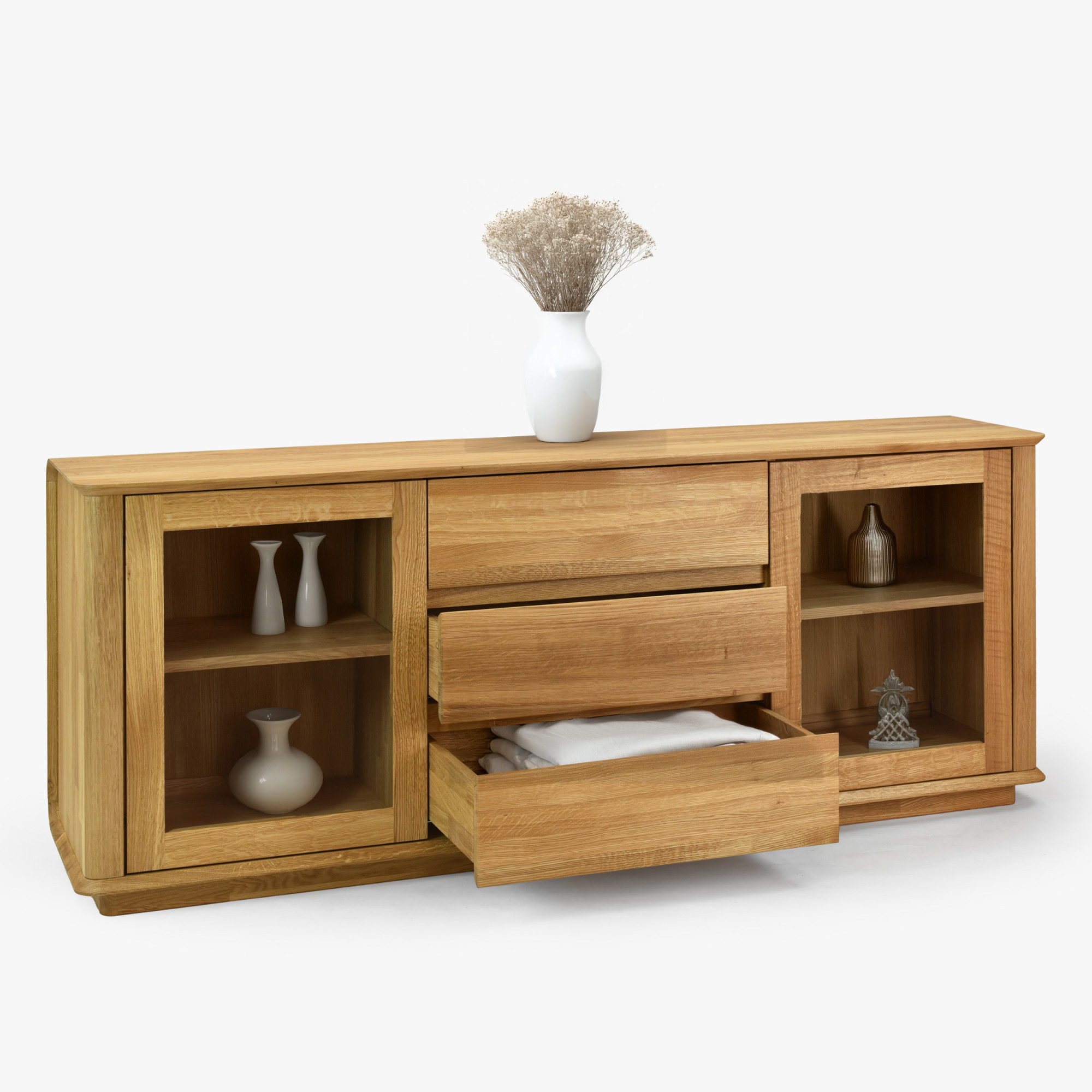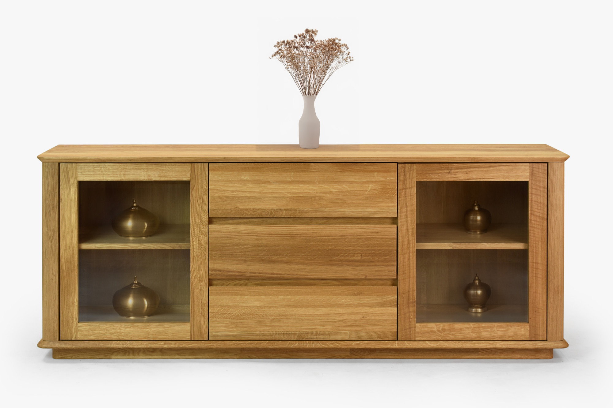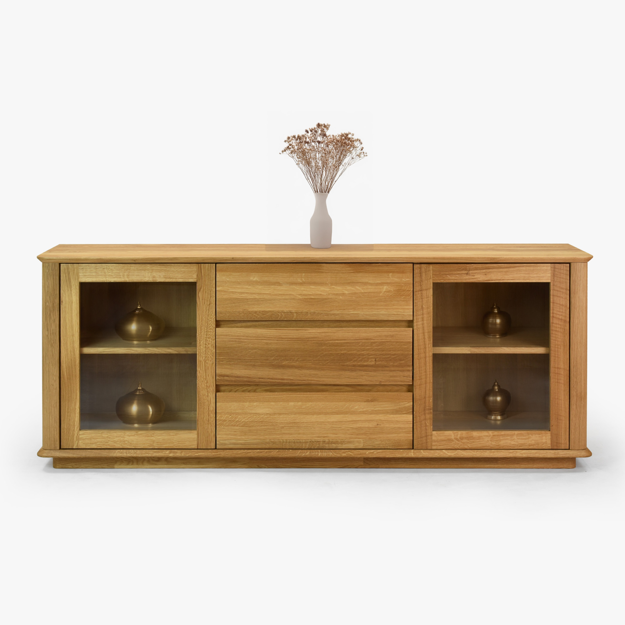 Premium-Eichenkommode Monaco ist die perfekte Wahl für alle, die hochwertigen, designorientierten und zugleich preislich erschwinglichen Möbel aus natürlichen Materialien suchen. Diese Eichenkommode für das Schlafzimmer oder Wohnzimmer bietet an den Seiten Glastüren mit einem inneren Holzregal, ideal zum Präsentieren von Dekorationen oder zur Aufbewahrung von Büchern und anderen wertvollen Gegenständen. Der mittlere Teil der Kommode besteht aus drei geräumigen Schubladen, die reichlich Stauraum für Wäsche, Dokumente oder andere Haushaltsgegenstände bieten. Jedes Detail ist präzise verarbeitet – die effektvolle Abrundung der Ecken unterstreicht das luxuriöse Aussehen und erhöht die Sicherheit im Haushalt.