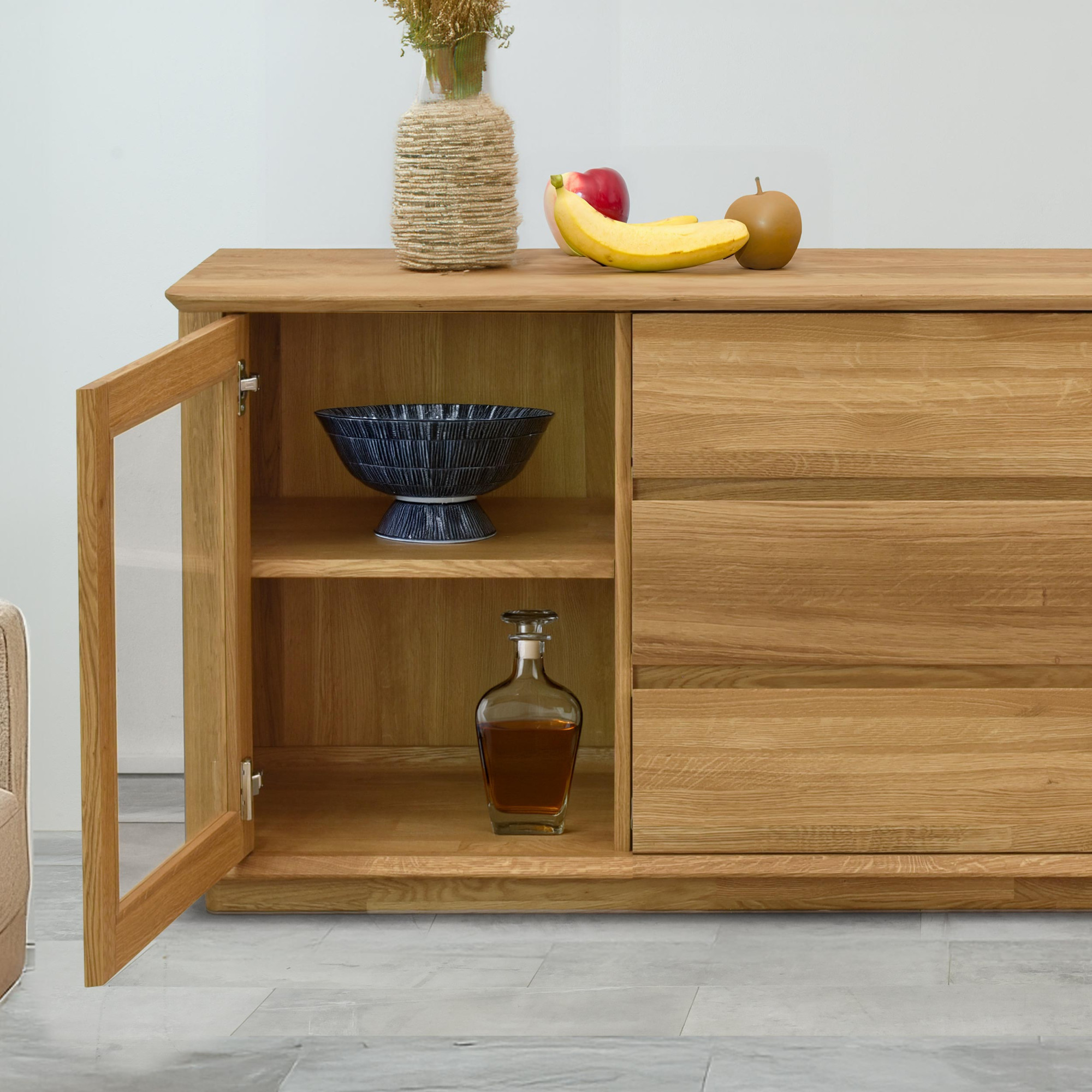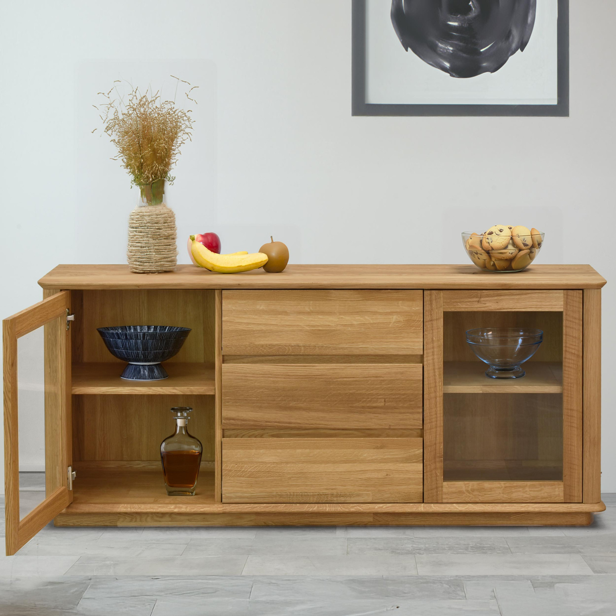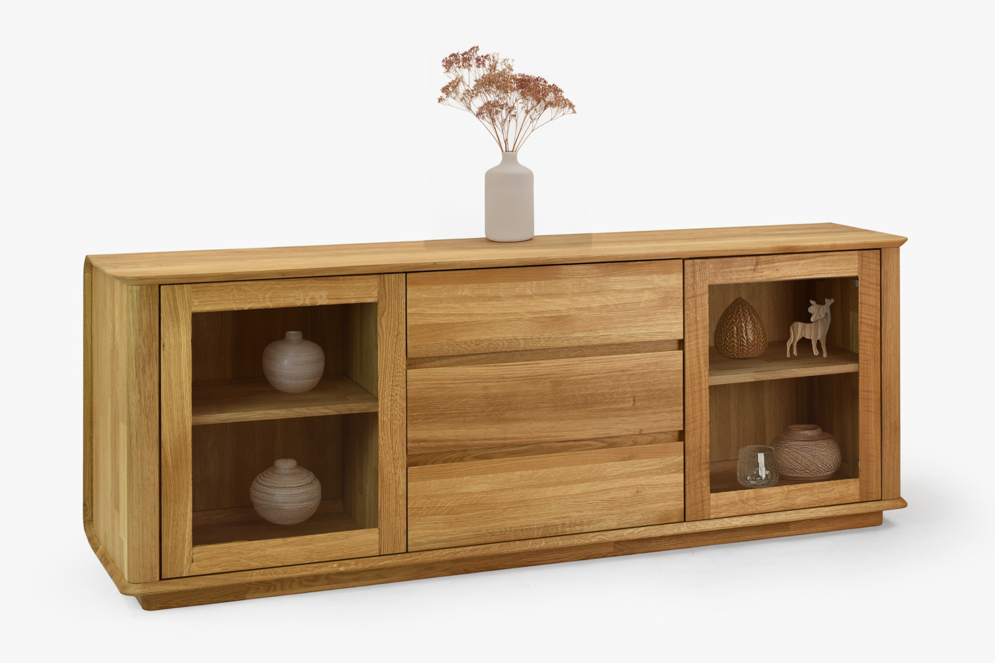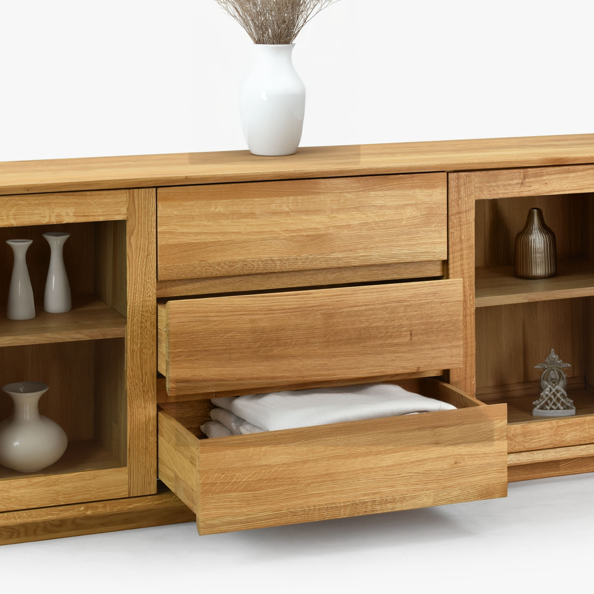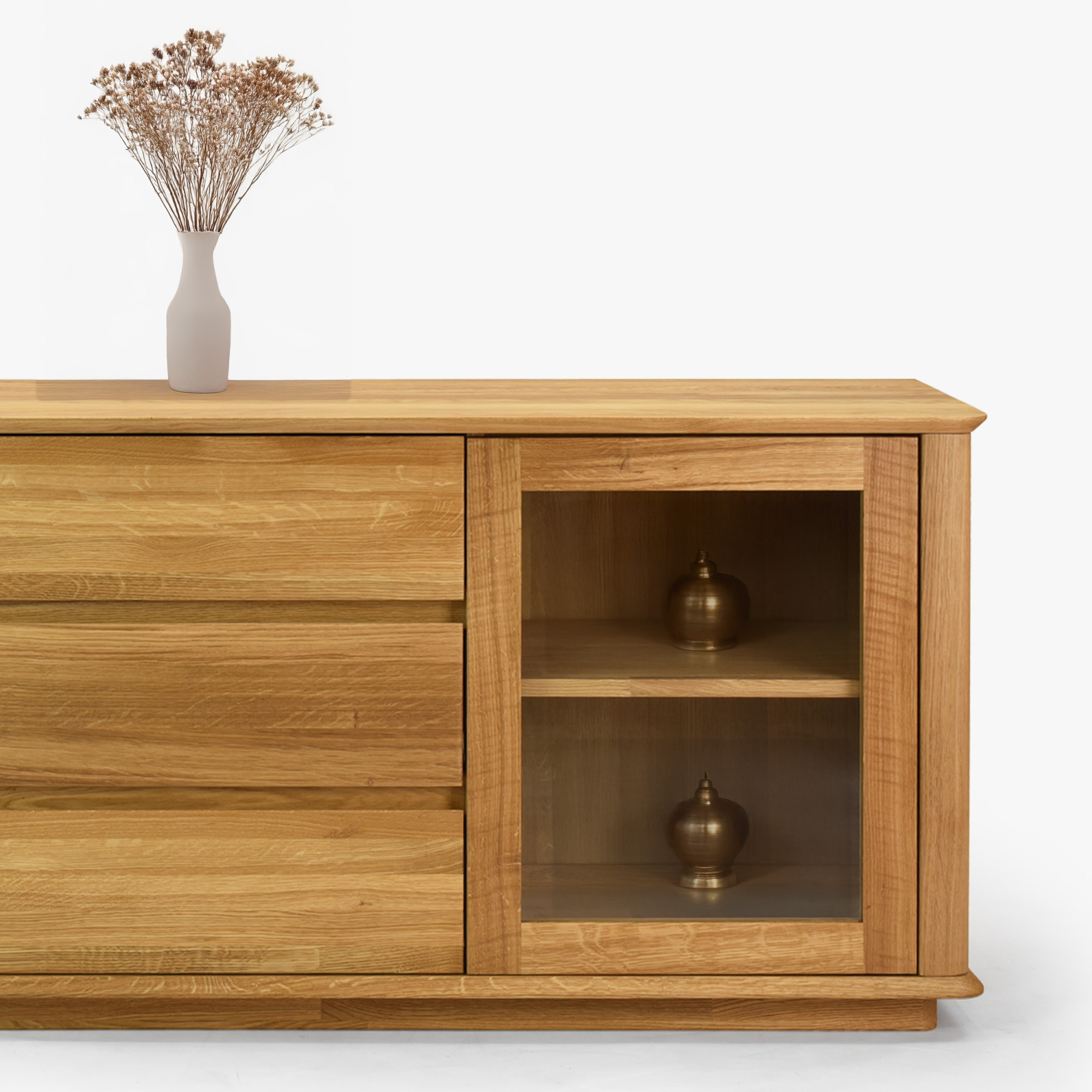 Eichenkommode mit Glastüren und Schubladen, naturholz