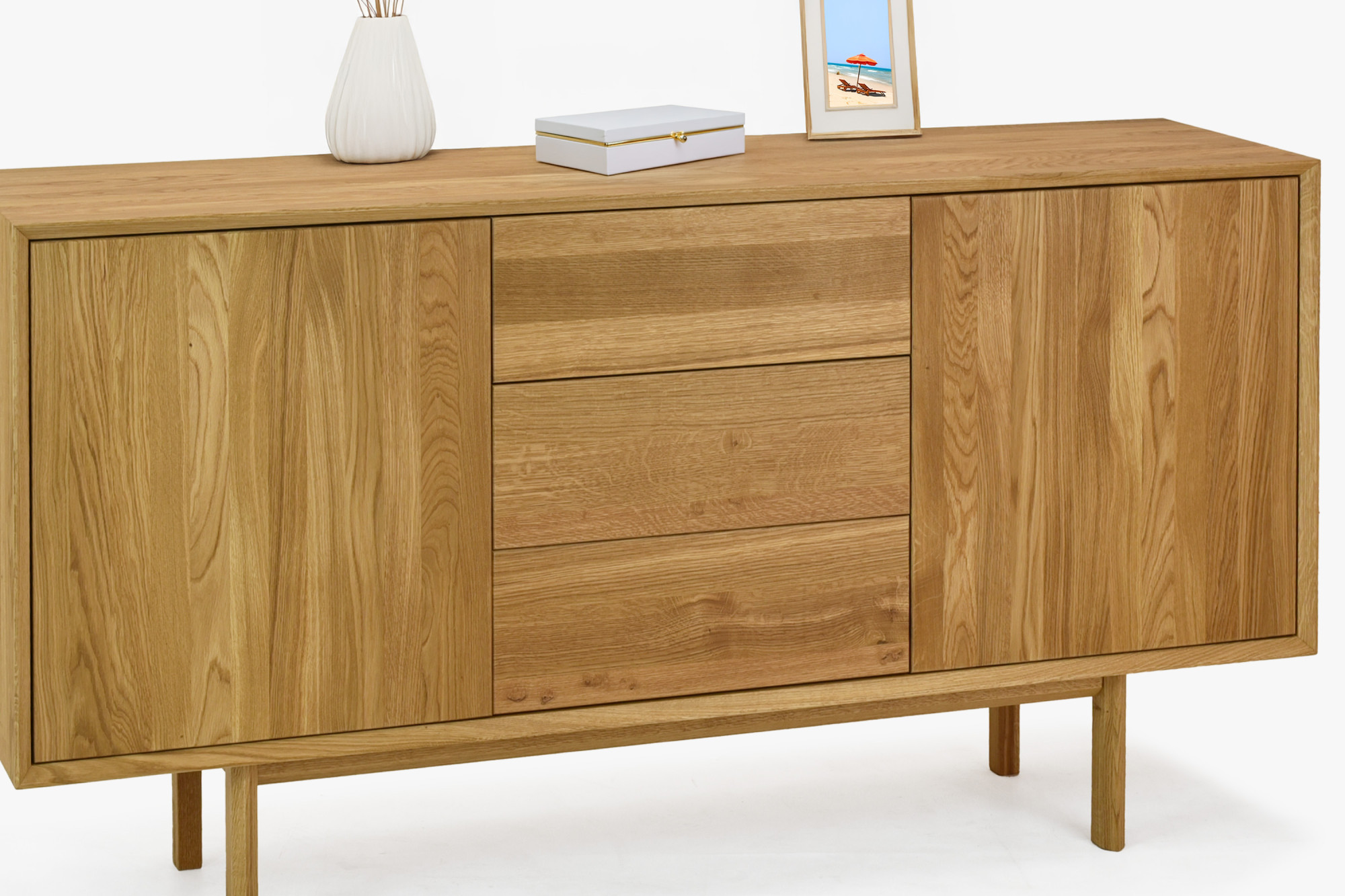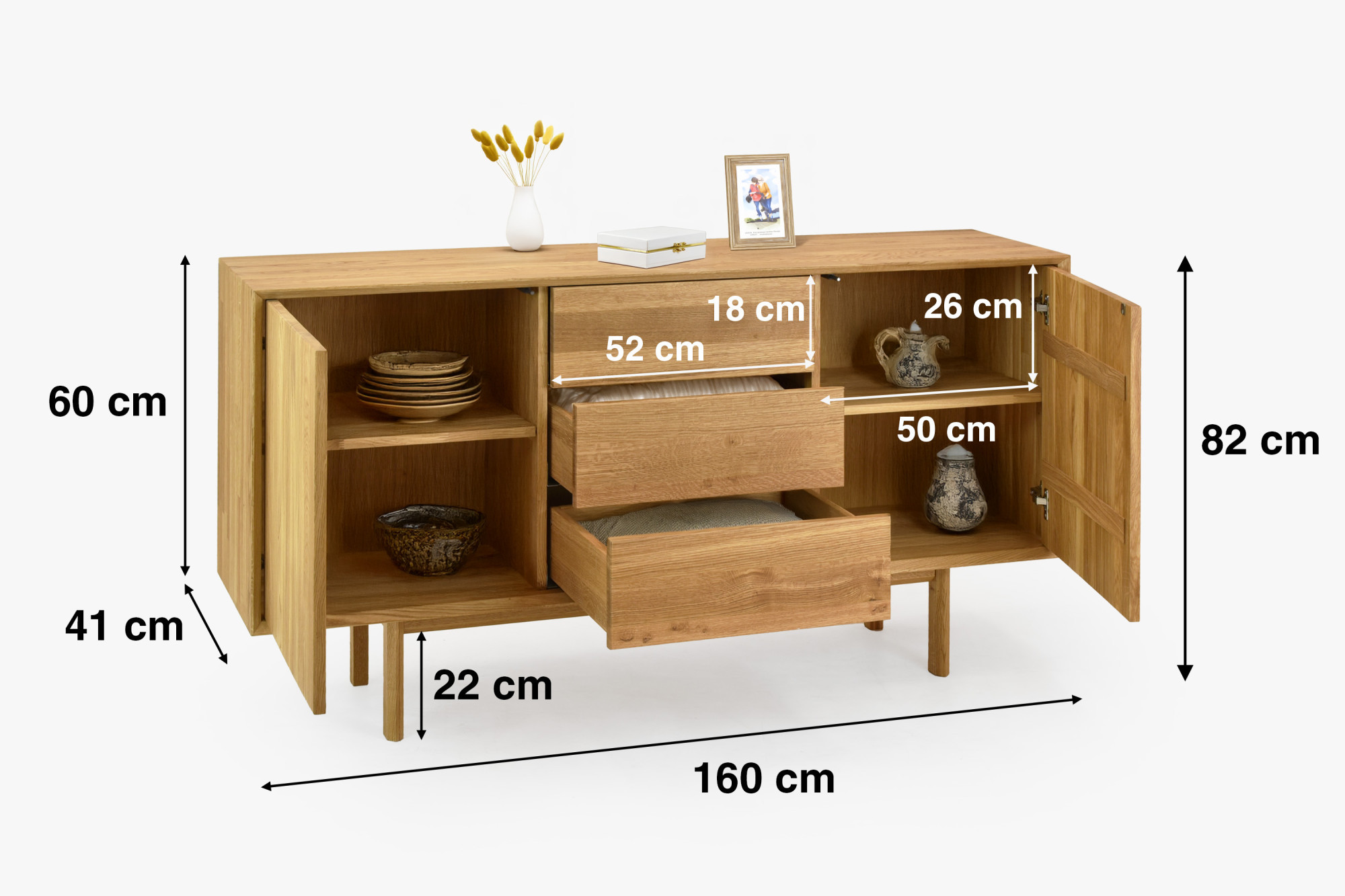 Dieses Modell gehört zur Oslo-Kollektion, die moderndes skandinavisches Design mit sorgfältiger handwerklicher Verarbeitung verbindet. Das verwendete Holz trägt das FSC-Zertifikat, das garantiert, dass es aus verantwortungsvollen und nachhaltigen Quellen stammt. Das Tip-on Öffnungssystem für Schubladen und Türen sorgt für maximalen Komfort – einfach leicht drücken und der Mechanismus erledigt den Rest. Die Kommode wird vollständig montiert geliefert und kann perfekt mit weiteren Möbeln aus massivem Eichenholz kombiniert werden. Es ist ein Stück, das Funktionalität, Ästhetik und Qualität direkt vom Hersteller vereint.