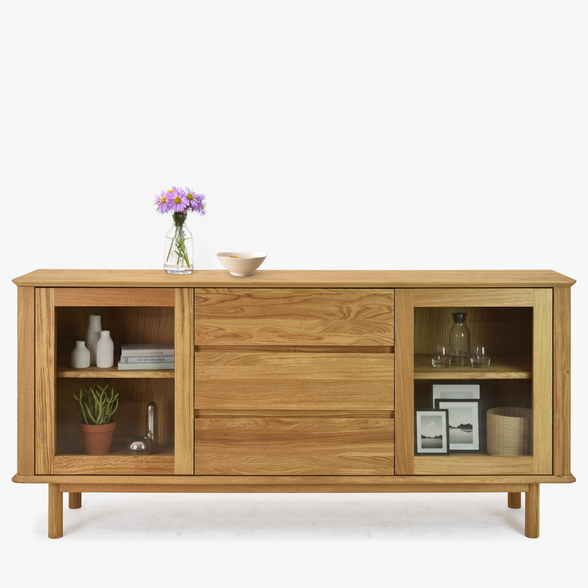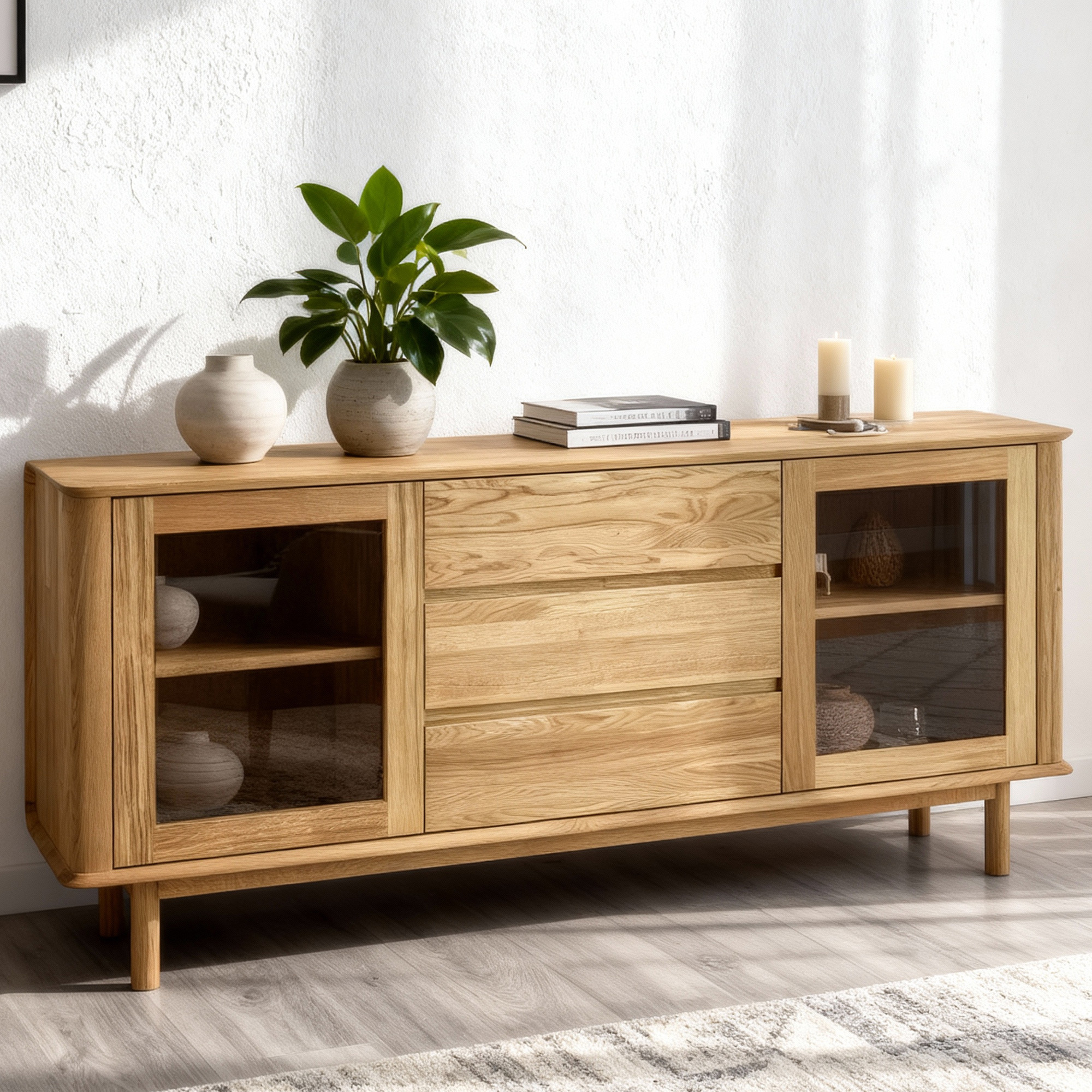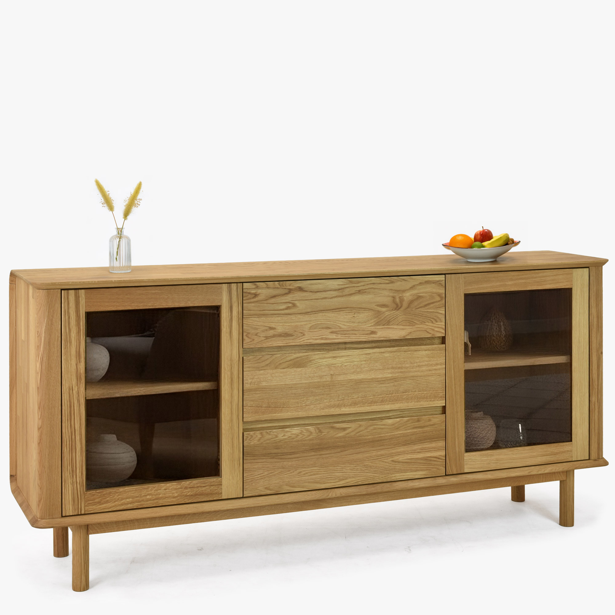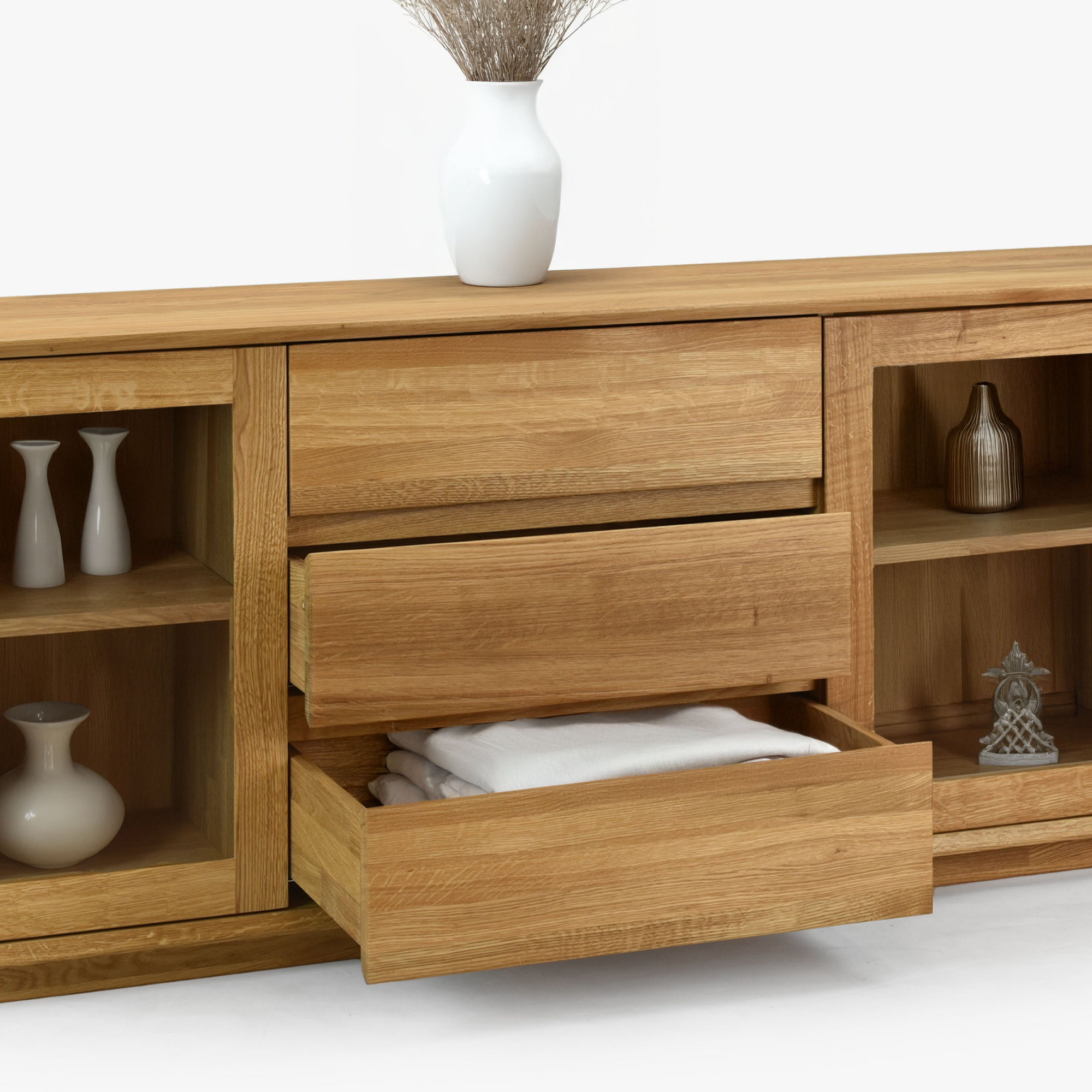 Premium Eichenkommode Monaco ist die perfekte Wahl für alle, die hochwertigen, designorientierten und gleichzeitig preiswerten Möbel aus Naturmaterial suchen. Diese Eichenkommode fürs Schlafzimmer oder Wohnzimmer bietet seitlich Glastüren mit innerem Holzboden, ideal zum Präsentieren von Dekorationen oder zum Aufbewahren von Büchern und anderen Wertgegenständen. Der mittlere Teil der Kommode besteht aus drei geräumigen Schubladen, die ausreichend Stauraum für Wäsche, Dokumente oder andere Haushaltsgegenstände bieten. Jedes Detail ist präzise verarbeitet – die effektvollen abgerundeten Ecken unterstreichen das luxuriöse Aussehen und erhöhen die Sicherheit im Haushalt.