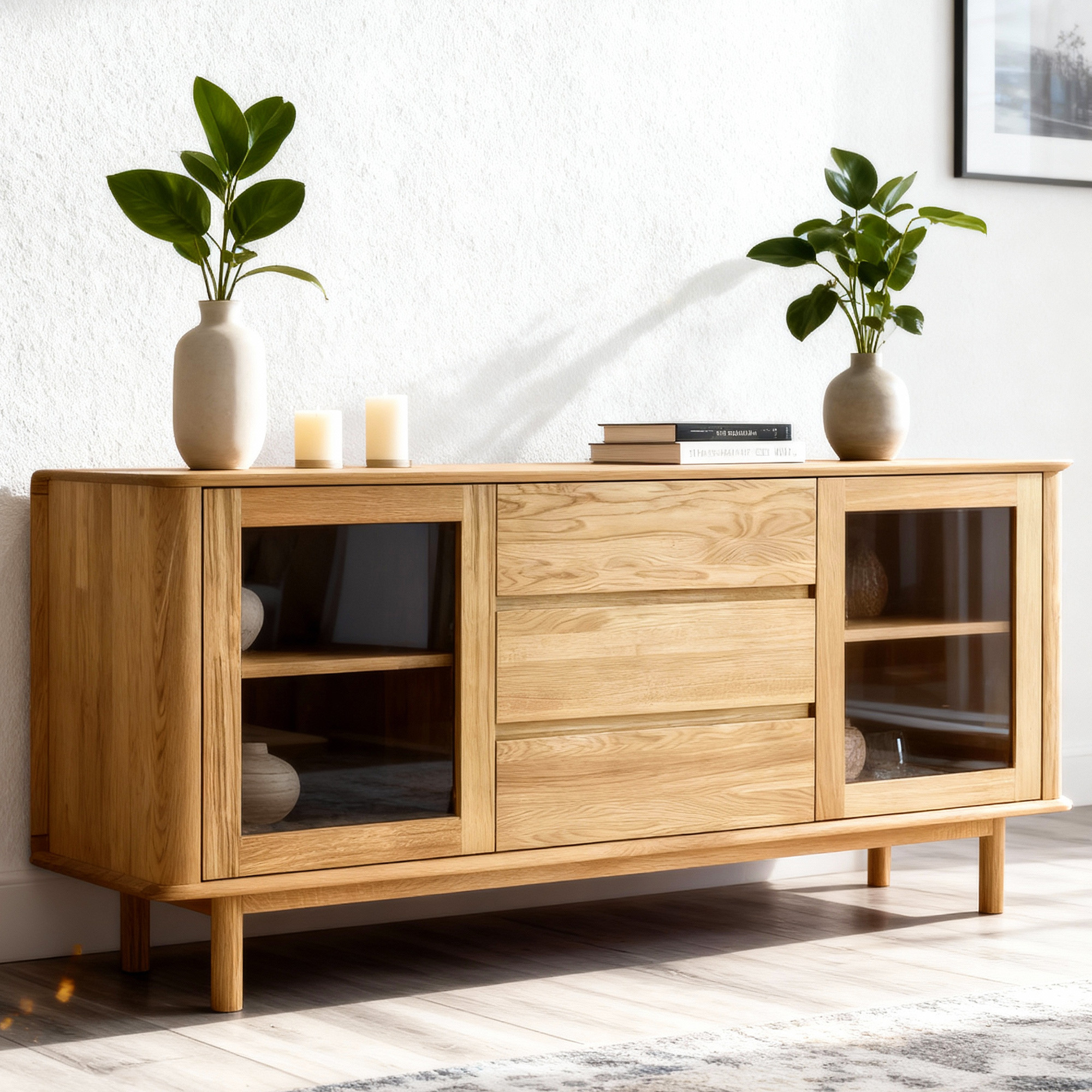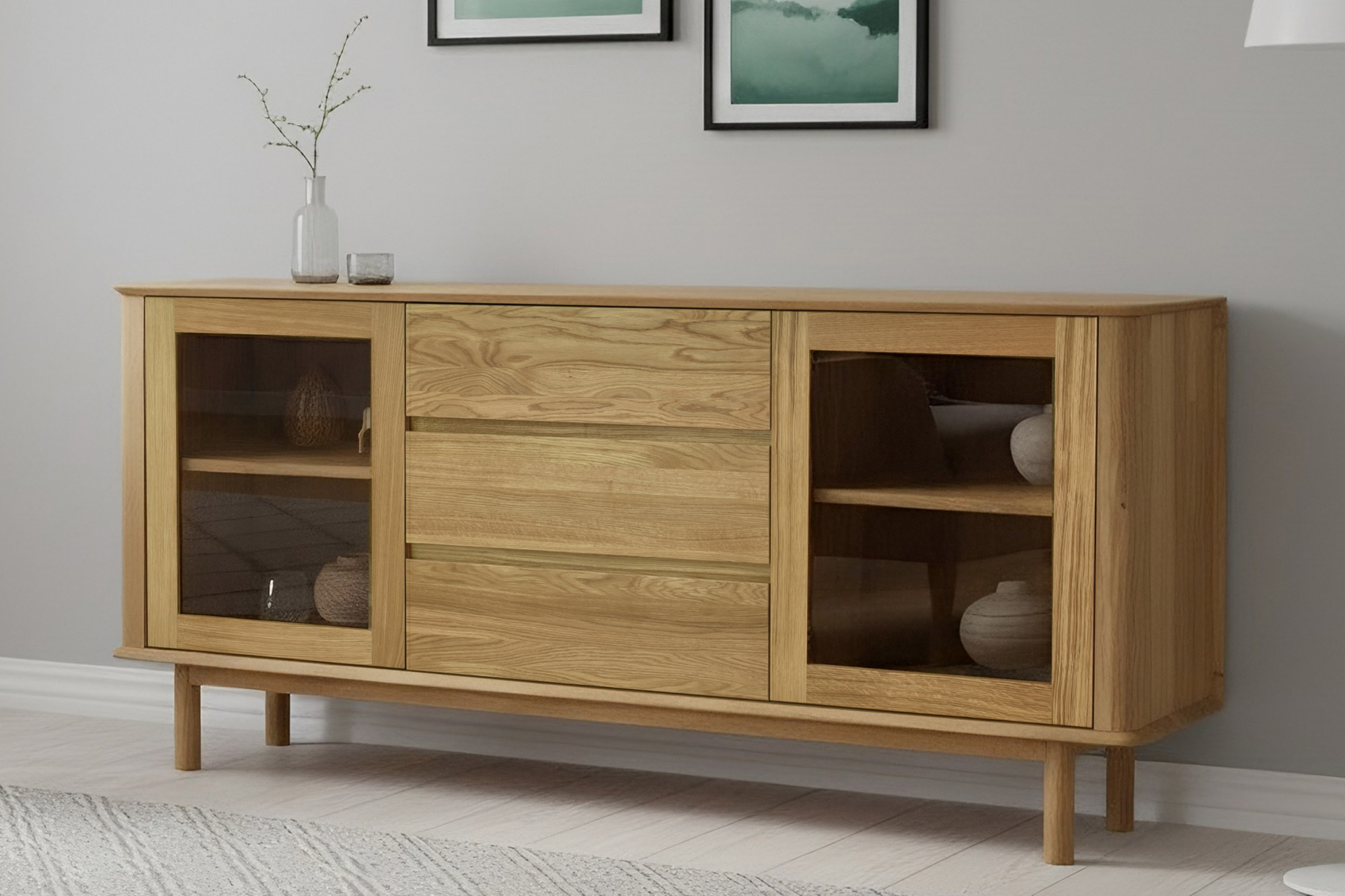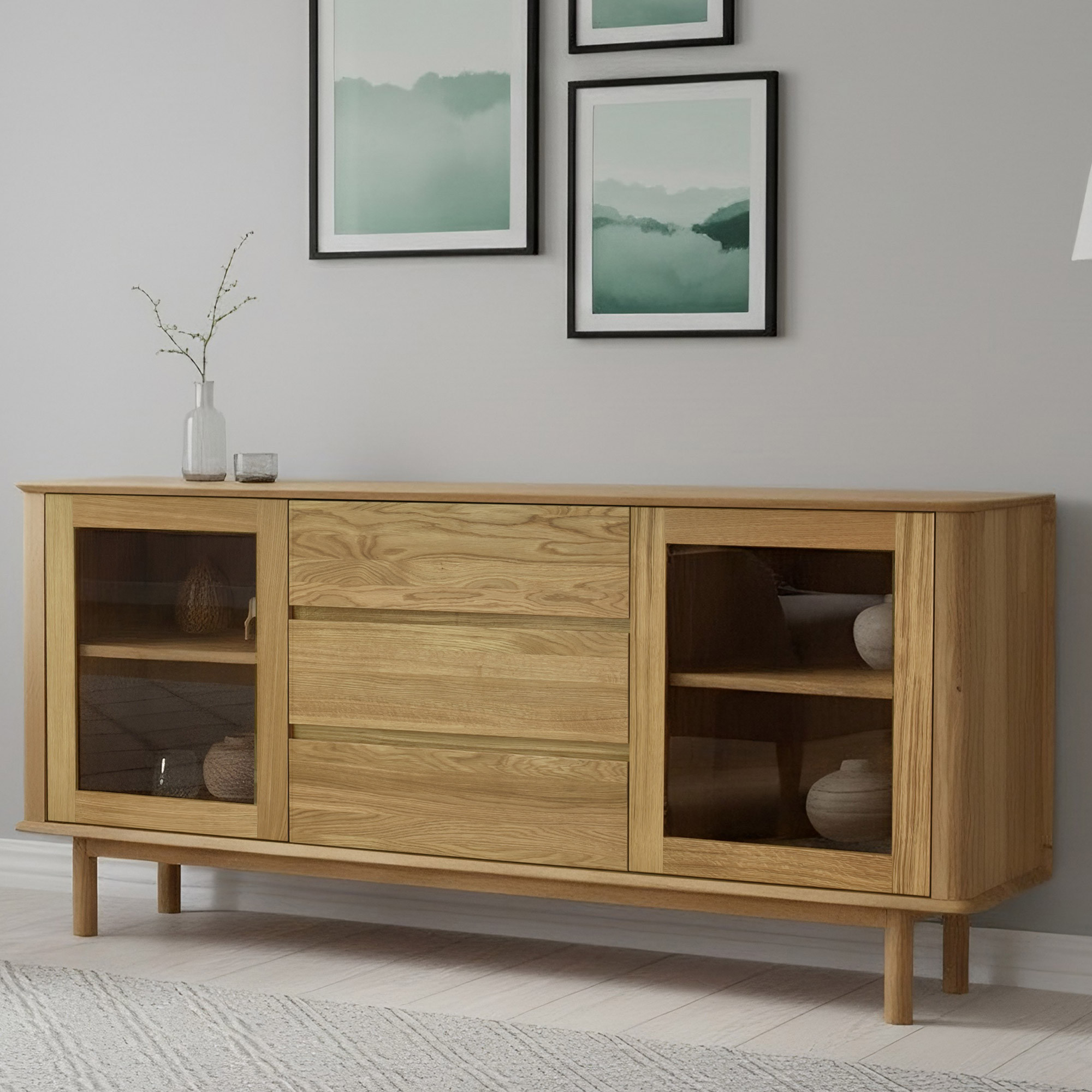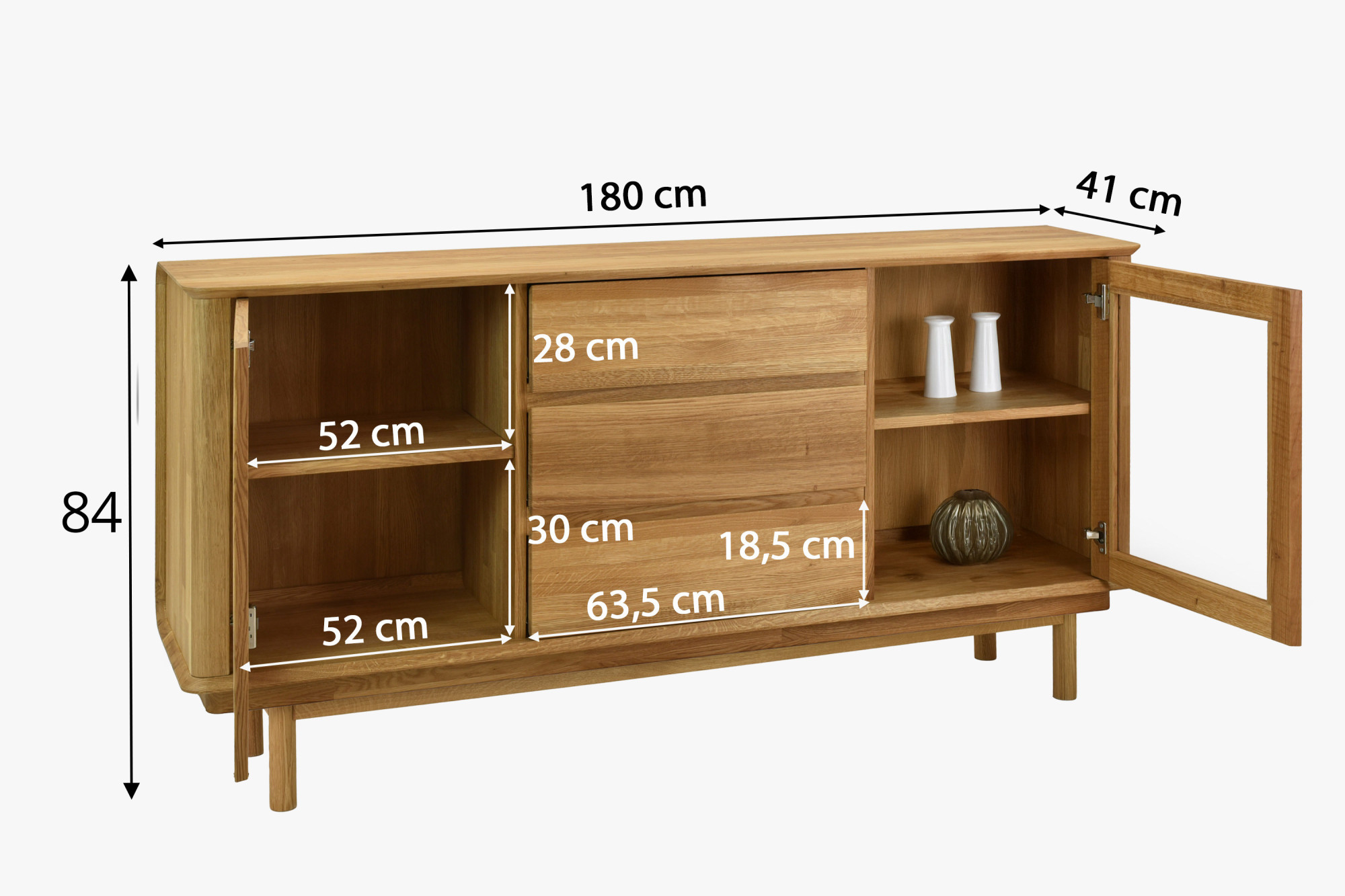Premium Eichenkommode Monaco ist die perfekte Wahl für alle, die hochwertigen, designorientierten und gleichzeitig preiswerten Möbel aus Naturmaterial suchen. Diese Eichenkommode fürs Schlafzimmer oder Wohnzimmer bietet seitlich Glastüren mit innerem Holzboden, ideal zum Präsentieren von Dekorationen oder zum Aufbewahren von Büchern und anderen Wertgegenständen. Der mittlere Teil der Kommode besteht aus drei geräumigen Schubladen, die ausreichend Stauraum für Wäsche, Dokumente oder andere Haushaltsgegenstände bieten. Jedes Detail ist präzise verarbeitet – die effektvollen abgerundeten Ecken unterstreichen das luxuriöse Aussehen und erhöhen die Sicherheit im Haushalt.