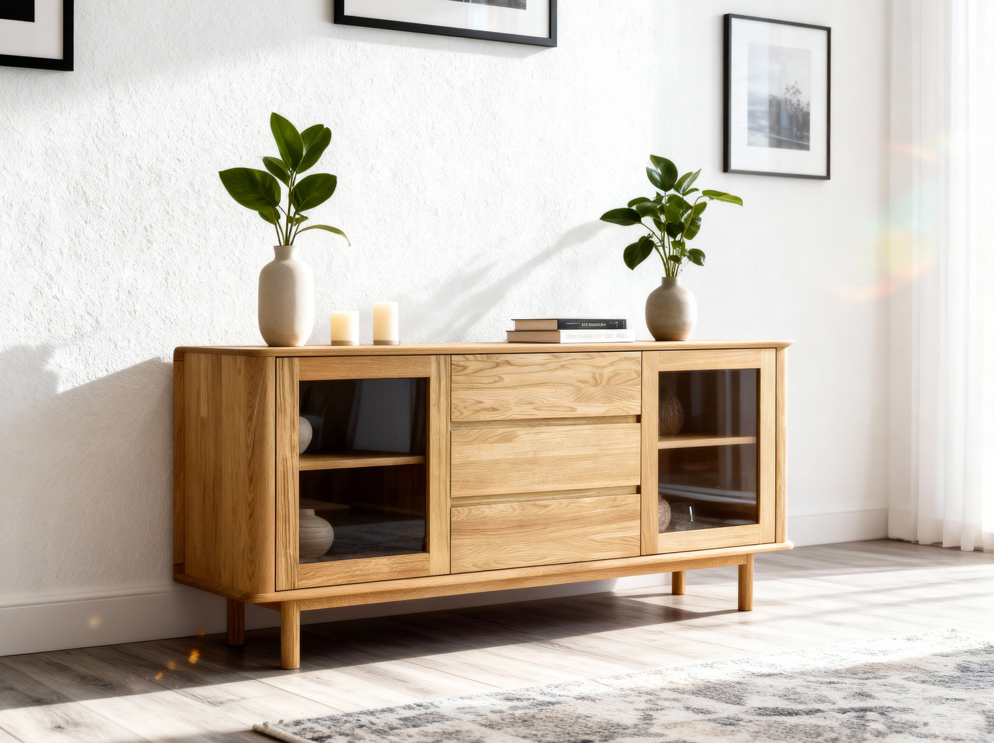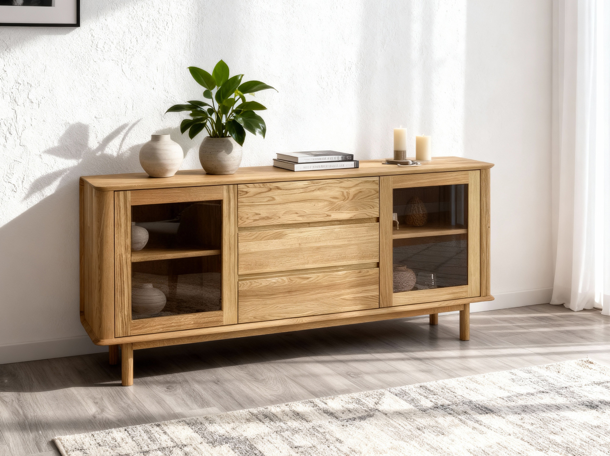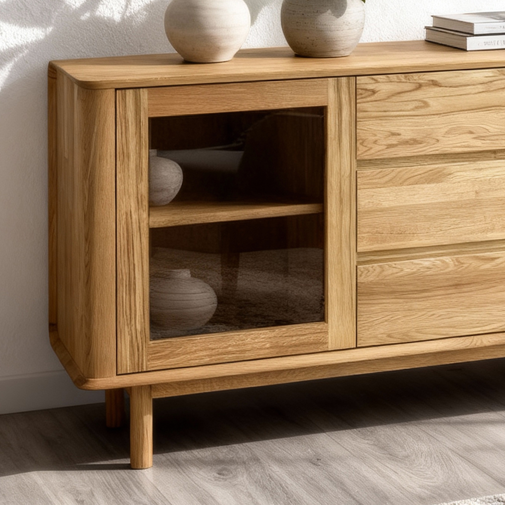 Entdecken Sie die Kraft des Naturmaterials und sichern Sie sich die premium Eichen-TV-Kommode Monaco, die zum Blickfang in Ihrem Interieur wird. Dank FSC-Zertifizierung und massiver Vollholzkonstruktion erhalten Sie Möbel, die durch Langlebigkeit, Schönheit und ökologische Verantwortung überzeugen. Drei geräumige Schubladen und die verglasten Stauraumfächer bringen nicht nur Stil, sondern auch Praktikabilität in Ihr Zuhause.