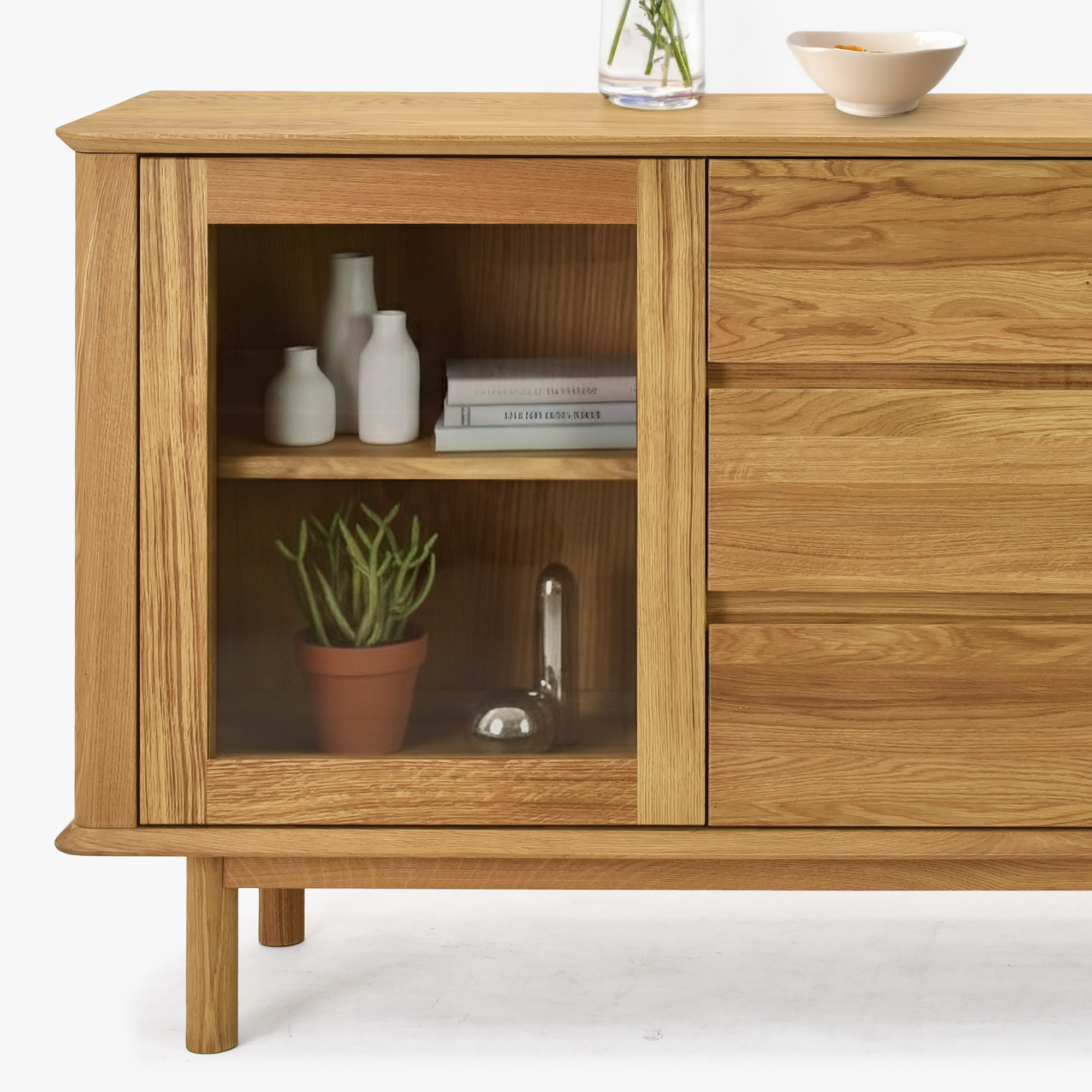 Eichenkommode mit Glastüren und Schubladen auf Beinen