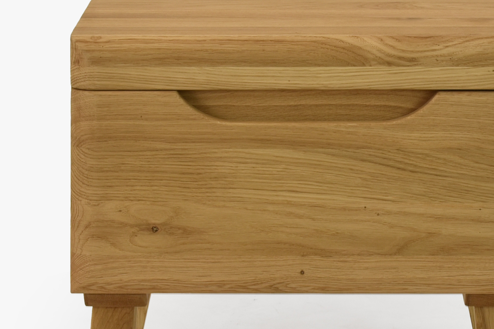 Die Oberfläche des Tisches ist mit natürlichem Öl der italienischen Marke Borma Wachs behandelt, das die natürliche Maserung des Eichenholzes schön hervorhebt und gleichzeitig zuverlässigen Schutz gegen gewöhnlichen Verschleiß bietet. Charakteristisches Merkmal der Kollektion Prag sind die eingerfrästen Griffmulden direkt im Holz, die dem Tisch ein sauberes und fließendes Erscheinungsbild ohne störende Elemente verleihen. Leicht abgerundete Kanten verleihen dem Möbelstück Sanftheit und Sicherheit. Schlanke Eichenfüße verleihen dem Tisch einen luftigen Charakter, der den Raum im Schlafzimmer optisch auflockert. Als Teil der Kollektion Prag lässt er sich leicht mit weiteren Stücken zu einem harmonischen und einheitlichen Interieur kombinieren.