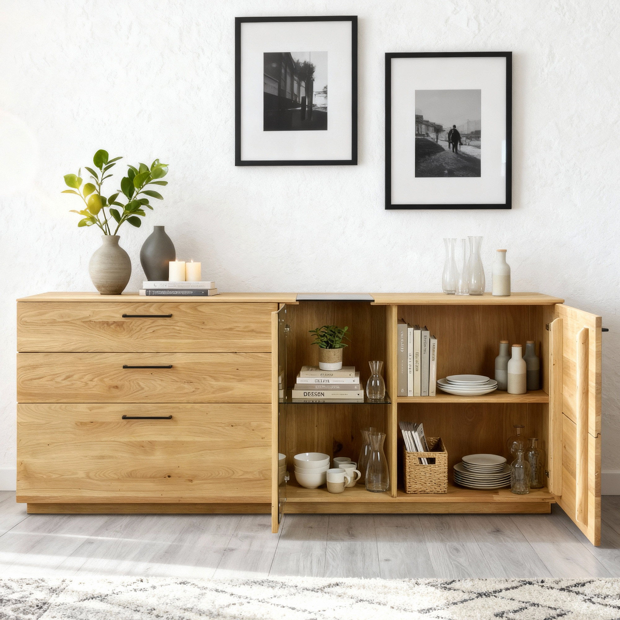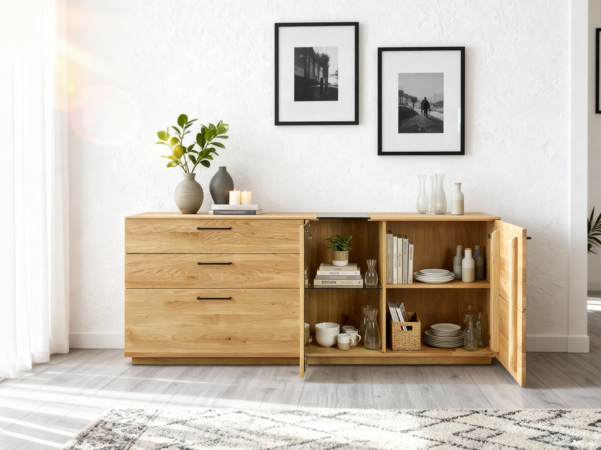 Eichenkommode 191 cm mit Glas – eleganter Stauraum für das Wohnzimmer