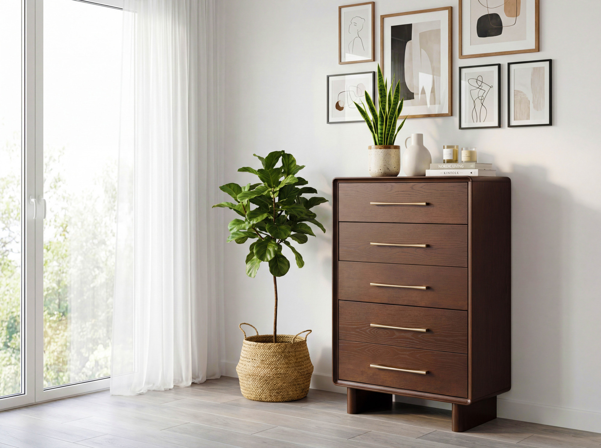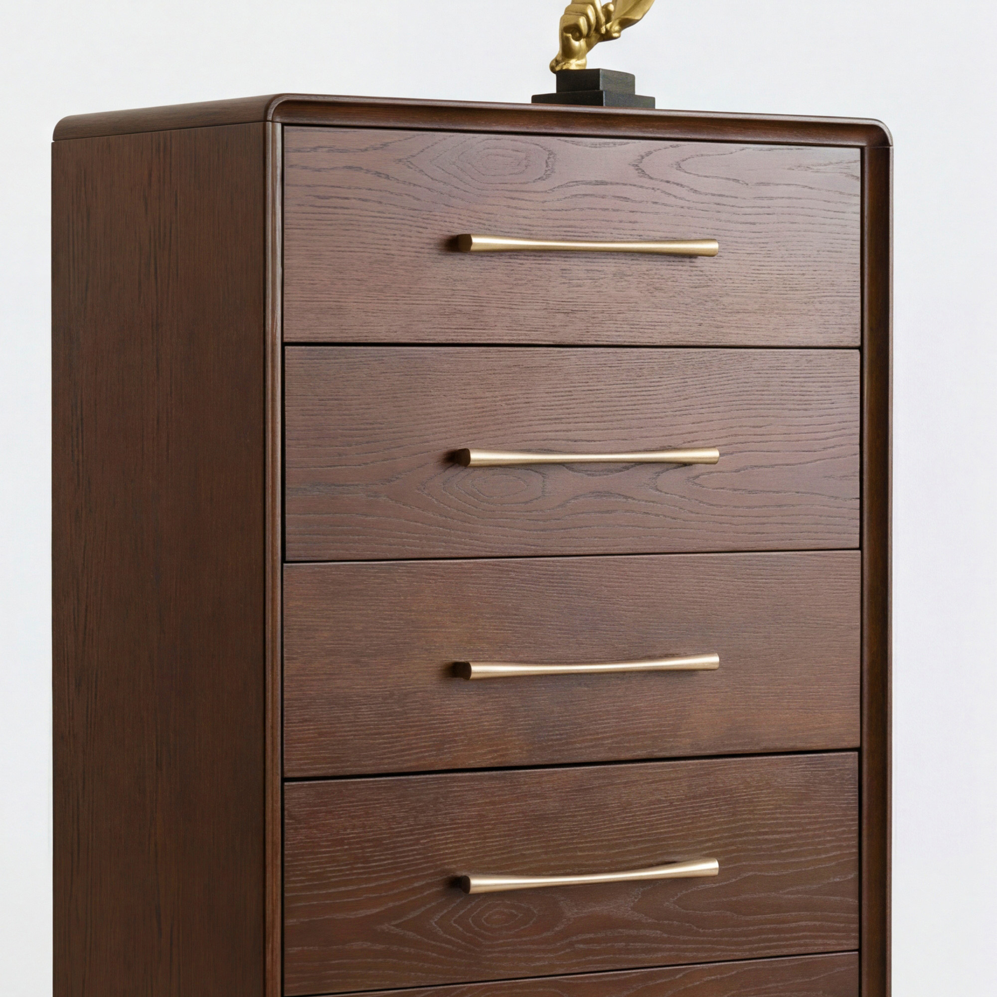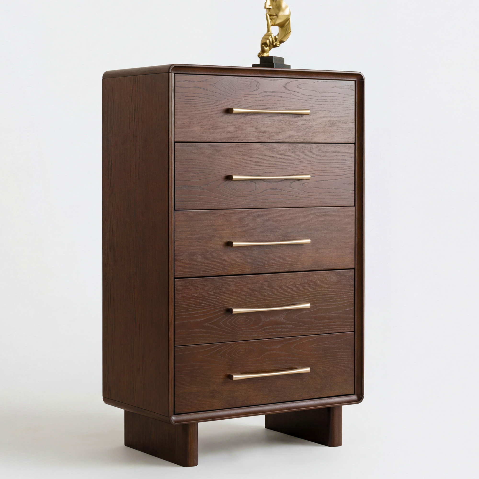 Wir präsentieren Ihnen die hohe Design-Kommode Koper mit 5 Schubladen, die maximalen Stauraum bei minimaler Bodenfläche bietet. Diese elegante Kommode in warmer Walnussfarbe ist die ideale Wahl für Schlafzimmer, Flur oder kleinere Räume, in denen Sie eine praktische Lösung zur Aufbewahrung von Kleidung, Wäsche oder Accessoires benötigen. Das gesamte Möbelstück ist aus premium Eichenfurnier mit massiven Eichenkanten gefertigt, was außergewöhnliche Stabilität und lange Lebensdauer garantiert. Abgerundete Kanten verleihen der Kommode einen modernen Charakter und erhöhen gleichzeitig die Sicherheit im Haushalt.