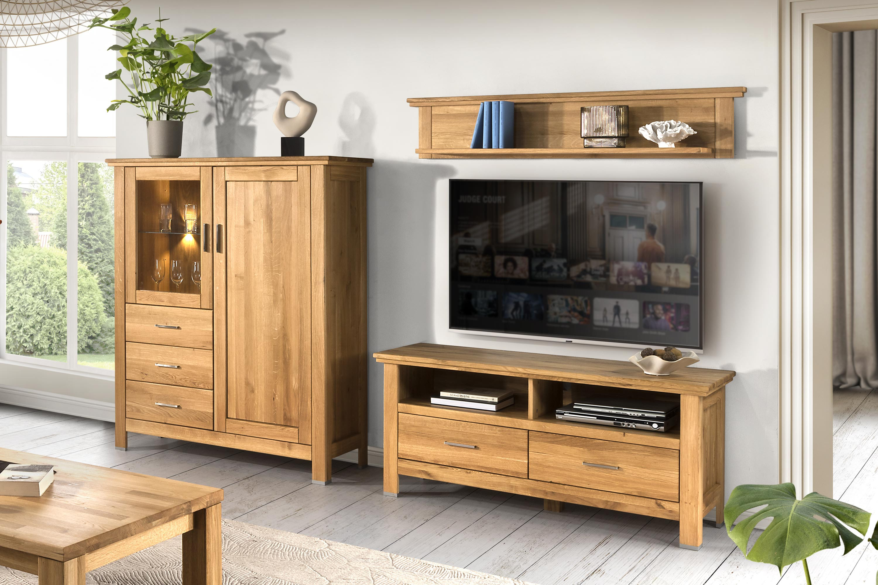 Durch den Zukauf weiterer Elemente der Alexandra Kollektion schaffen Sie einen eleganten Raum im einheitlichen Design. Diese Möbellinie wurde vom Schweizer Wohnstil inspiriert, bei dem Stil und Qualität im Mittelpunkt stehen. Stellen Sie Ihre Wohnwand ganz nach Ihren Vorstellungen zusammen! Die Kommode passt hervorragend zu der TV-Kommode, dem Regal, der großen Vitrine und dem Couchtisch! Das Möbelstück verfügt über eine vollmassive Konstruktion, einschließlich des Innenkorpus und der Regale. Die oberste Platte der Eichenkommode ist mit dem beliebten Parkettmuster verziert. Die Oberflächenbehandlung des Materials erfolgt ausschließlich mit natürlichem Öl einer renommierten Marke, ohne weitere Beize oder Bleichung. Der Farbton mit dem Namen Eiche Öl wirkt ökologisch und bewahrt den natürlichen Charakter mit der wunderschönen Holzmaserung. Die Ölaufbereitung verleiht dem Holz zudem eine erhöhte Widerstandsfähigkeit gegen kleine mechanische Beschädigungen wie Kratzer und Abrieb.