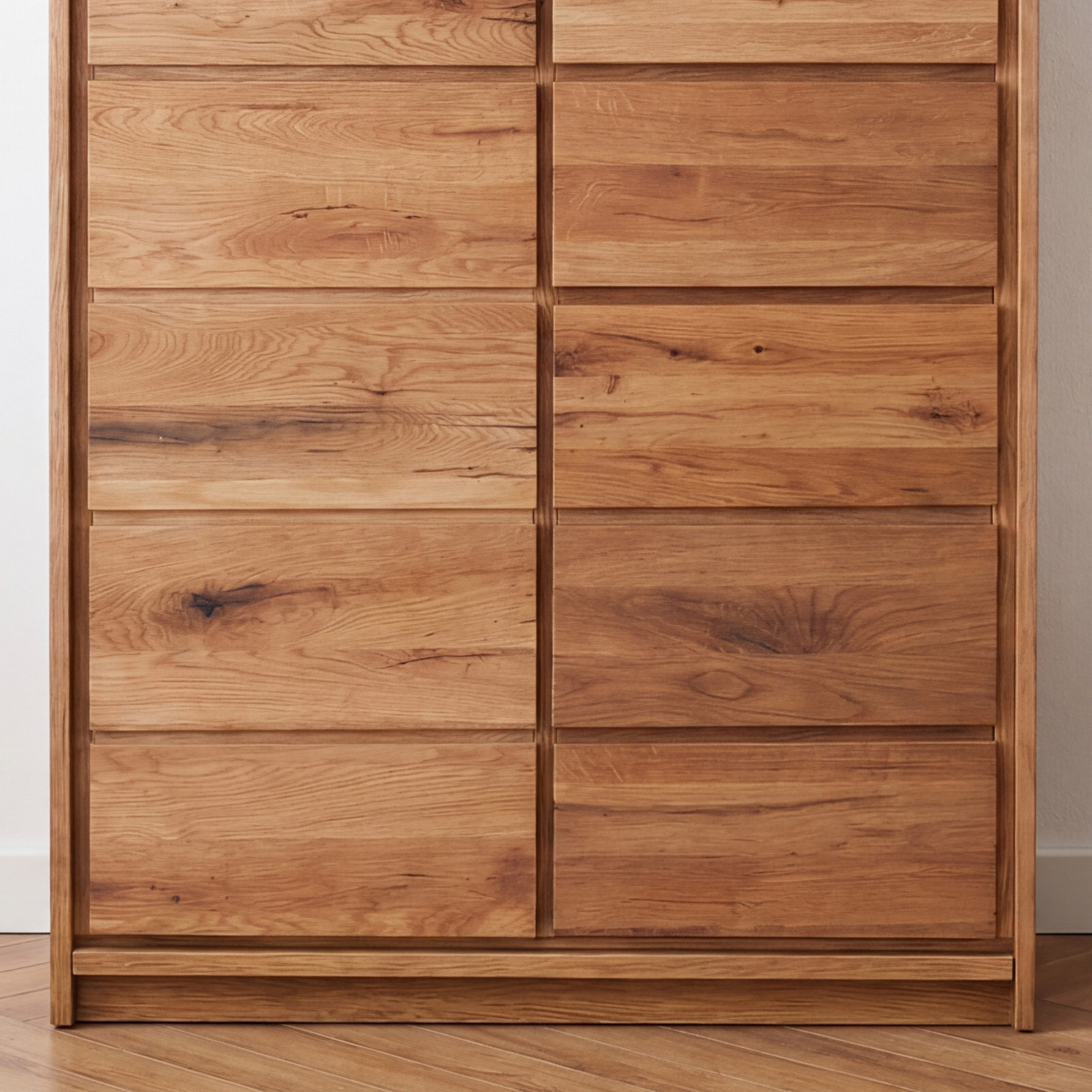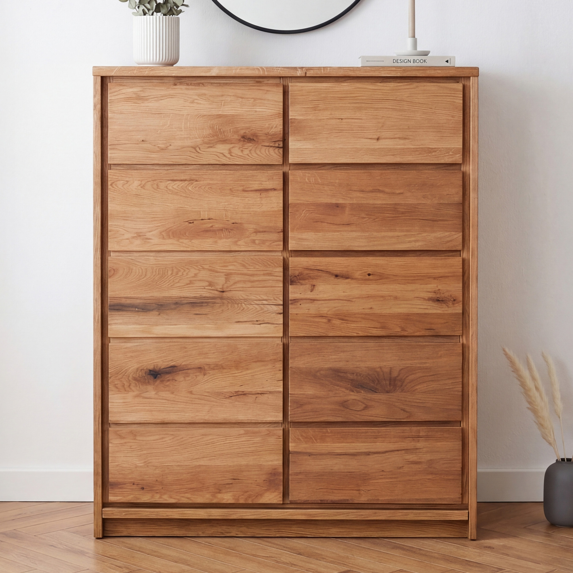 Die linke Seite verbirgt hinter einer großen Tür drei Regale für größere Gegenstände. Die rechte Seite bietet fünf separate Schubladen, die übereinander angeordnet sind, für eine übersichtliche Organisation kleinerer Dinge. - Worin unterscheidet sich Wildeiche von herkömmlicher Eiche?