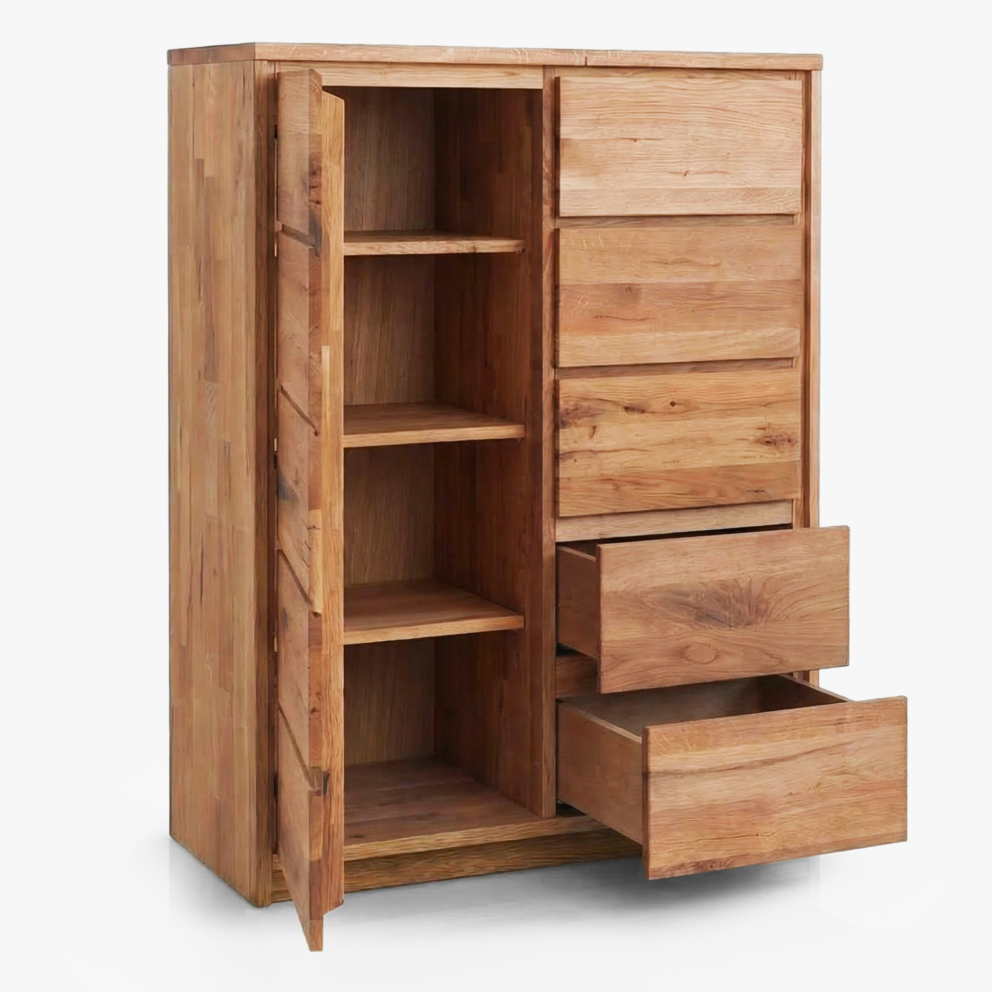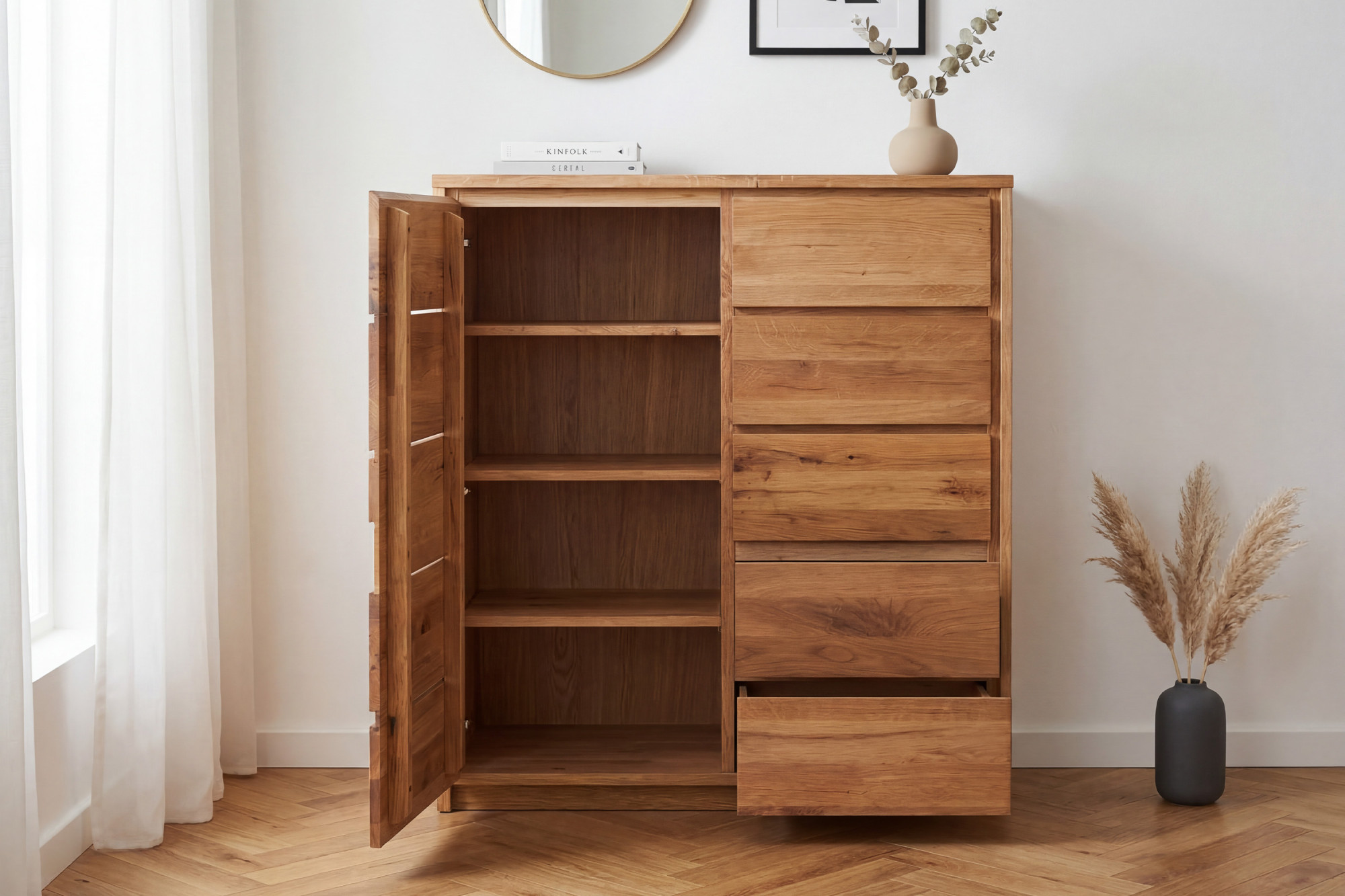 Hohe Eichenkommode Oregon 1D+5Z aus Wildeiche – Tür und 5 Schubladen