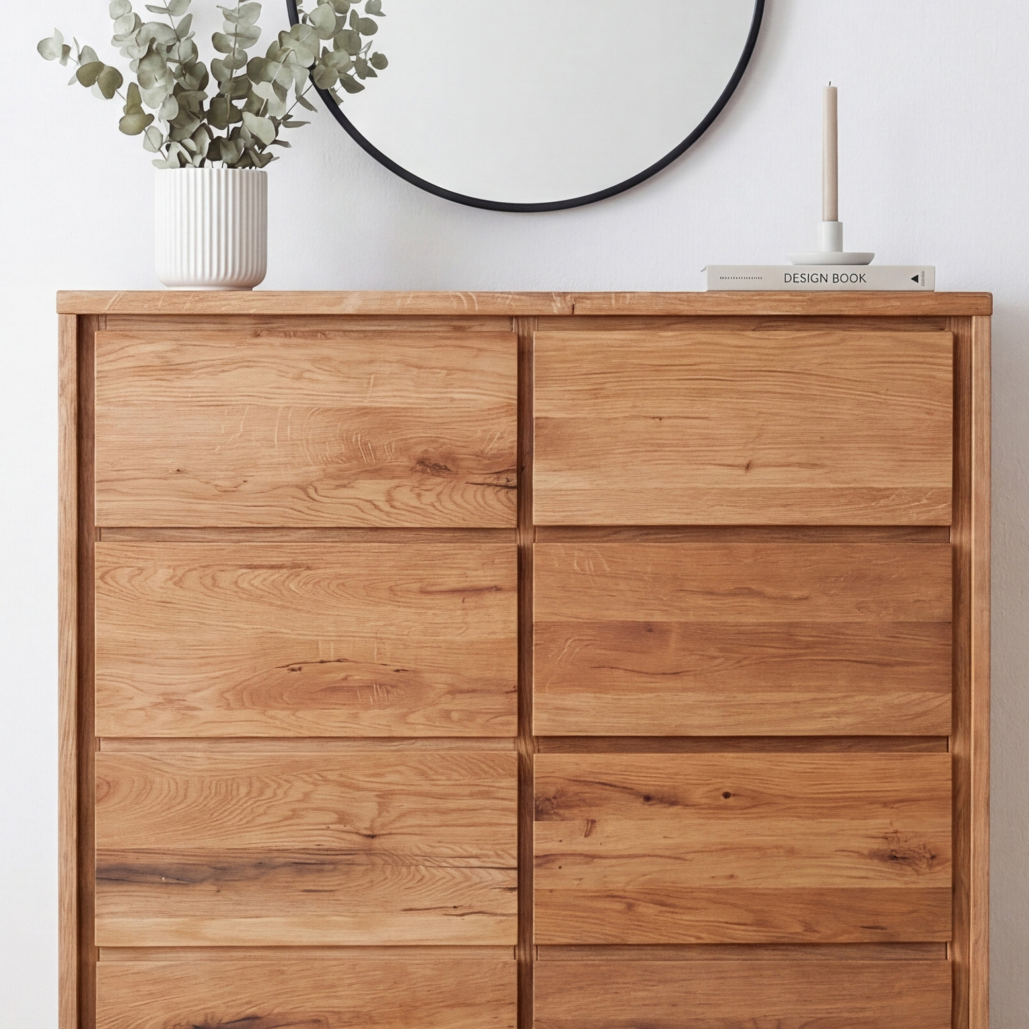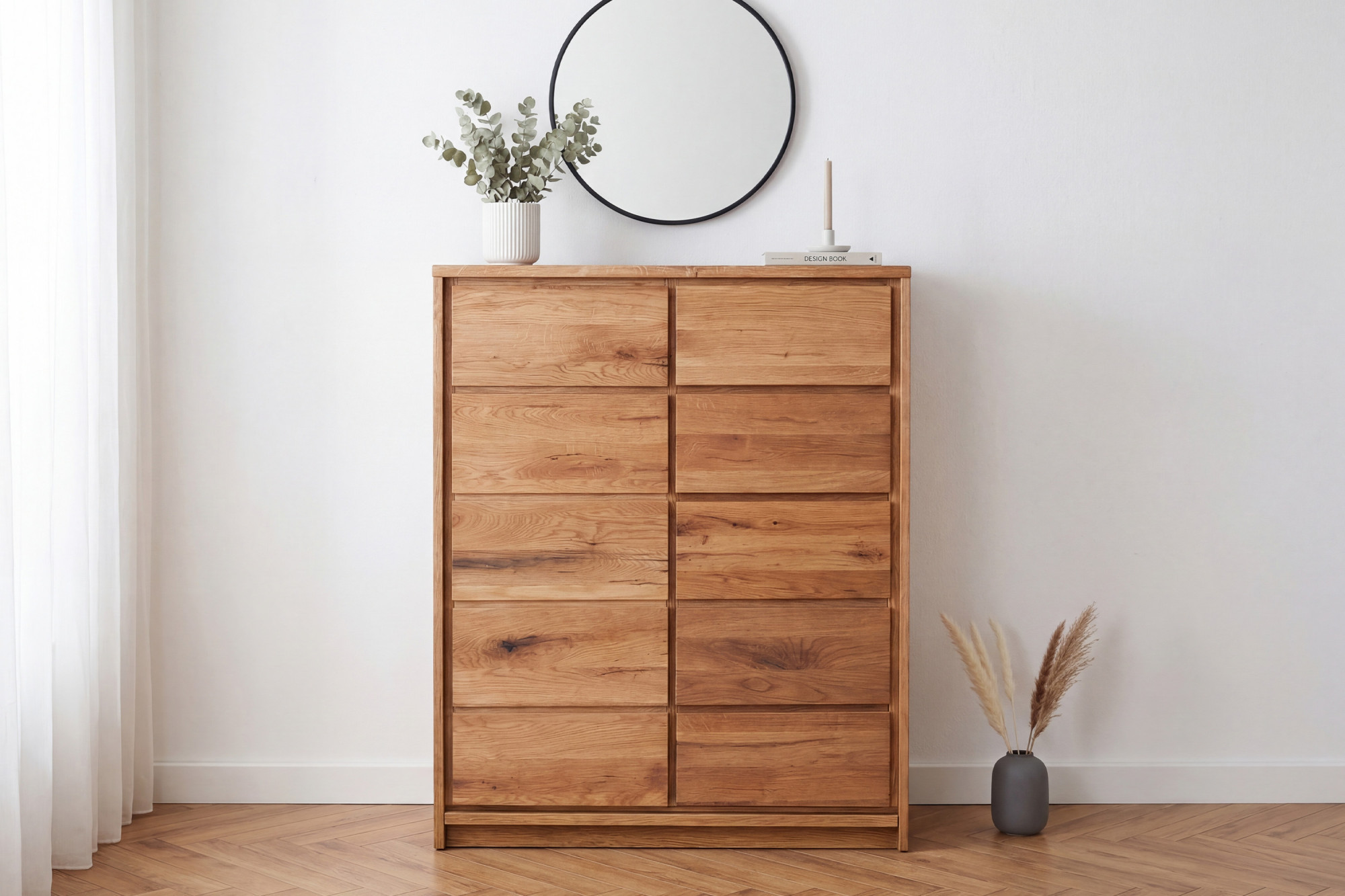 Mit einer Höhe von 119 cm und einer kompakten Breite von 88,5 cm eignet sich diese Kommode auch hervorragend für schmalere Räume, in denen die Raumhöhe optimal genutzt werden soll. Alle fünf Schubladen und die Tür verfügen über ein Soft-Close-System für geräuschloses und komfortables Öffnen und Schließen. Die Oberfläche ist mit naturbelassenem Öl behandelt, das die natürliche Farbe und Struktur der Eiche bewahrt und eine einfache Renovierung auch nach Jahren der Nutzung ermöglicht. Die gesamte Konstruktion ist vollmassiv – ohne Furnier oder MDF – und die Kommode wird Ihnen komplett montiert geliefert, einsatzbereit für den sofortigen Gebrauch.