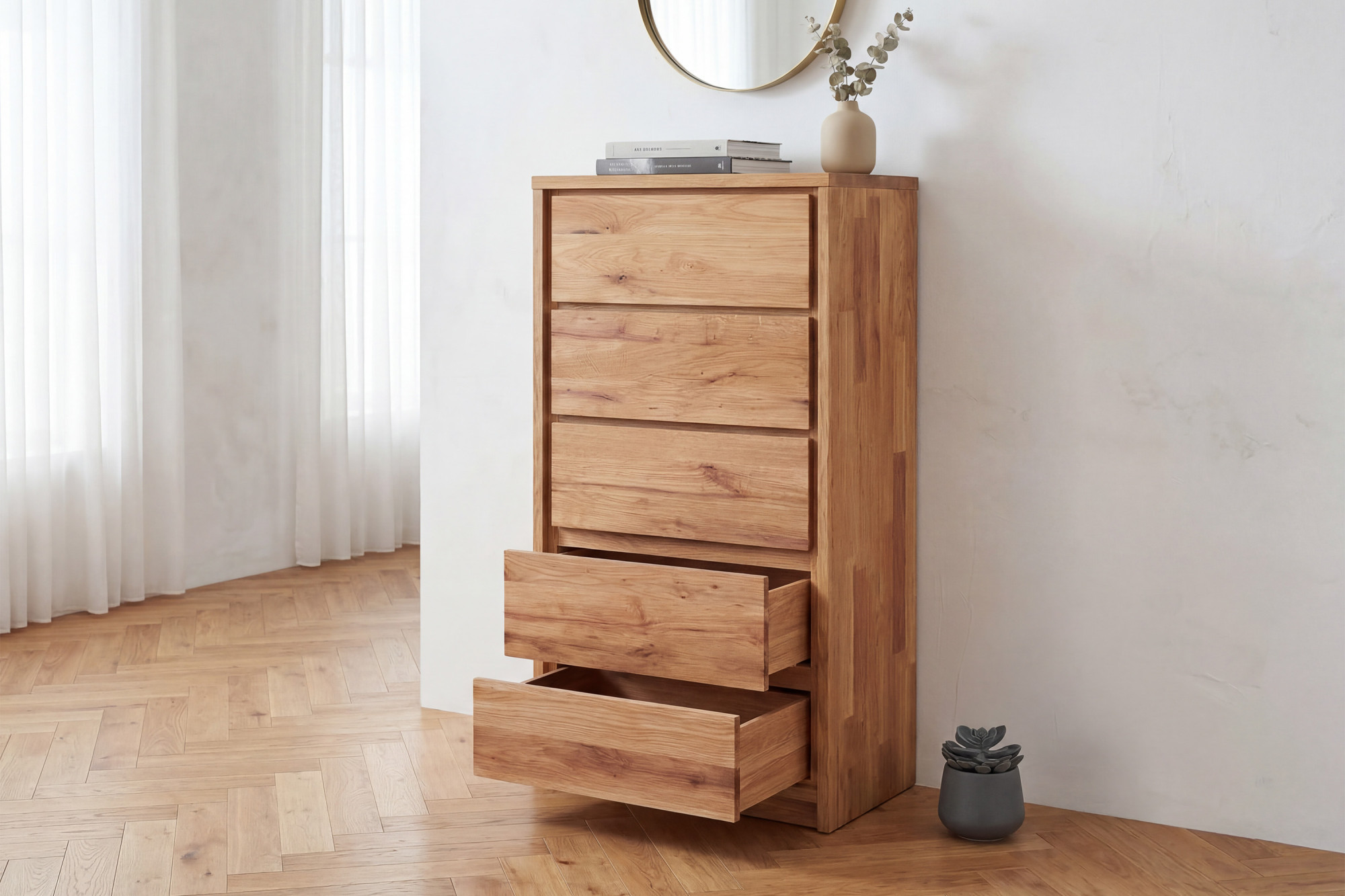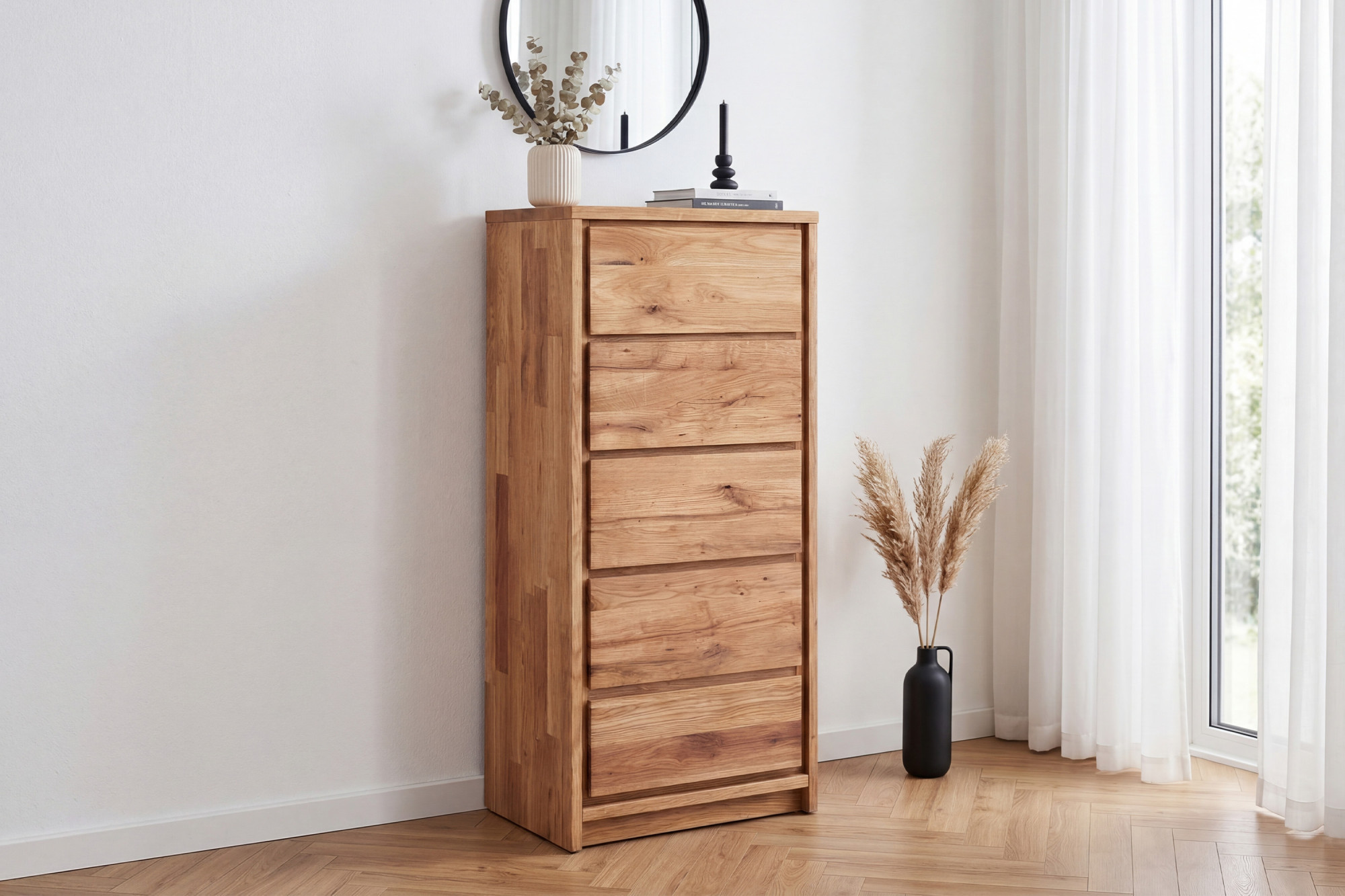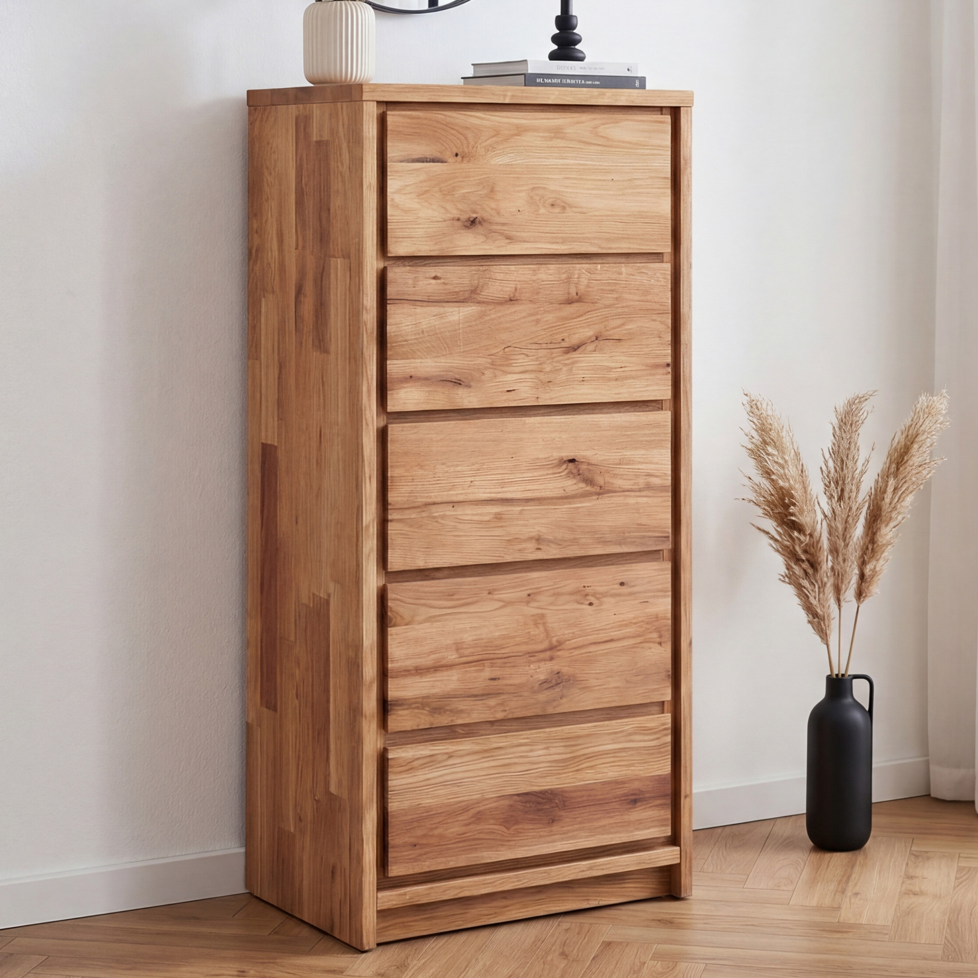 Schmale hohe Kommode Oregon 5Z aus wildem Eichenholz – 5 Schubladen, Breite 47 cm