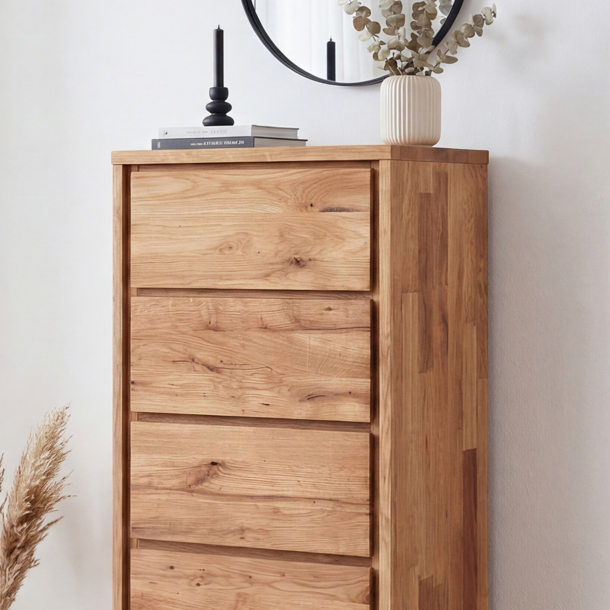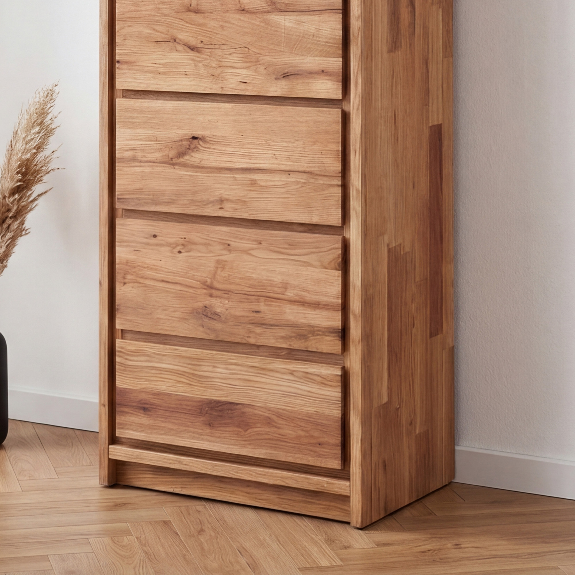 Die Kommode ist aus massivem wildem Eichenholz gefertigt, dessen typische ausgeprägte Äste und dekorative Risse jedes Stück zu einem unverwechselbaren Naturunikat machen. Die Oberfläche ist mit naturbelassenem Öl behandelt, das dem Holz einen warmen honigfarbenen Ton verleiht und es gleichzeitig wirksam vor alltäglicher Abnutzung schützt. Die gesamte Konstruktion ist vollmassiv – ohne Verwendung von Furnier oder MDF – was Stabilität und Langlebigkeit für viele Jahre garantiert. Die Kommode wird komplett montiert geliefert, sodass sie nach der Anlieferung nur noch aufgestellt und sofort genutzt werden kann.