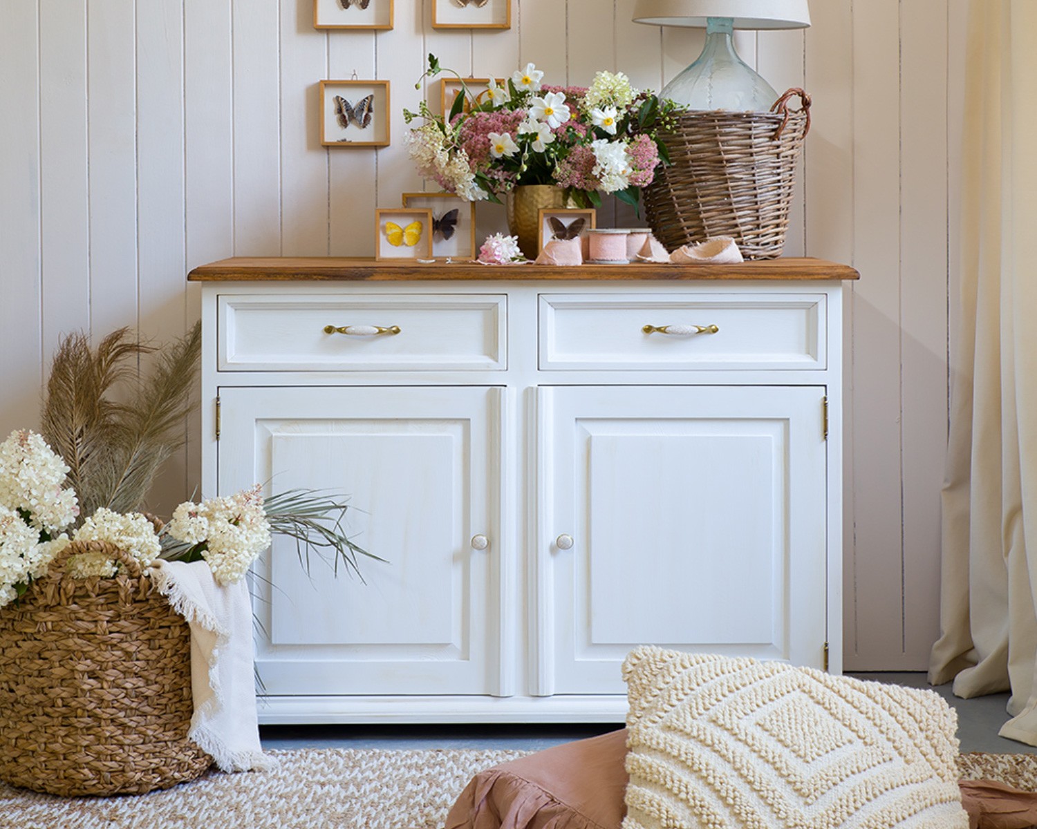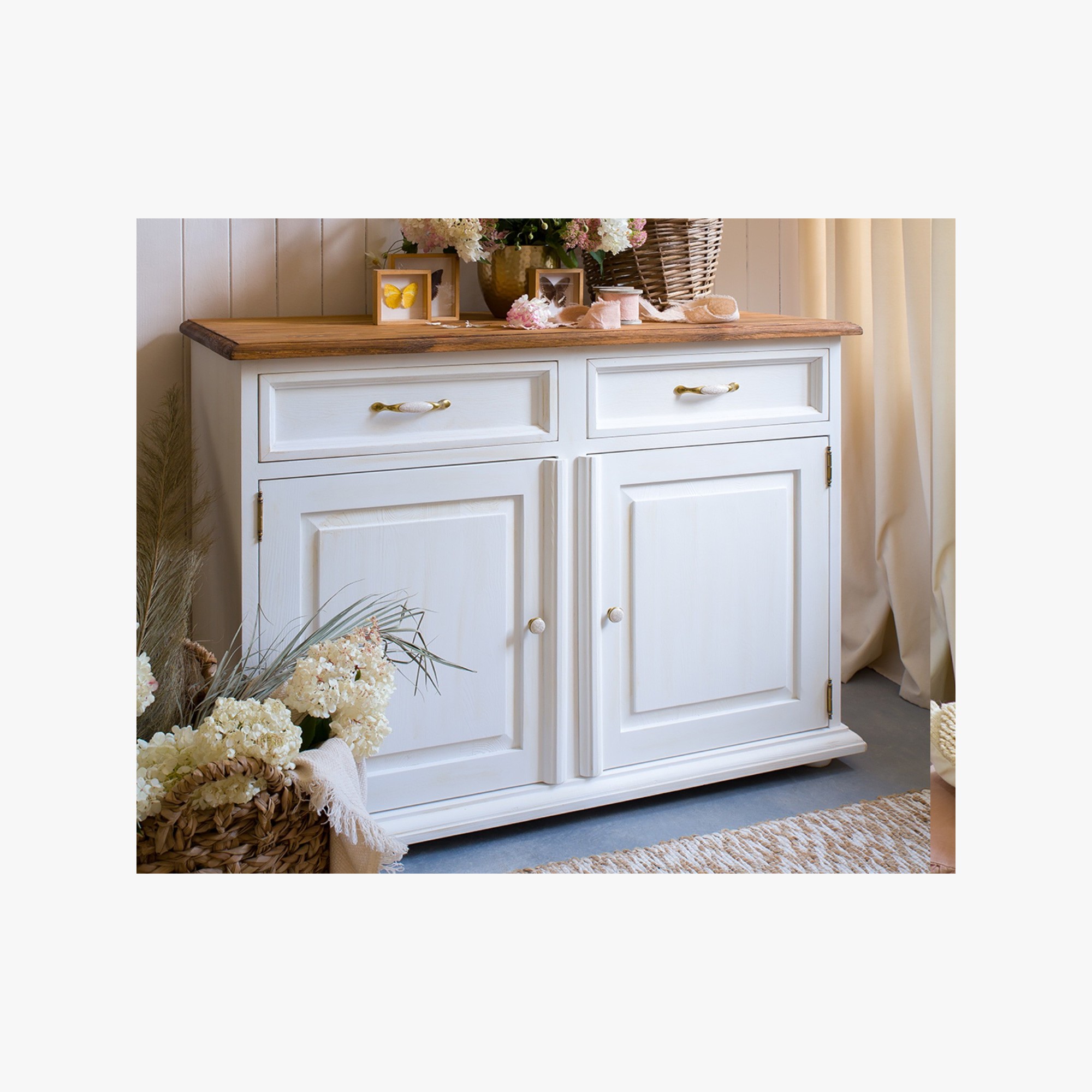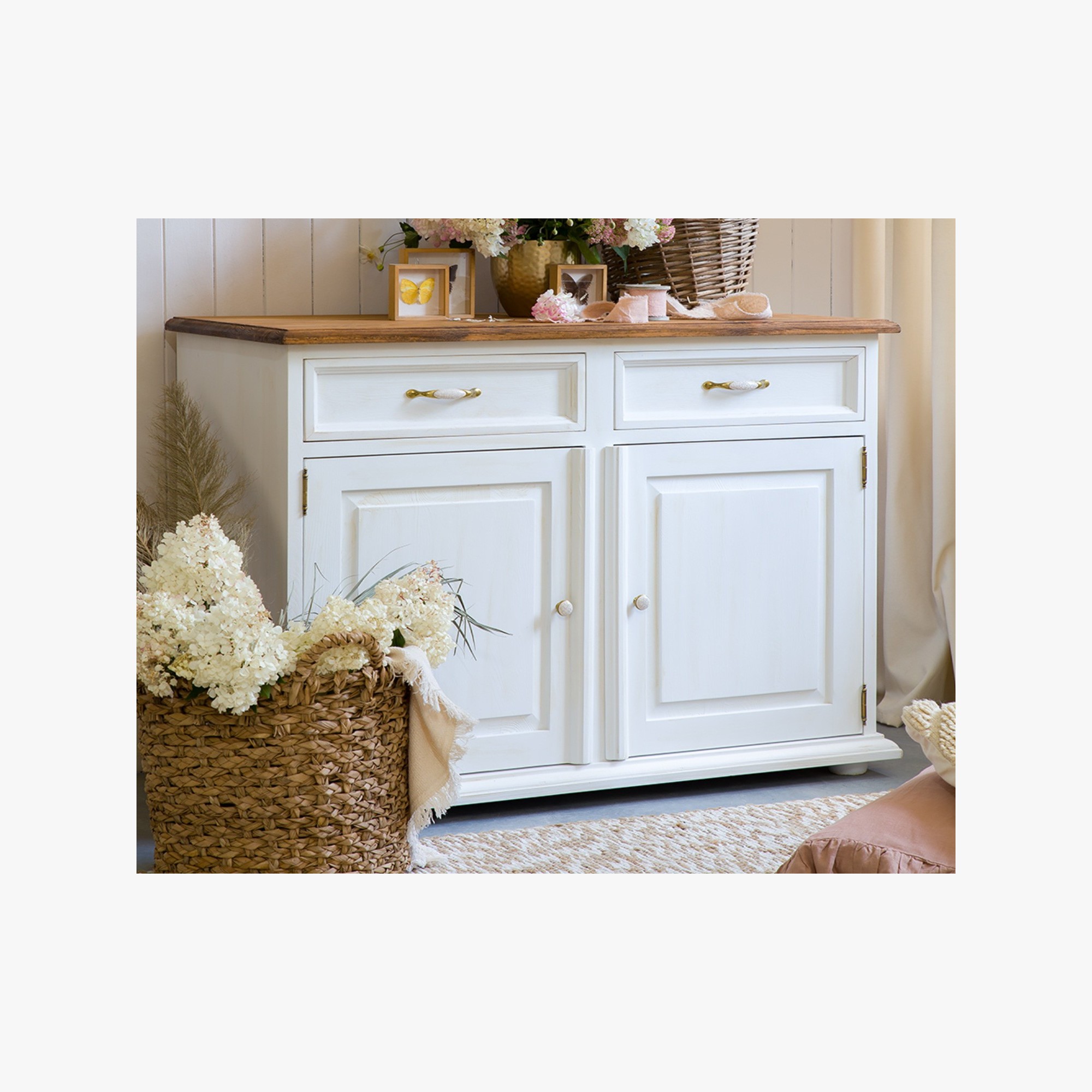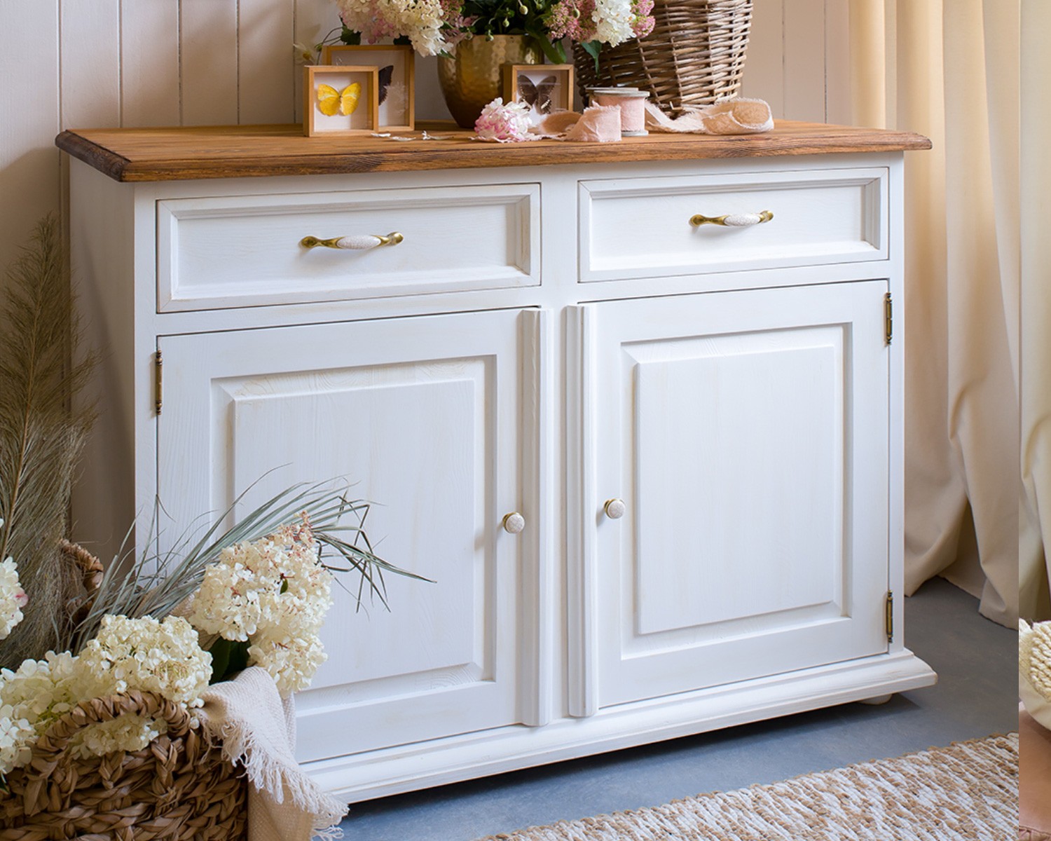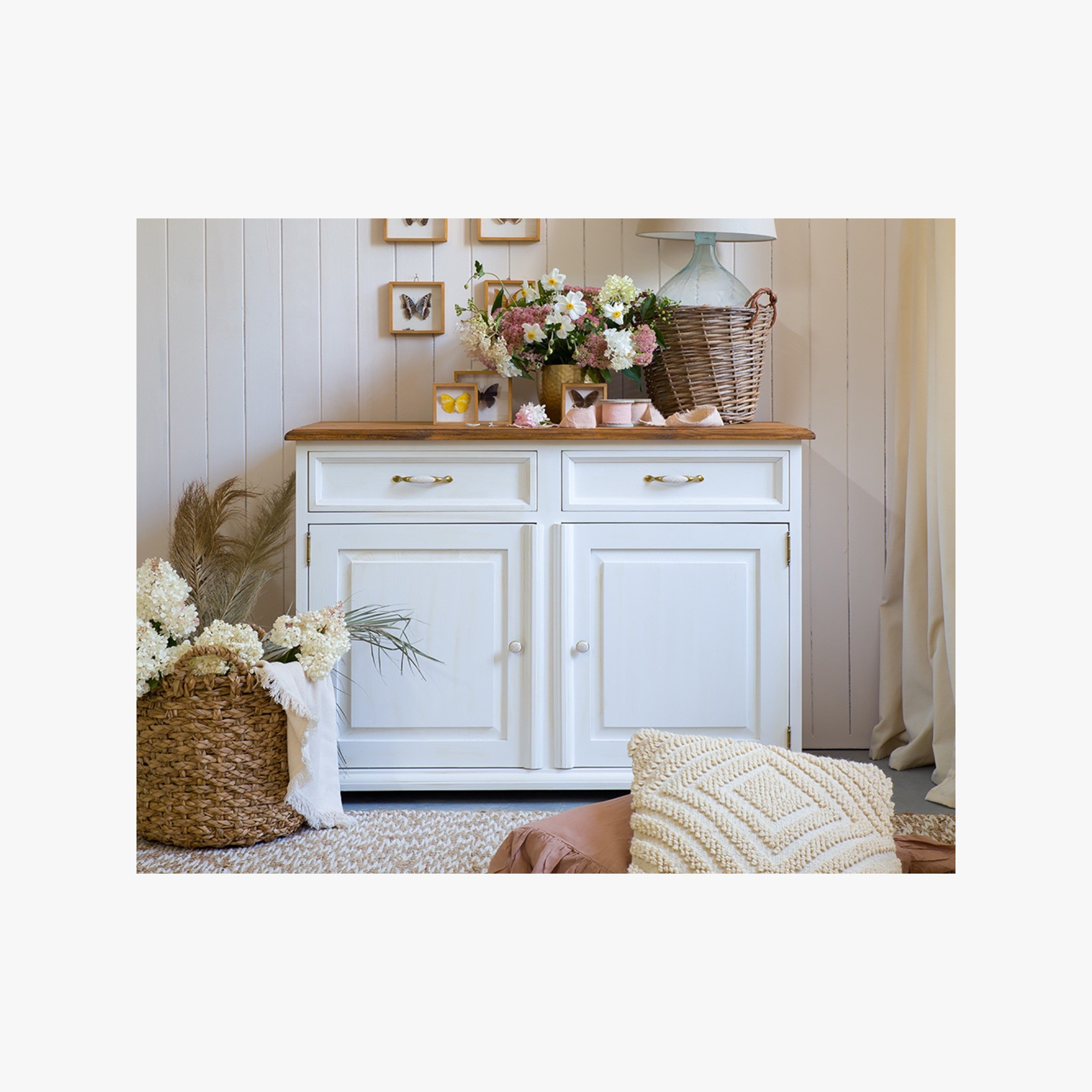 Der Sideboard Provence ist ideal für das Schlafzimmer oder Esszimmer. Sein Stauraum ist praktisch aufgeteilt in zwei Schubladen und einen 2-türigen Schrank mit Einlegeboden, sodass er sich sowohl für die Aufbewahrung von Kleidung als auch von Besteck oder Tüchern beziehungsweise wichtigen Dokumenten eignet. Aufgrund seiner universellen Proportionen findet es praktisch überall in Ihrem Interieur einen Platz!