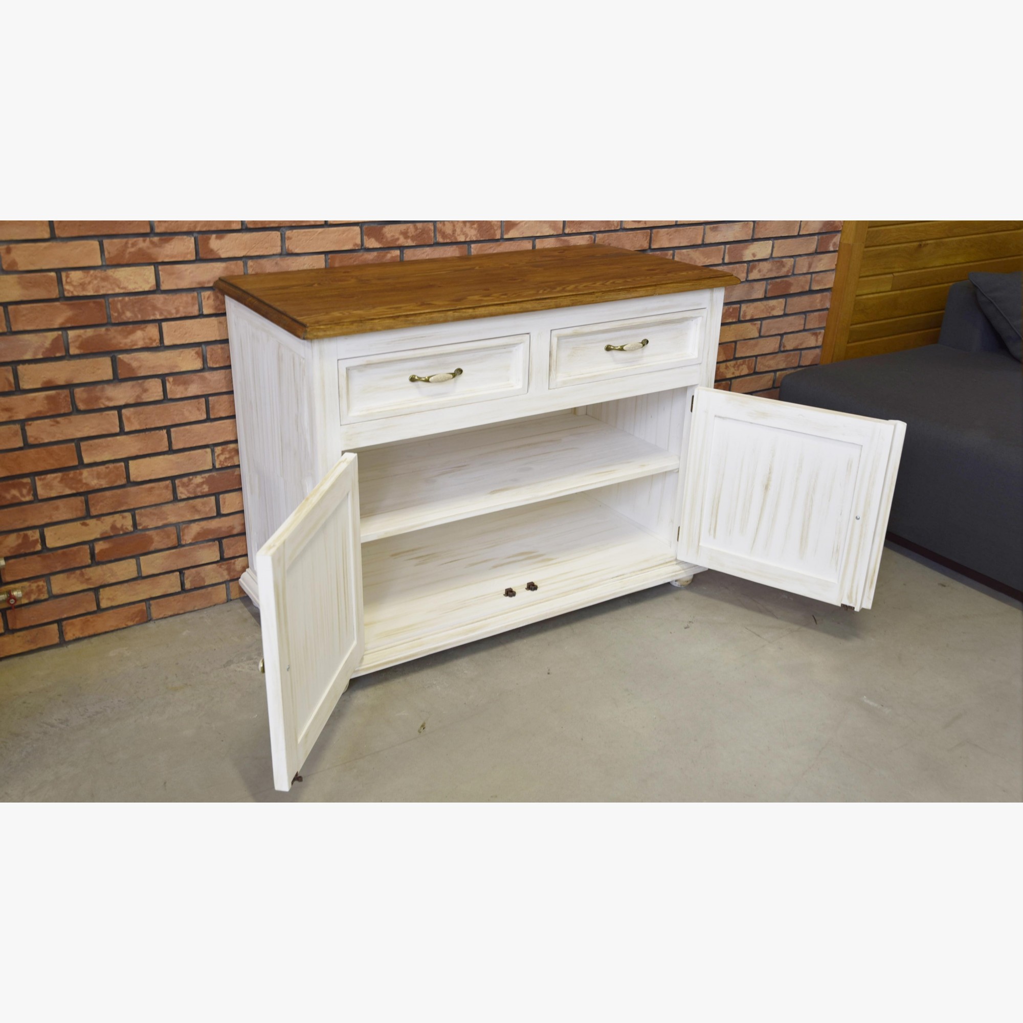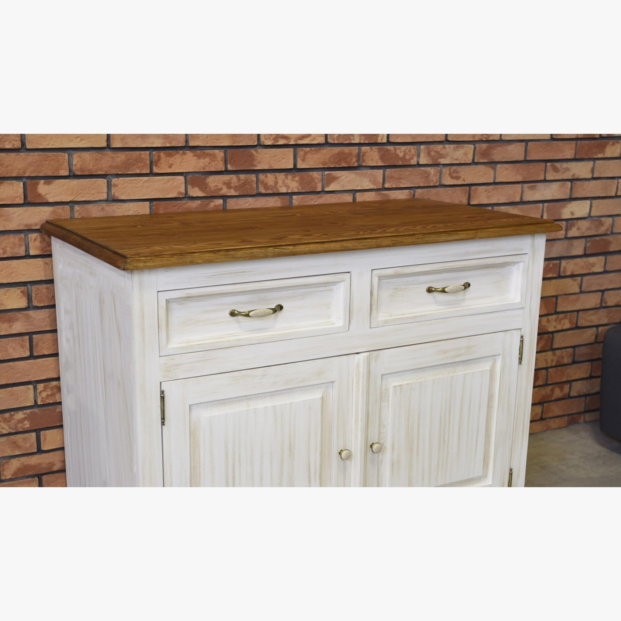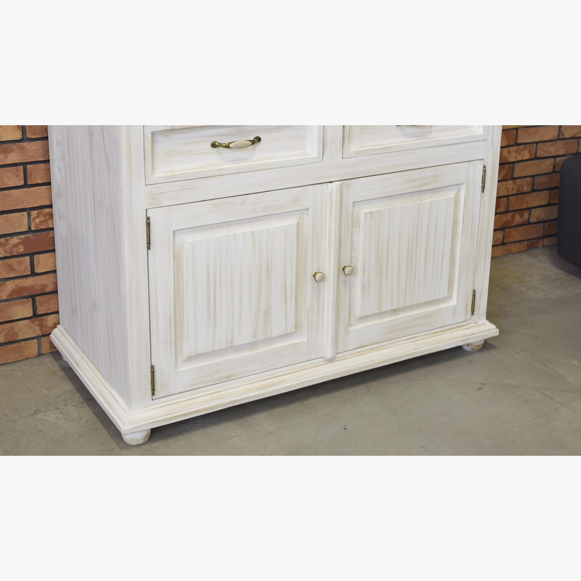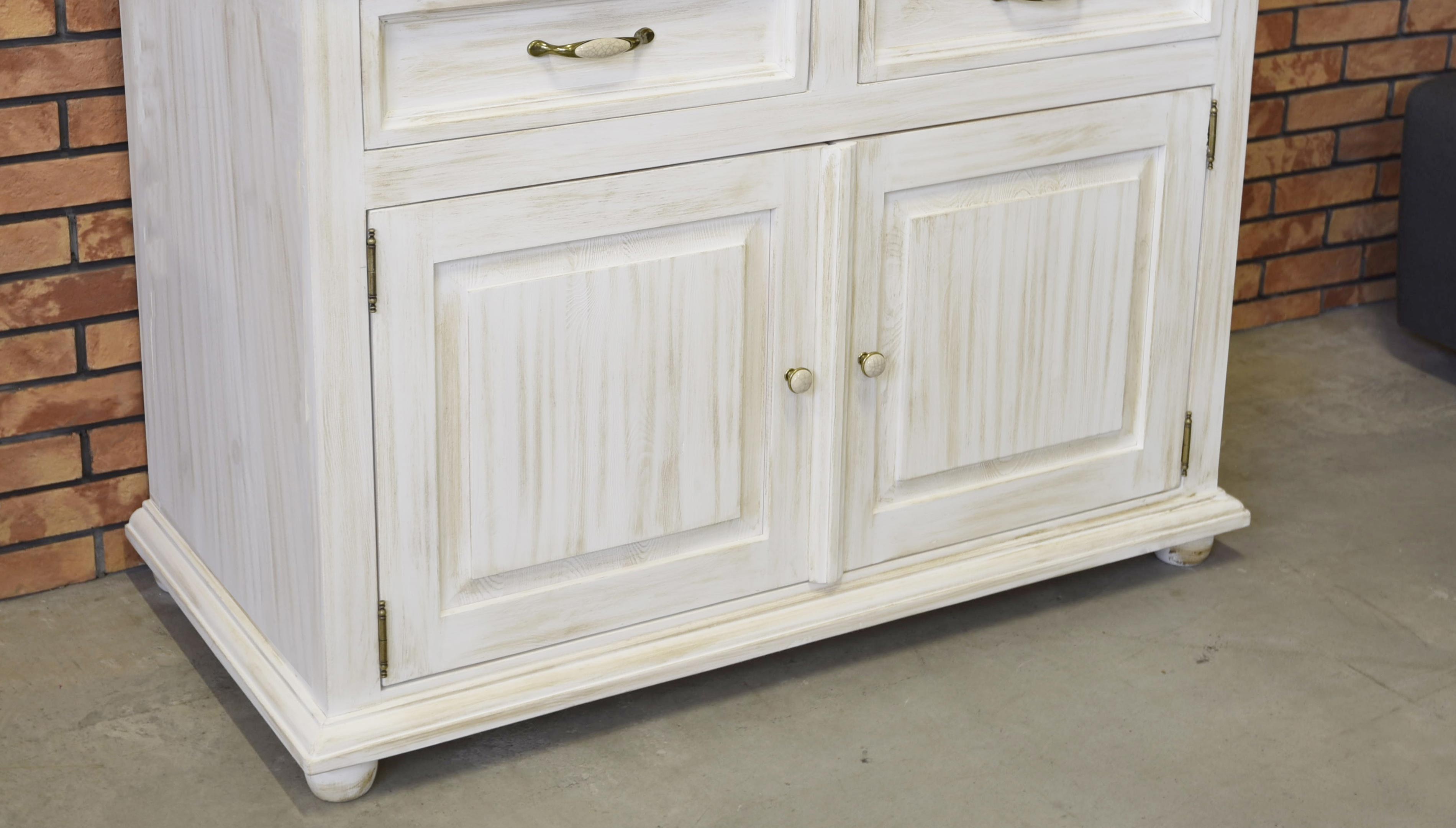 Der Sideboard ist komplett aus massiver Kiefer gefertigt. Es liegt ganz bei Ihnen, ob Sie die klassische weiße Variante bevorzugen, bei der das Holz mit weißer ökologischer Farbe gestrichen wird, oder die Patina-Variante, die mit einer Imitation von Alter und natürlich vergrautem Aussehen besticht. Der Patina-Effekt wird durch die Verwendung von Wachs auf weißem Untergrund erzielt.