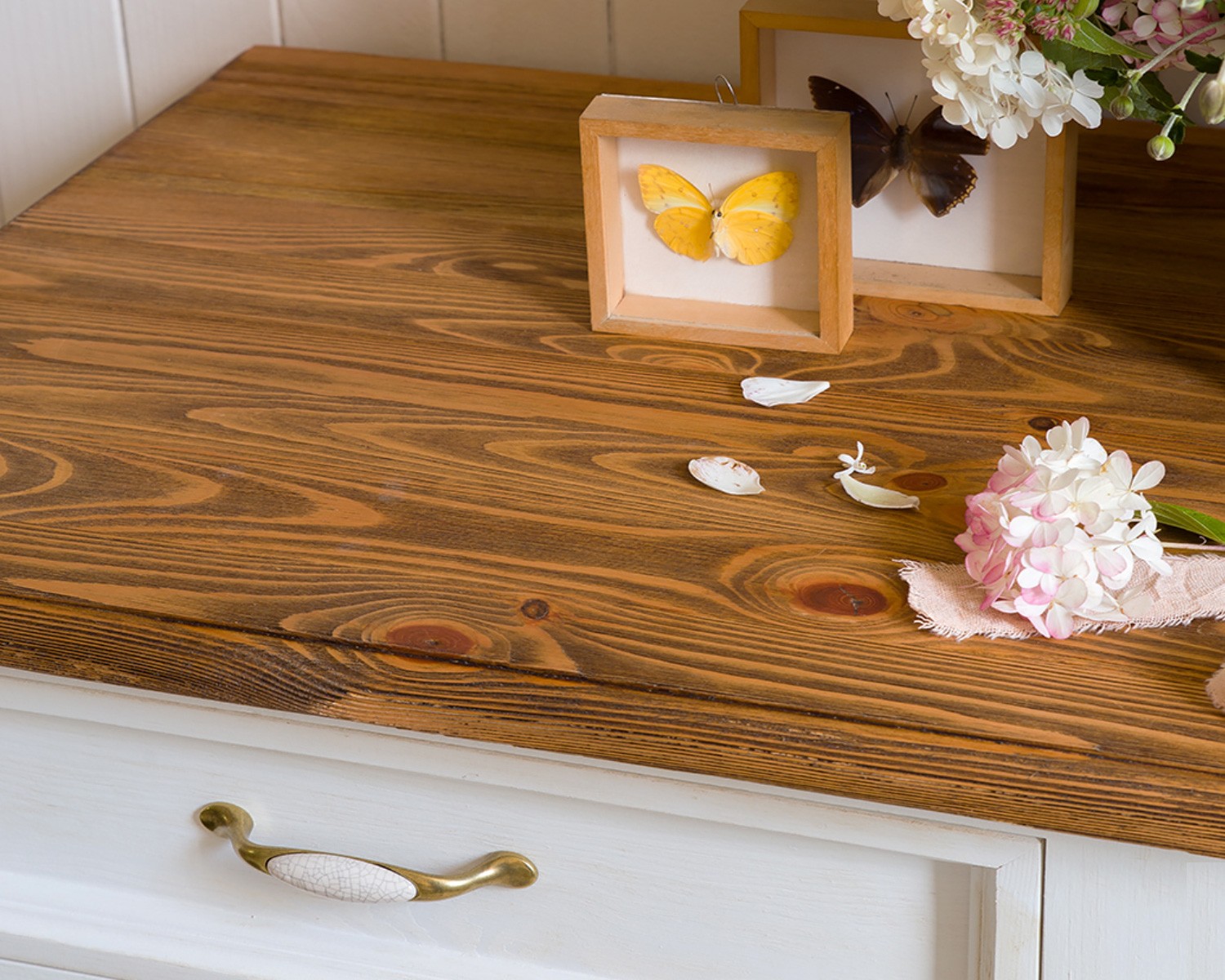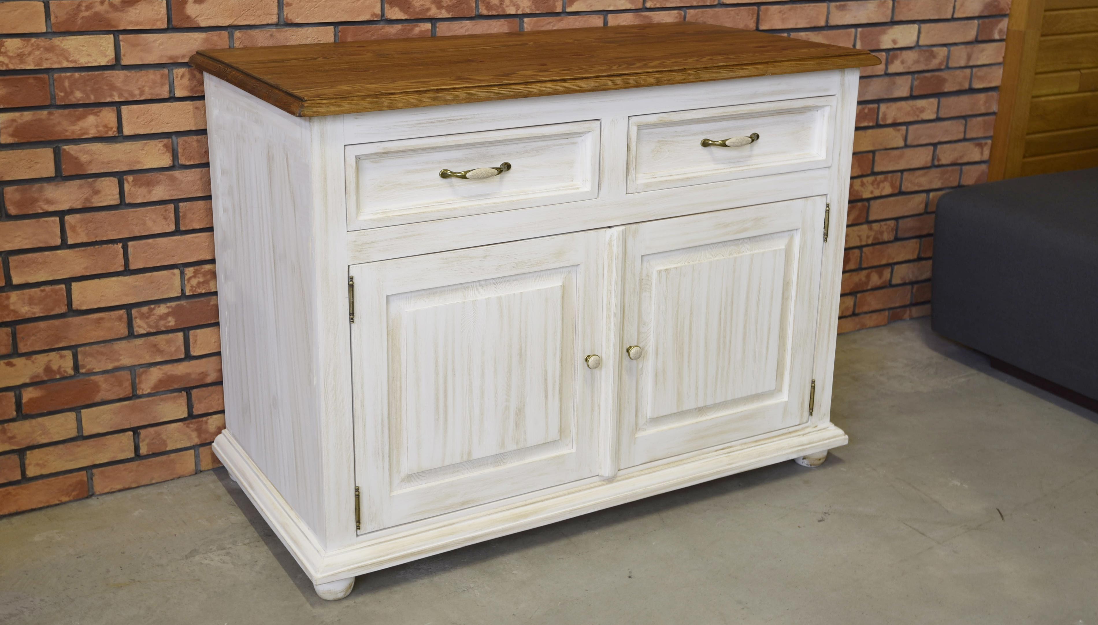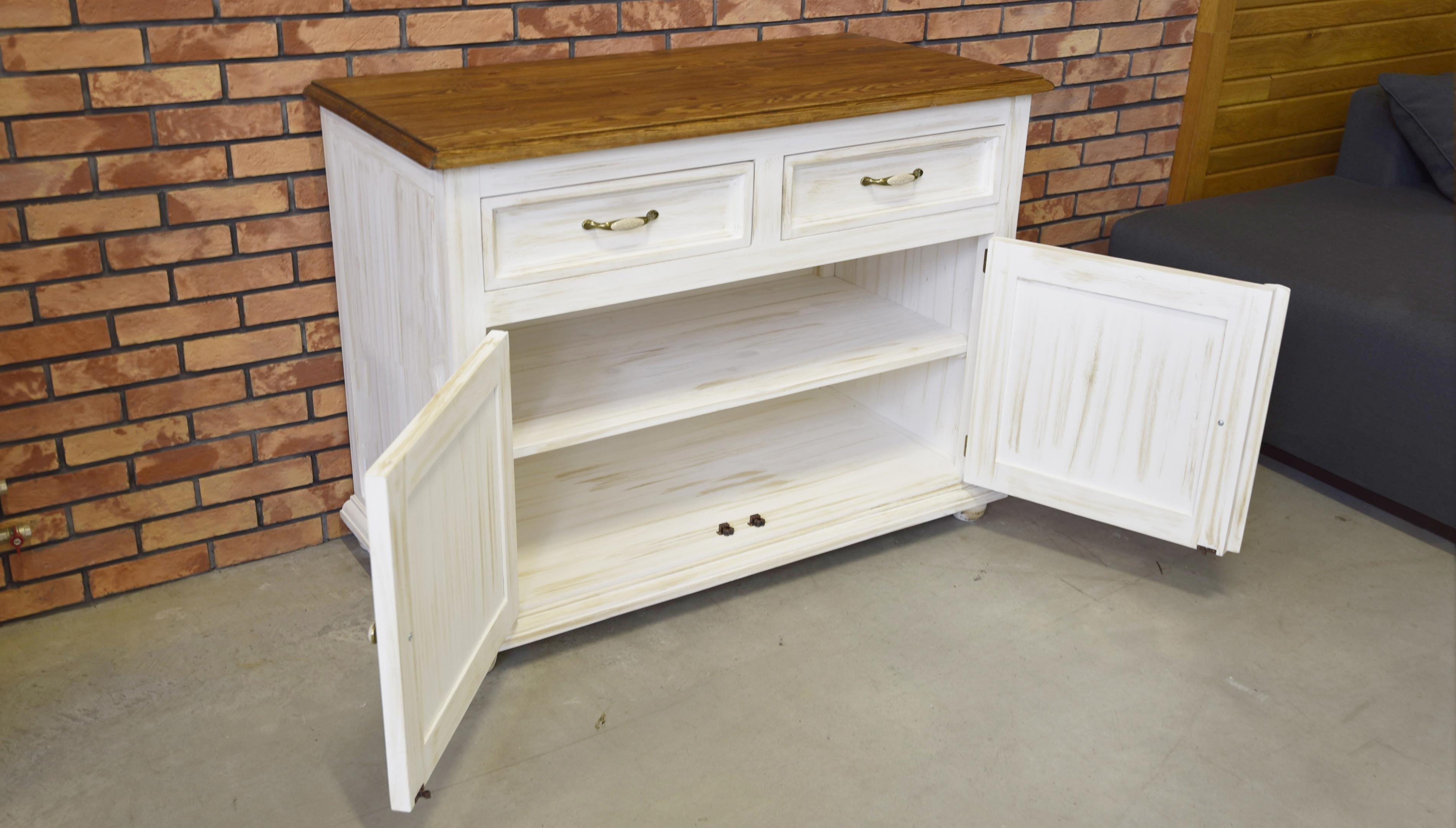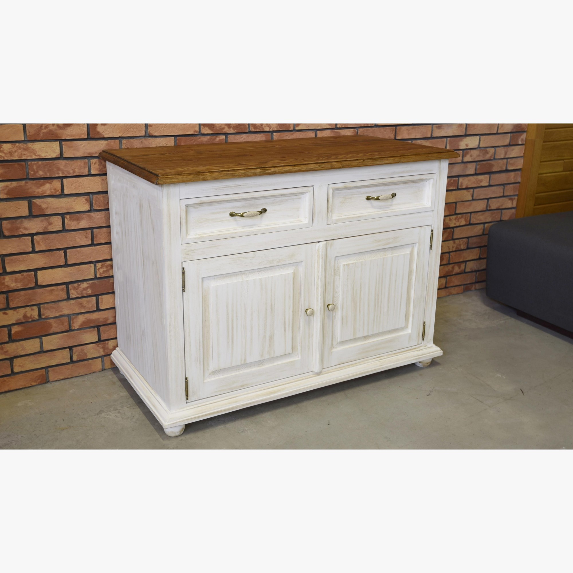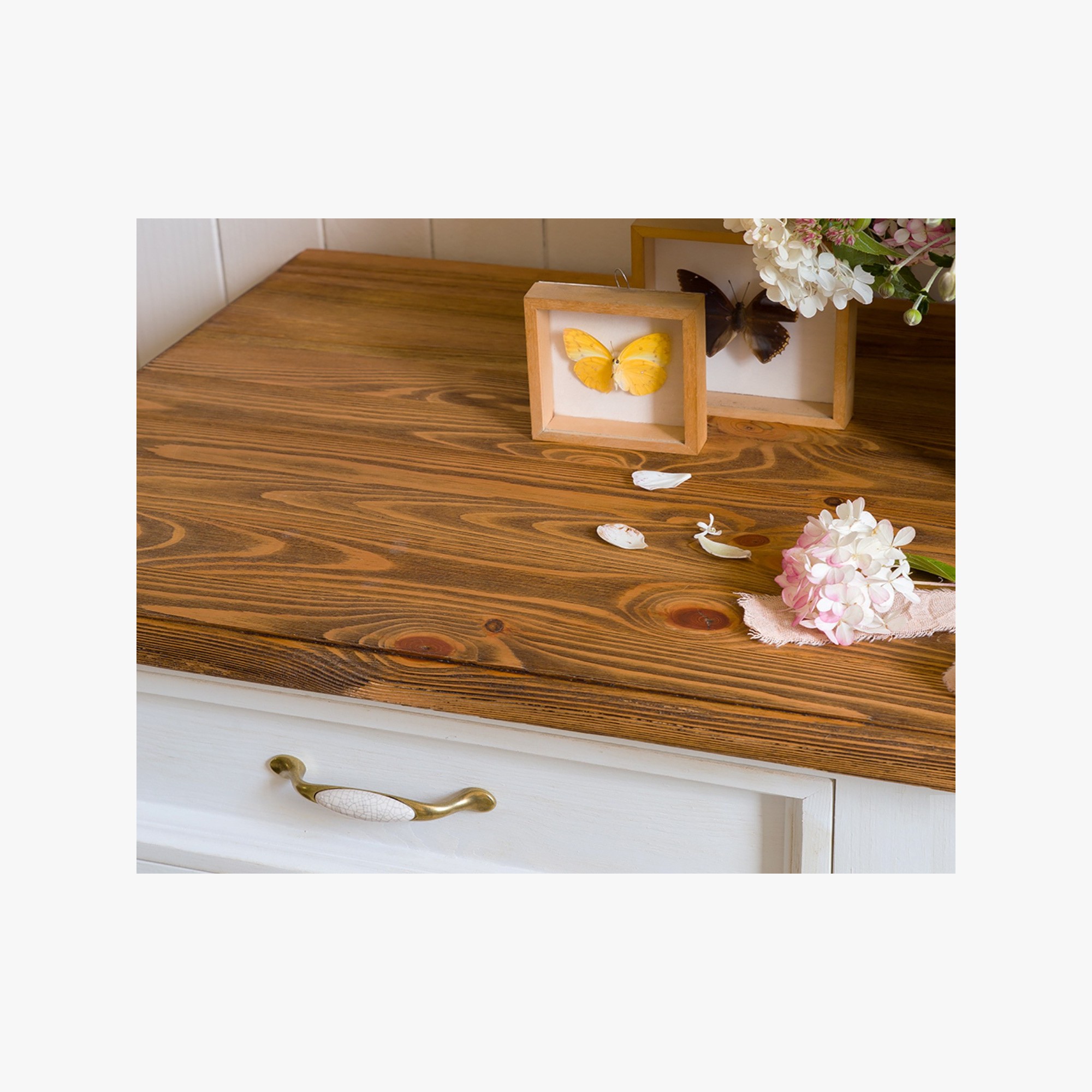 Der Sideboard ist komplett aus massiver Kiefer gefertigt. Es liegt ganz bei Ihnen, ob Sie die klassische weiße Variante bevorzugen, bei der das Holz mit weißer ökologischer Farbe gestrichen wird, oder die Patina-Variante, die mit einer Imitation von Alter und natürlich vergrautem Aussehen besticht. Der Patina-Effekt wird durch die Verwendung von Wachs auf weißem Untergrund erzielt.