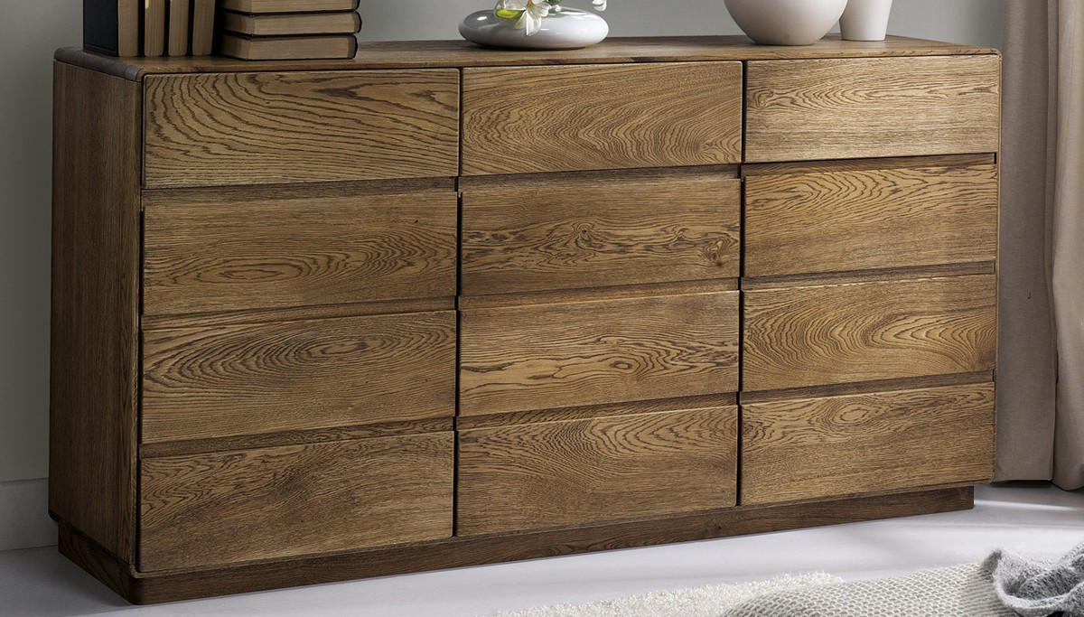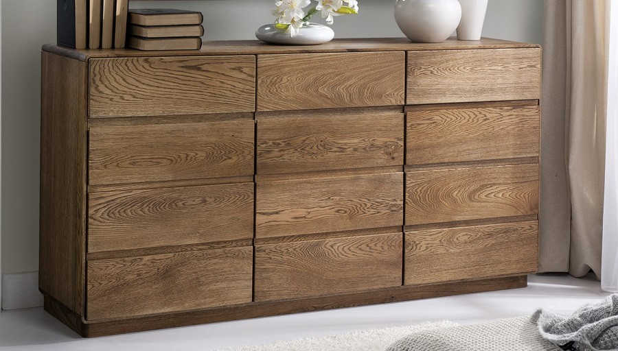 Die luxuriöse Eichenkommode der Helsinki-Kollektion ist aus massiven Holz gefertigt, das oberflächenmäßig speziell und gründlich mittels Bürsten behandelt wurde. Mit speziellen Bürsten wird die so genannte weiche (Frühjahrs-)Holzschicht entfernt und eine Struktur mit hervortretenden, härteren Holzpartien geschaffen, die die Maserung betont. Gerade der härtere Teil des Holzes, der an der Oberfläche verbleibt, verleiht dem Produkt mehr Härte, längere Lebensdauer und einzigartiges Aussehen. Bei jeder Berührung spüren Sie die eindrucksvolle Struktur des Naturholzes. Möbel aus Wild-Eiche verströmen zudem den charakteristischen Duft massiven Holzes, der Ihr Interieur lange an die Atmosphäre eines ursprünglichen Eichenwaldes erinnert.