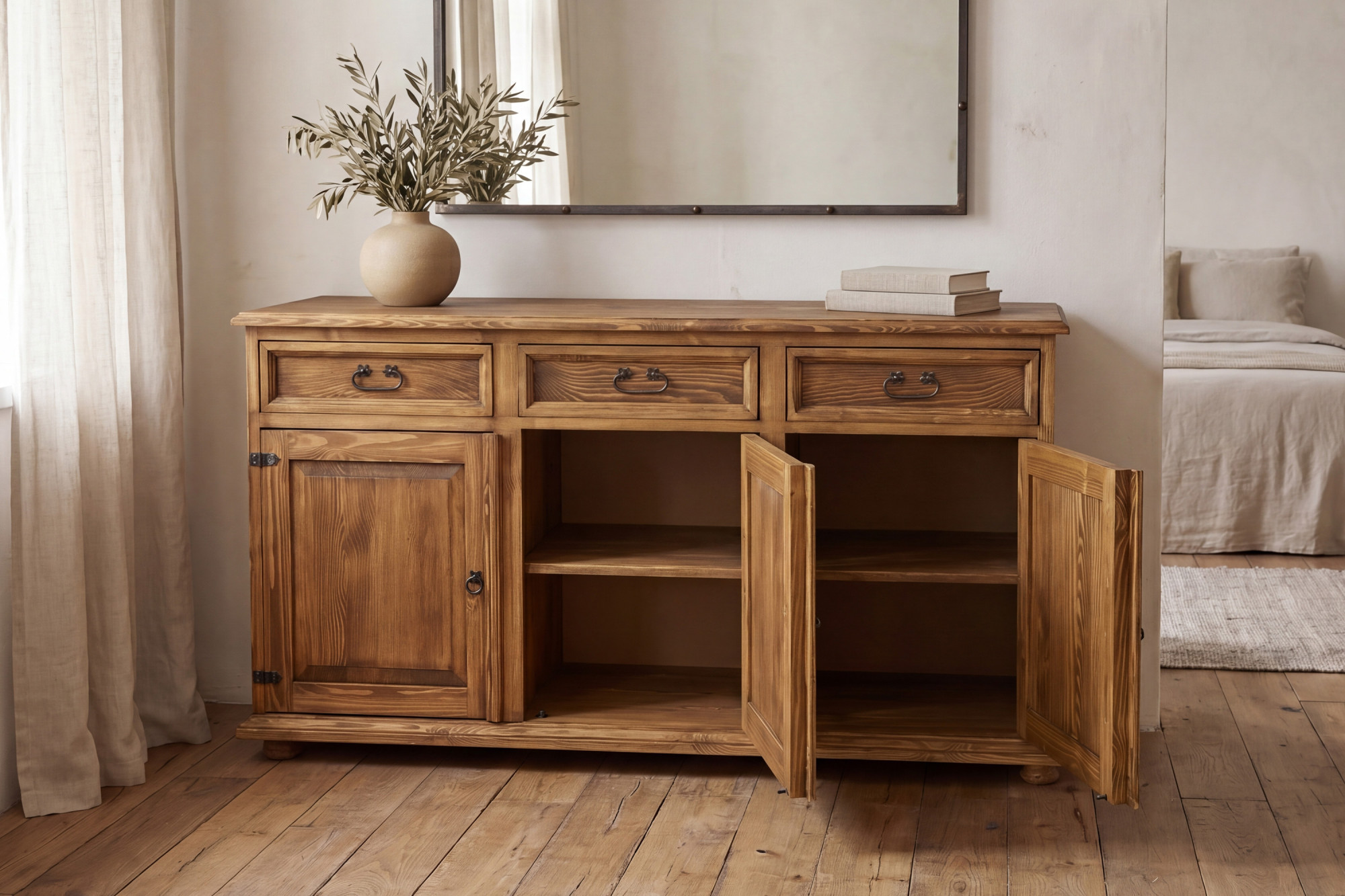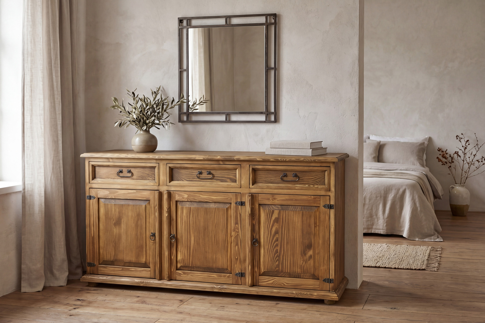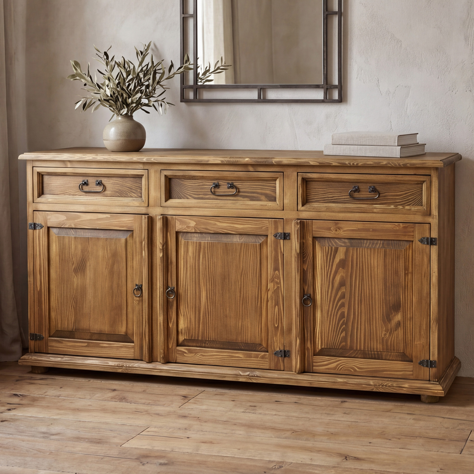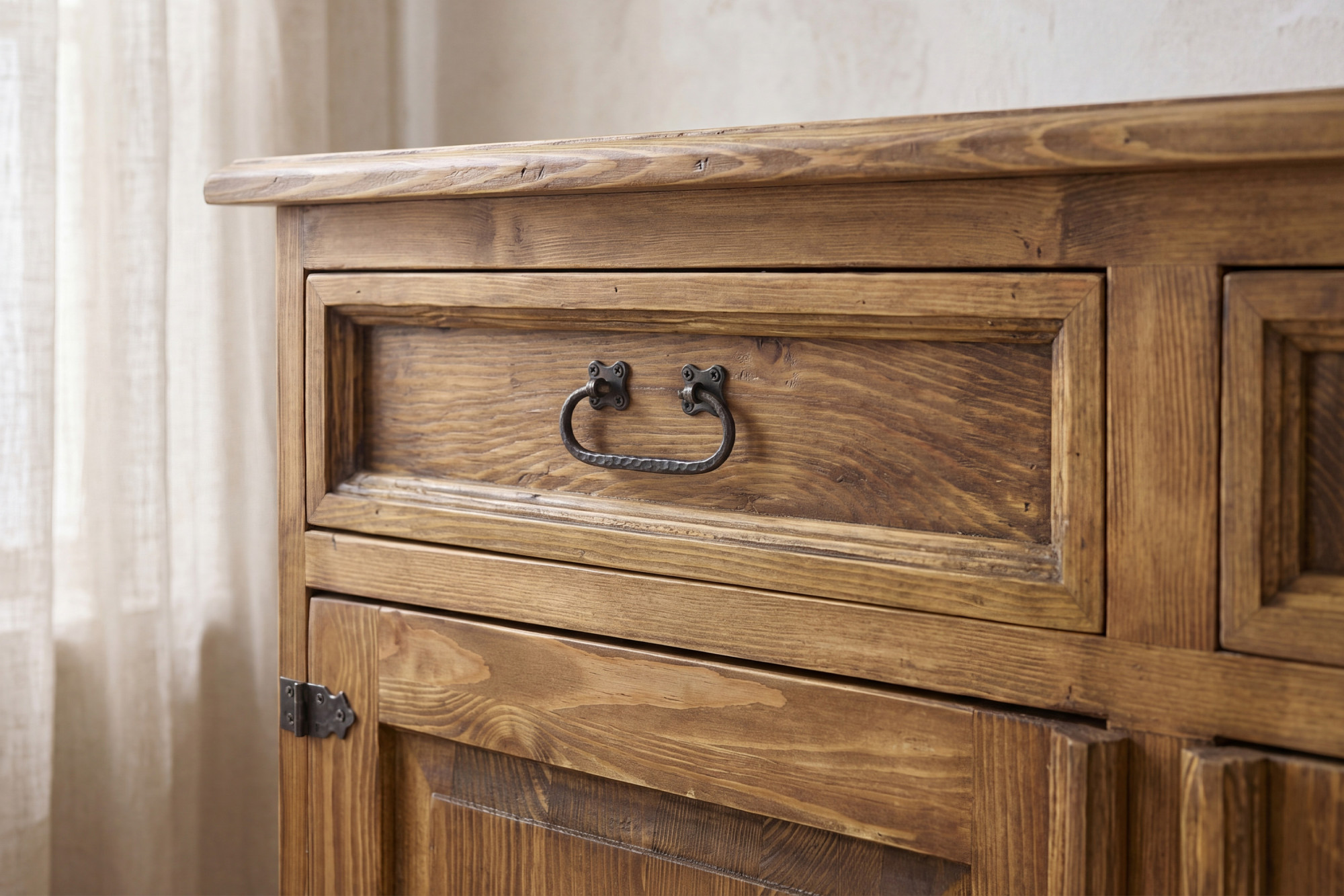 Die Kommode besteht aus massivem Kiefernholz, das für seine Festigkeit, sein natürliches Aussehen und seine lange Lebensdauer geschätzt wird.