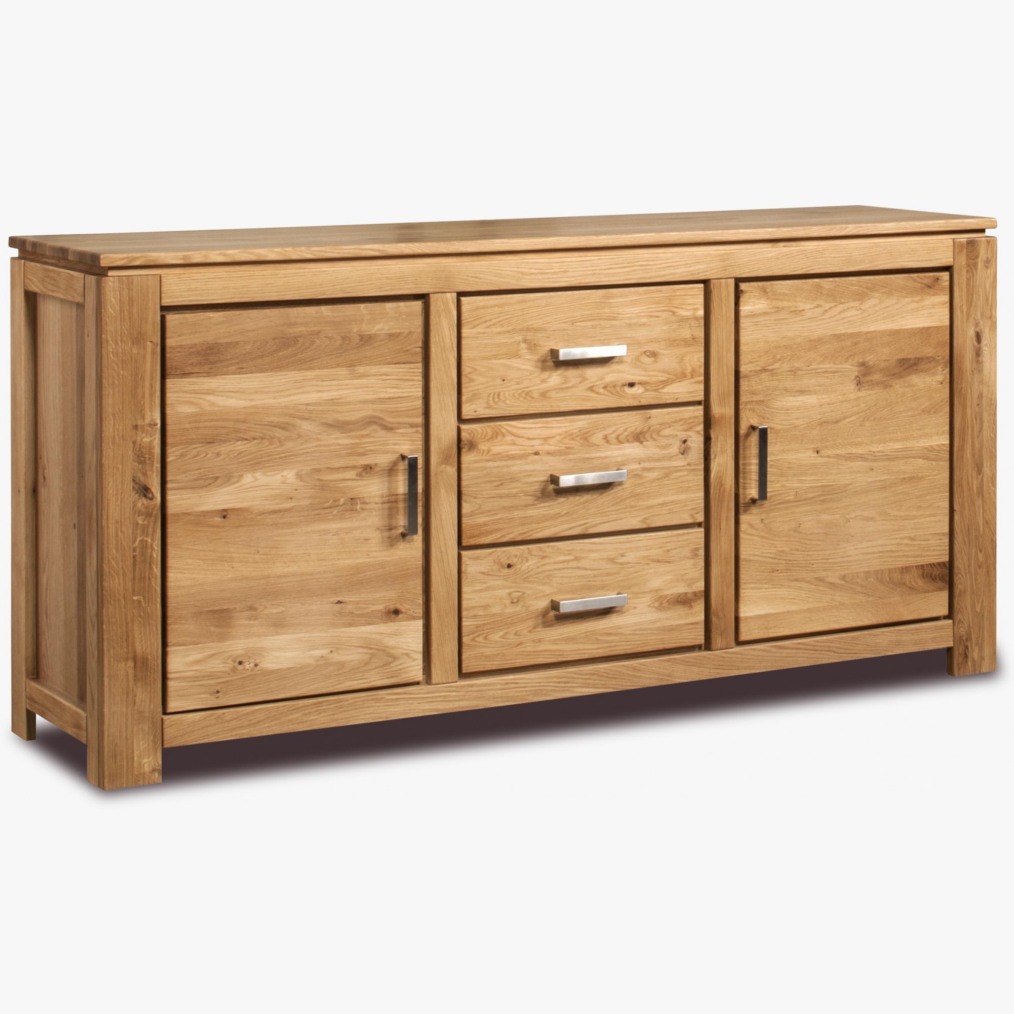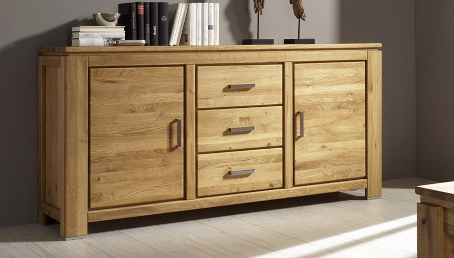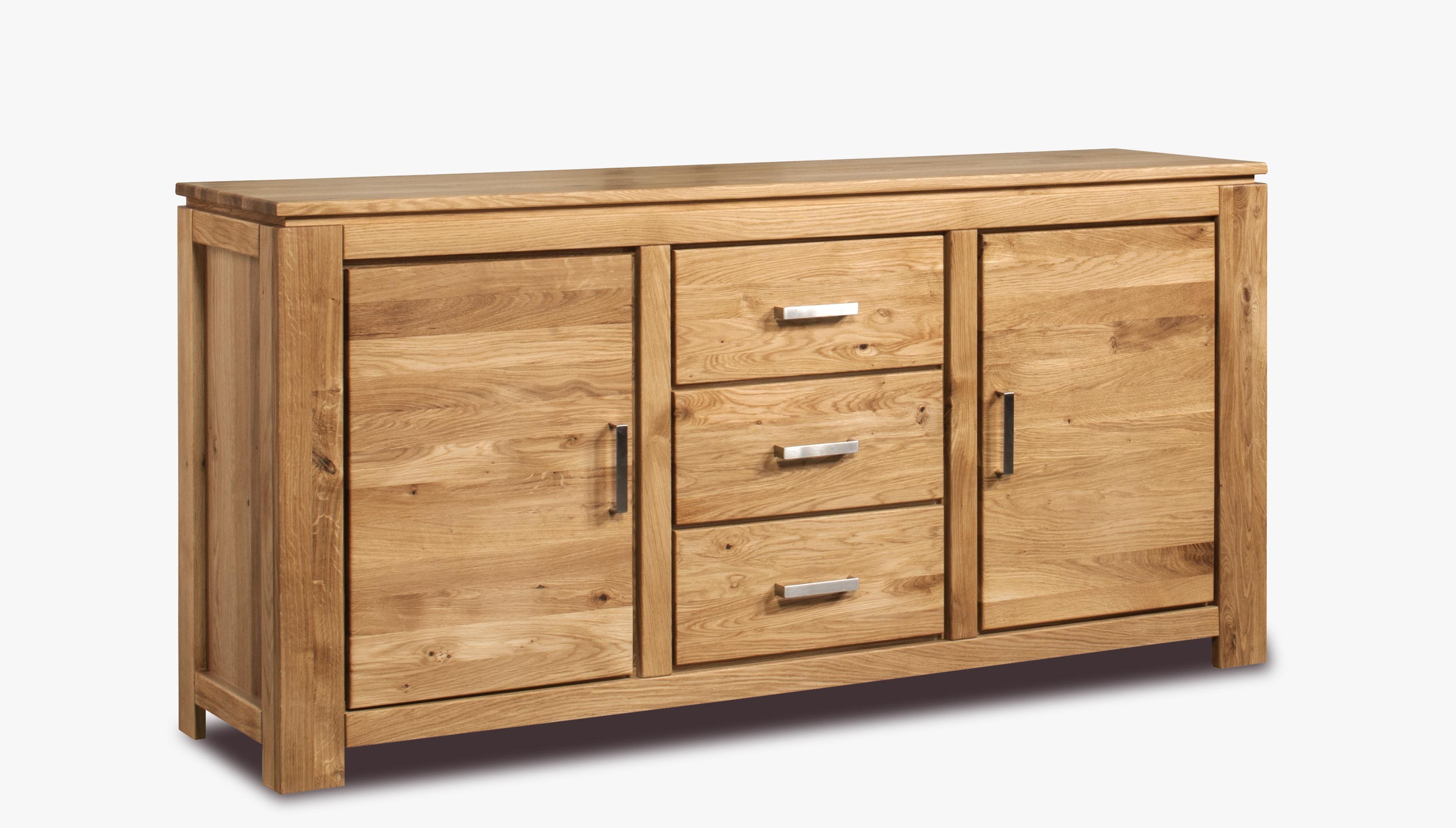 Eiche Kommode hat 3 Schubladen und zwei Seitentüren, die mit einem inneren Regal ausgestattet sind. Schubladen und Türen sind selbsteinziehend. Ein Vorteil sind hochwertige deutsche Beschläge mit hoher Lebensdauer. Die Gesamttiefe der Kommode beträgt bis zu 174 cm.