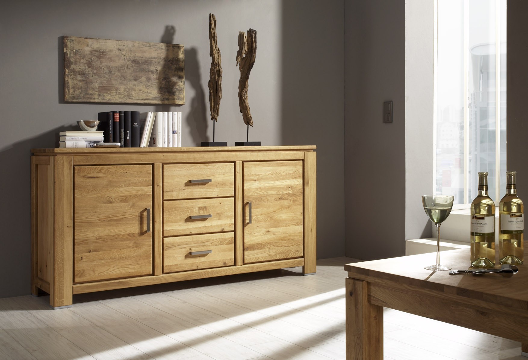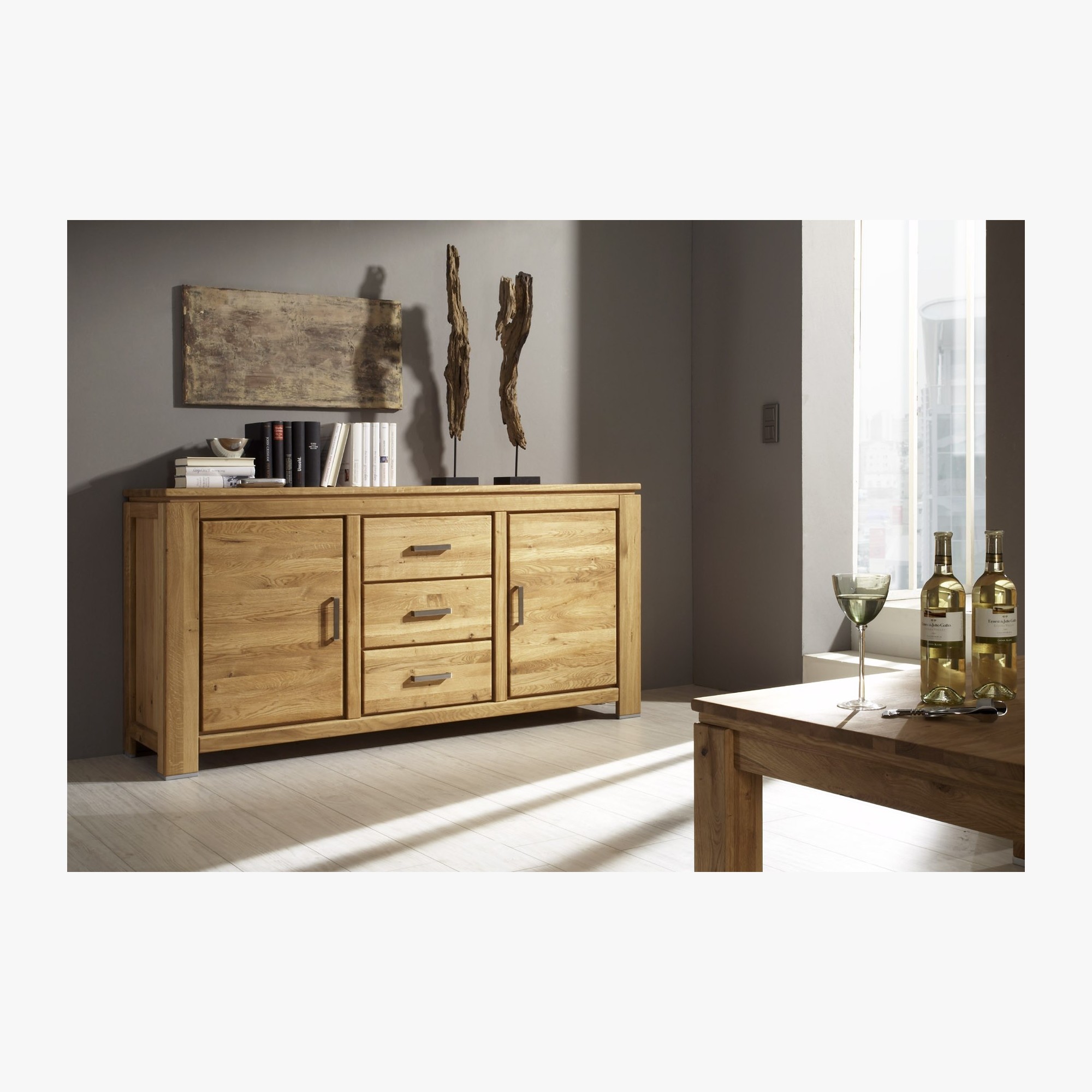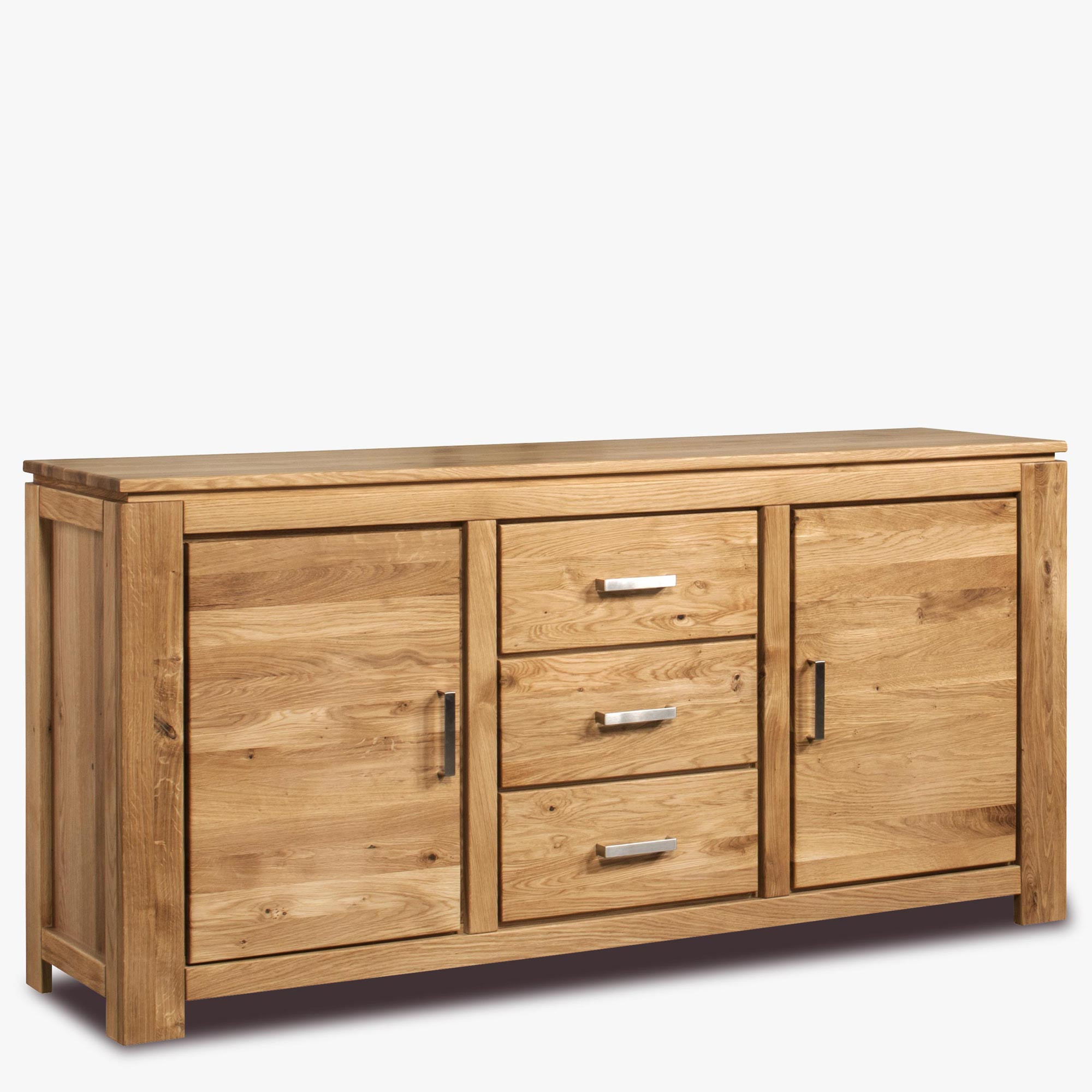 Eiche Kommode hat 3 Schubladen und zwei Seitentüren, die mit einem inneren Regal ausgestattet sind. Schubladen und Türen sind selbsteinziehend. Ein Vorteil sind hochwertige deutsche Beschläge mit hoher Lebensdauer. Die Gesamttiefe der Kommode beträgt bis zu 174 cm.
