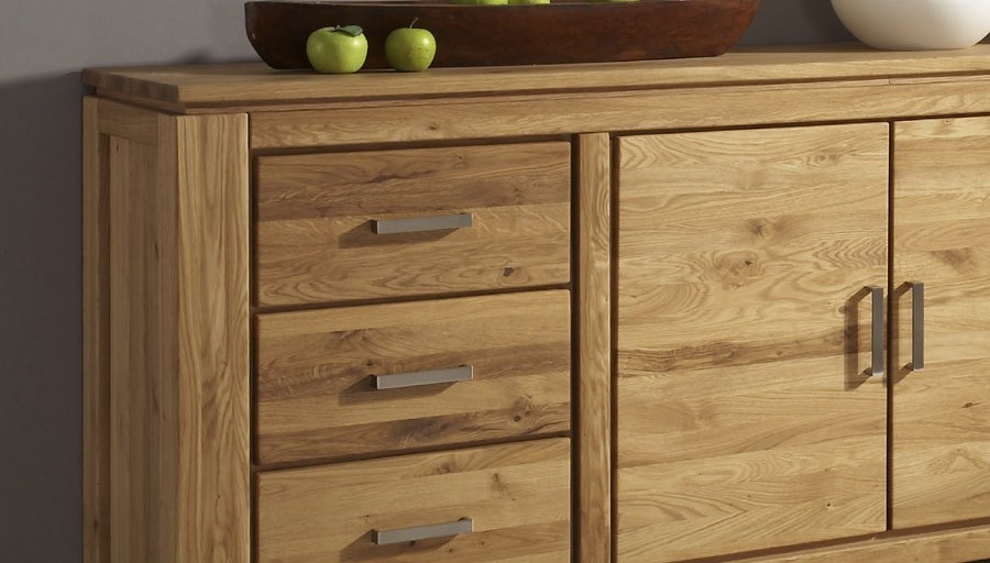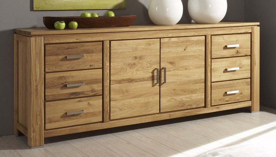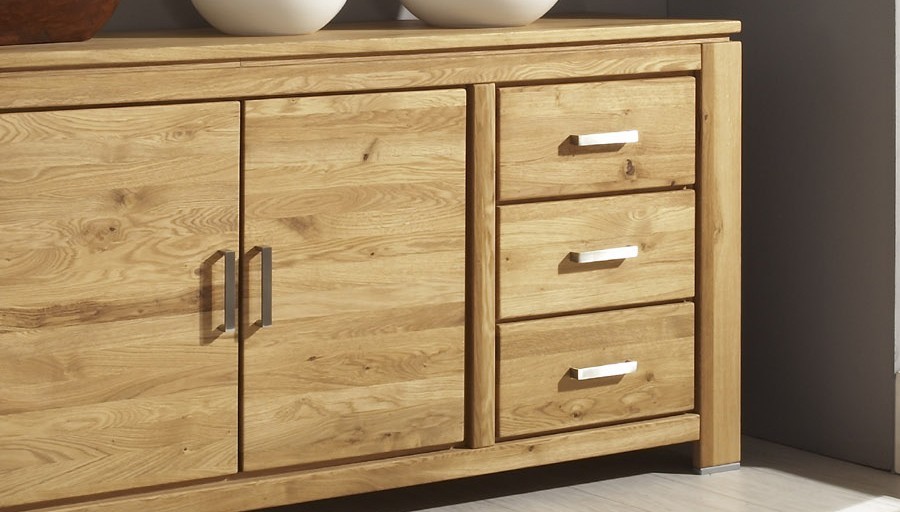 Eichenkommode hat 6 Schubladen und in der mittleren Kommodenpartie Türen mit einem inneren Regal. Die Schubladen und Türen sind selbsteinziehend. Vorteilhaft sind die hochwertigen deutschen Beschläge mit langer Lebensdauer. Die Gesamtbreite der Kommode beträgt bis zu 219 cm.