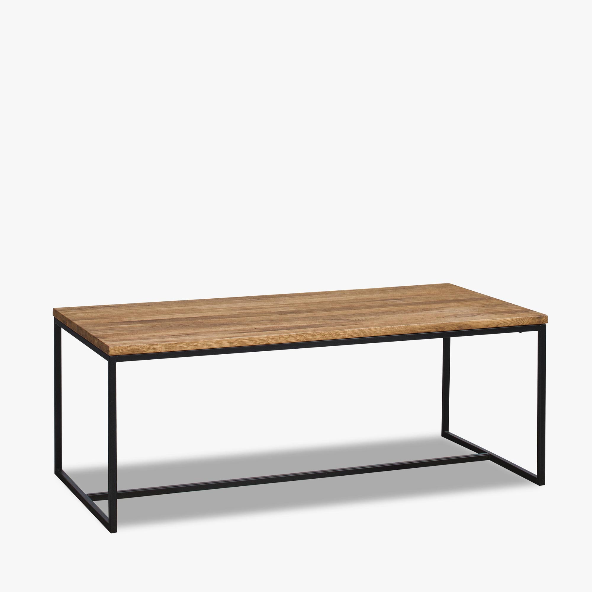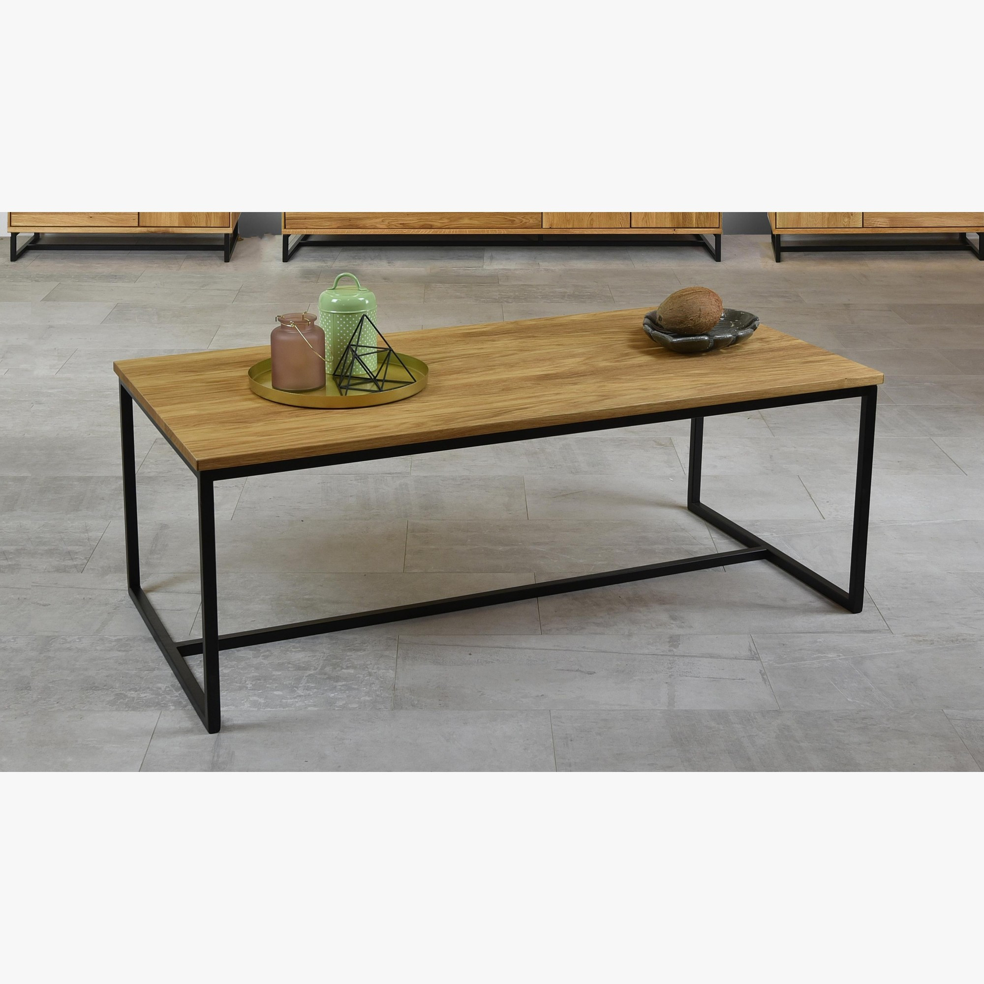 Moderner Kaffeetisch im Industriestil, bei dem das Gestell aus schwarzen Metallbeinen besteht. Die obere Tischplatte ist aus originaler natürlicher Eichenfurnier gefertigt, wobei jedes Stück authentisch und einzigartig ist. Der Tisch ist mit einer öl-wachsbeschichteten Oberfläche behandelt. Zur Pflege verwenden Sie bitte Produkte, die für öl-wachsbeschichtete Möbel geeignet sind. Die Möbel werden mit modernsten CNC-Maschinen hergestellt, was höchste Qualität garantiert. Sehen Sie alle Arten und Modelle der Kollektion Lagos an.