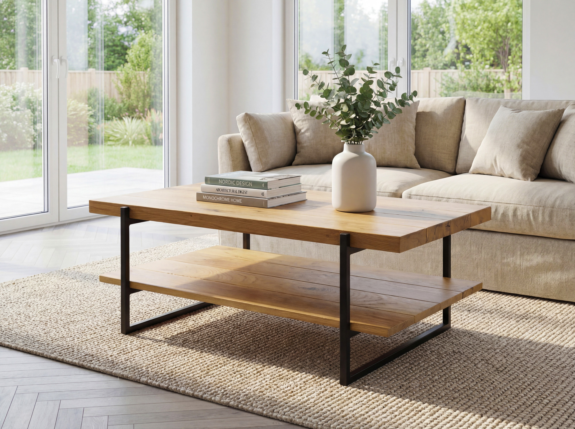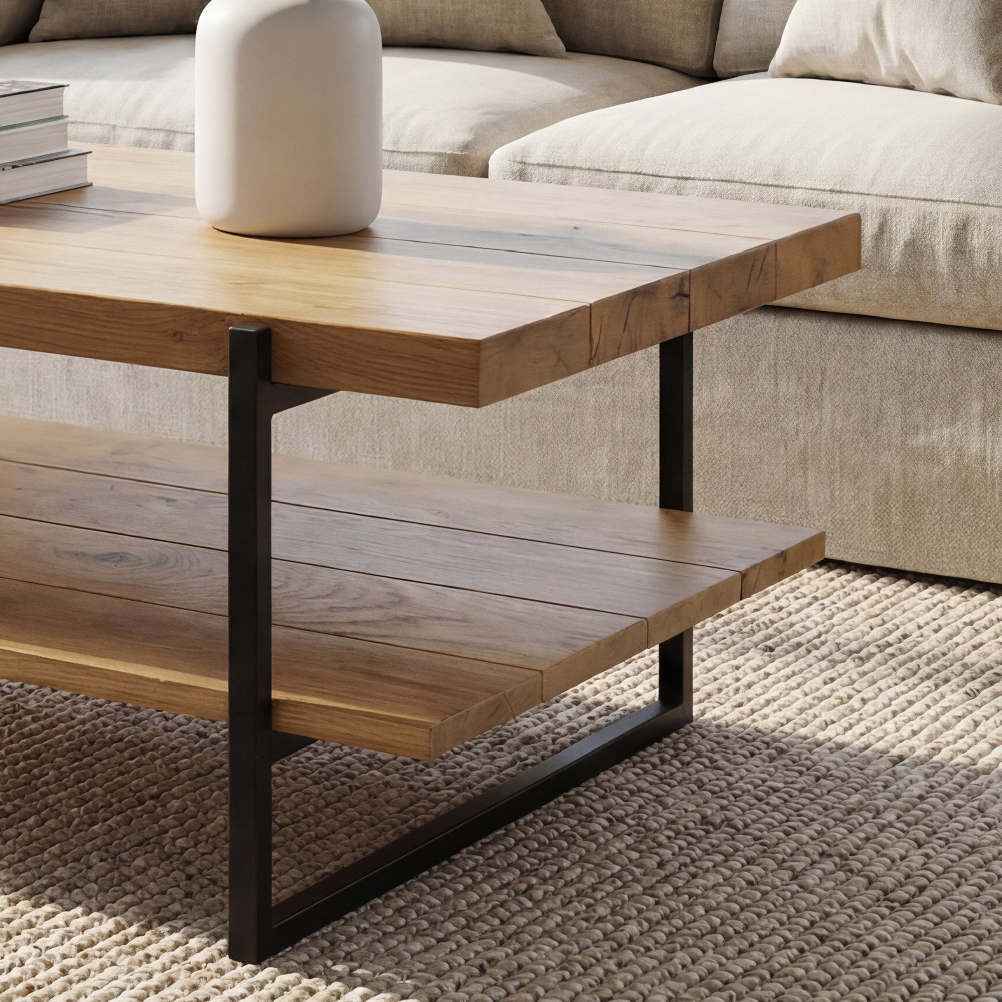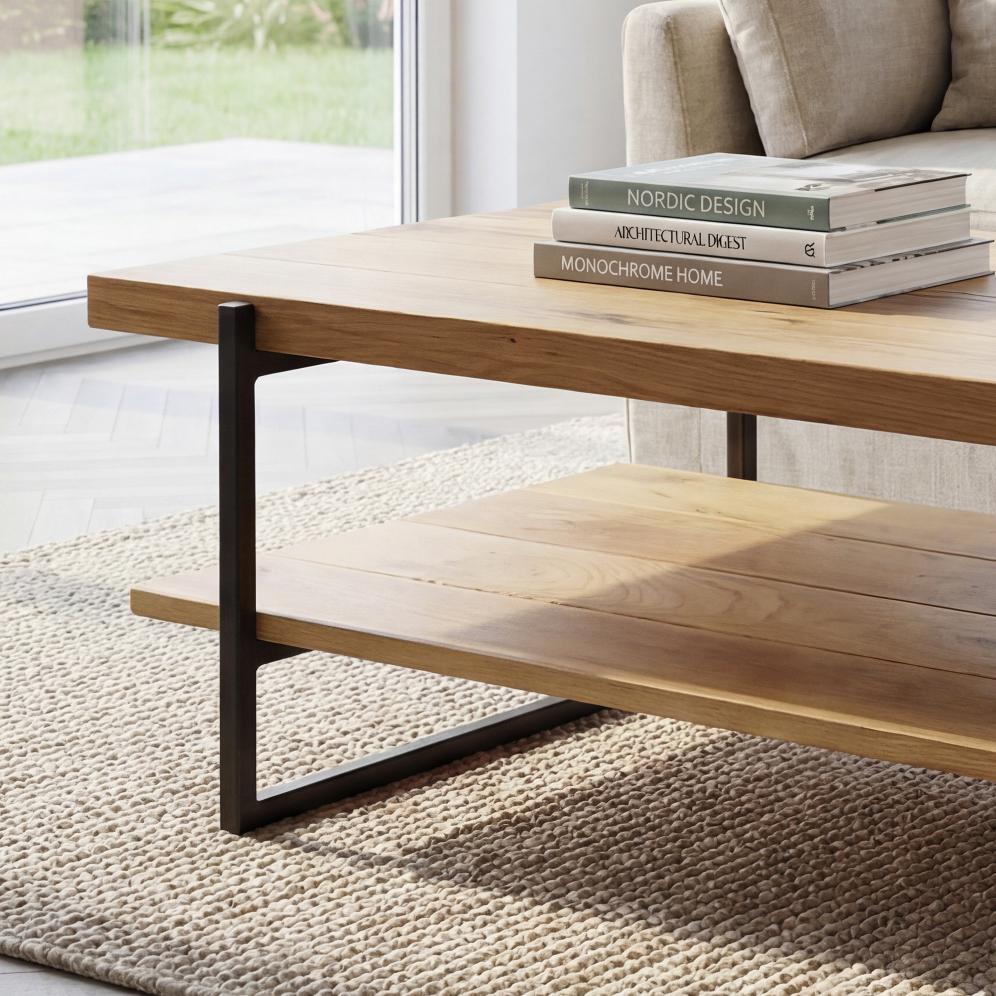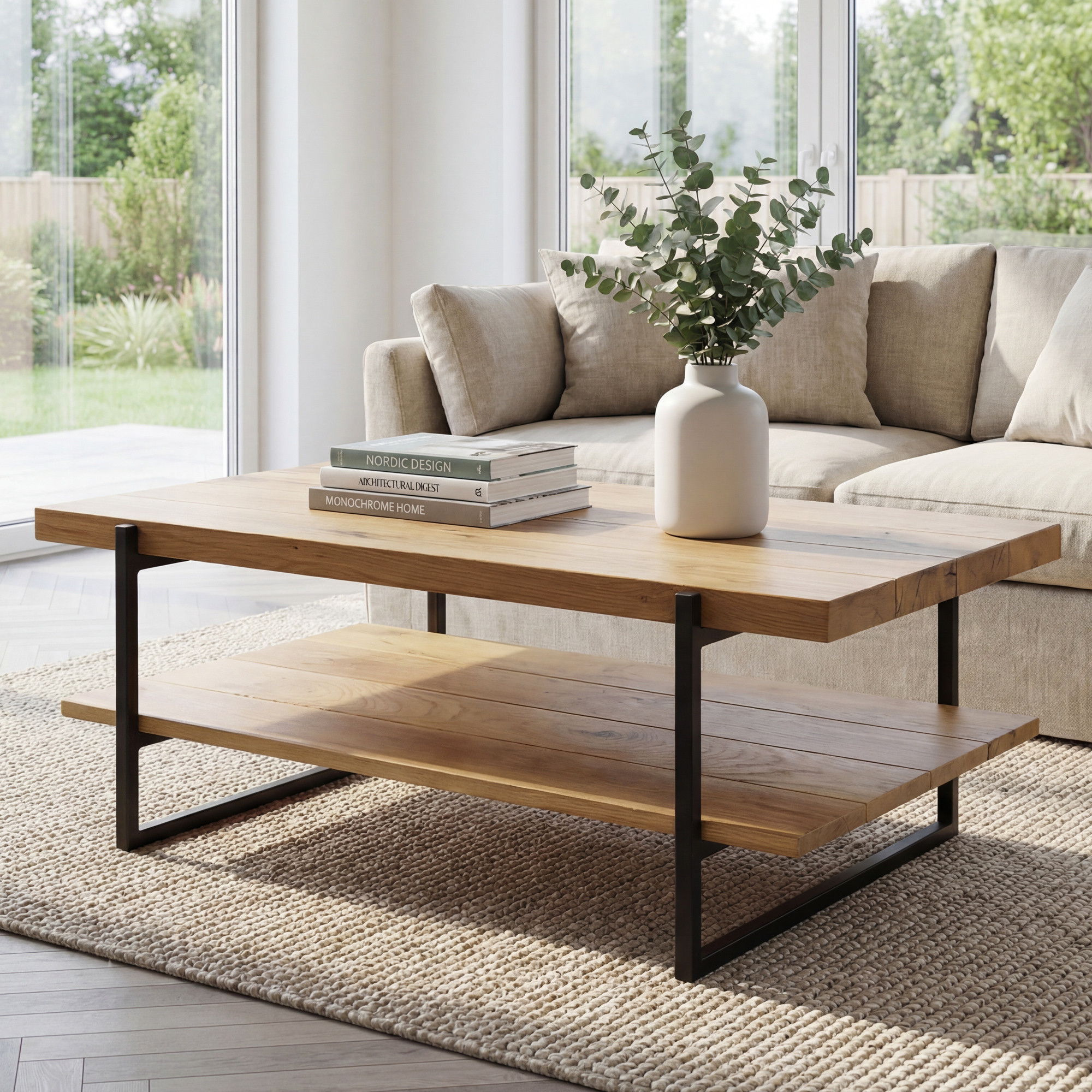 Massiver Couchtisch aus Eiche mit Regal, naturholz