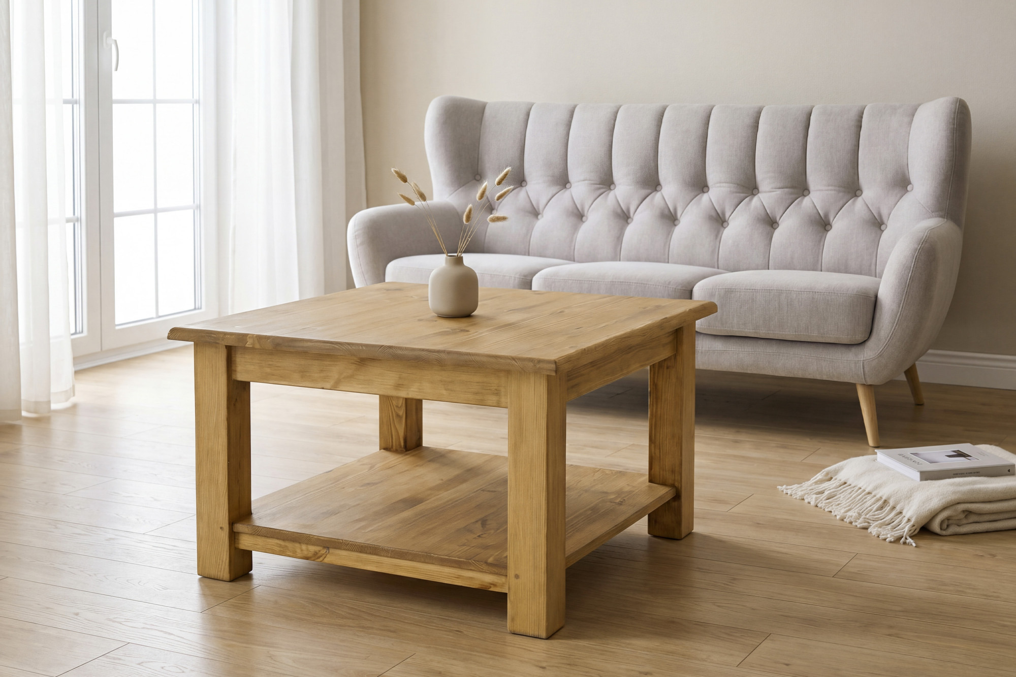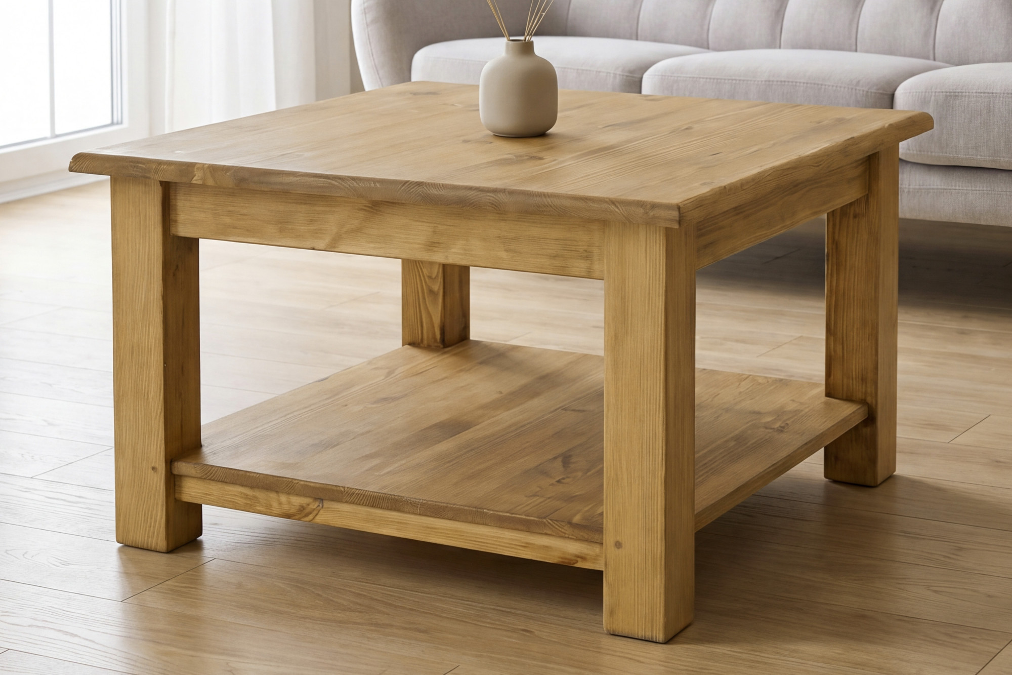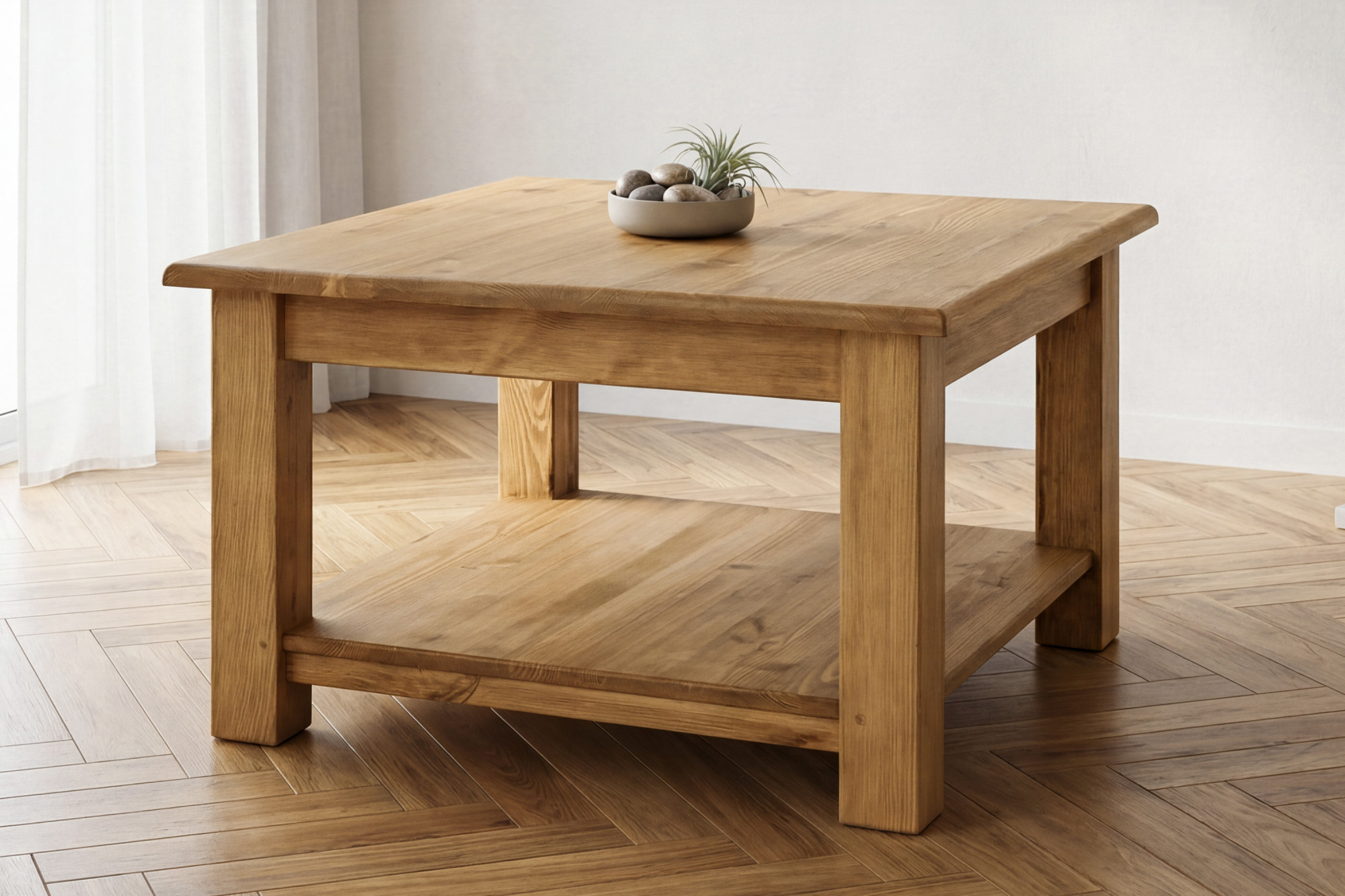 Entdecken Sie den Zauber ehrlichen Handwerks mit dem rustikalen Couchtisch im französischen Landhausstil, der Wärme, Gemütlichkeit und zeitlose Eleganz in Ihr Interieur bringt. Dieser Beistelltisch aus massivem Kiefernholz besticht auf den ersten Blick durch eine schöne Maserung des Naturholzes, präzise Verarbeitung und authentisches rustikales Aussehen. Dank seines universellen Designs passt er perfekt ins Wohnzimmer, in die Ferienhütte, in ländlich gestaltete Räume sowie in stilvolle Apartments.